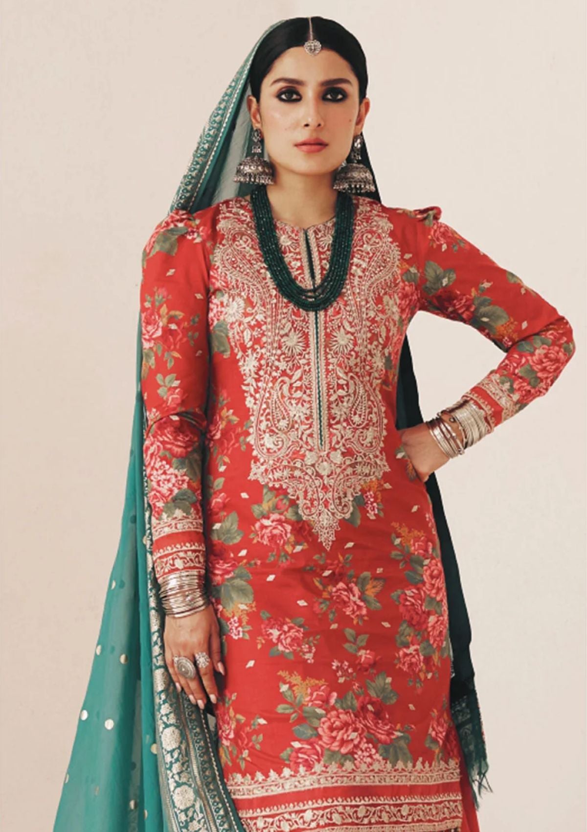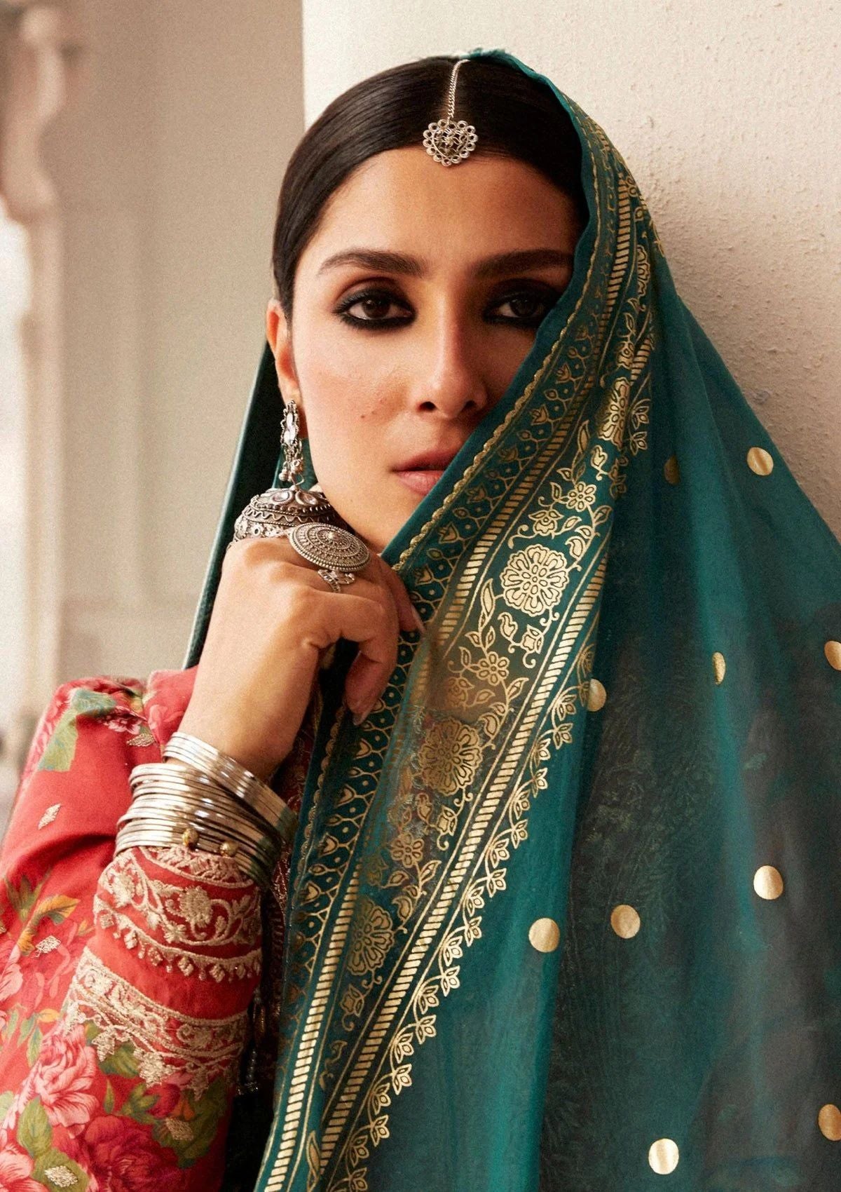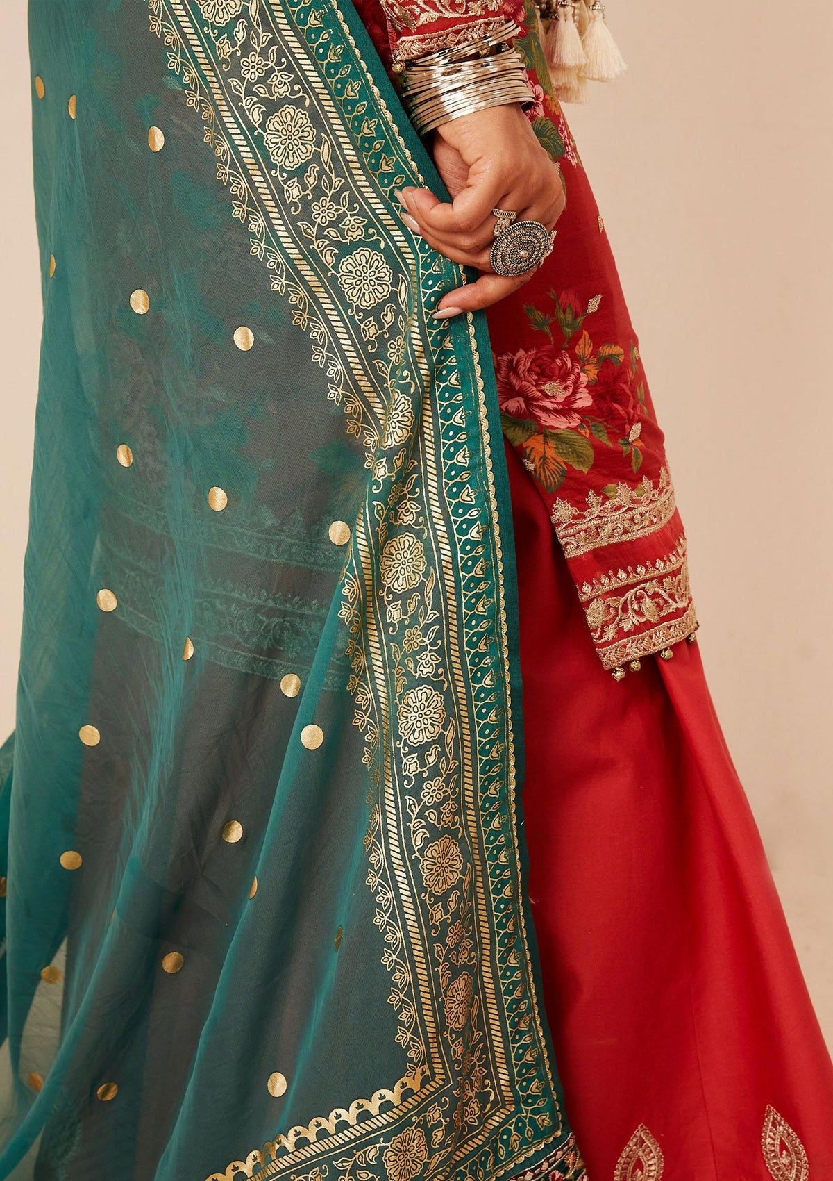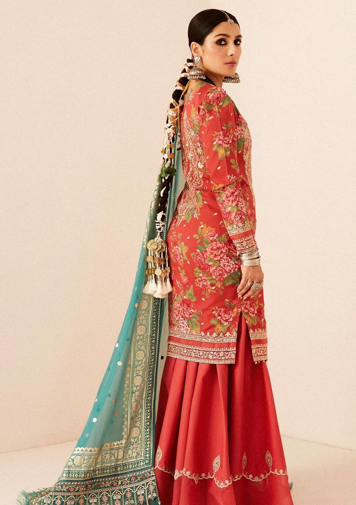 Phool Kari reveals our signature floral design to perfection. It is harmoniously paired with a vibrant coloured butter silk dupatta adorned in a foil print with scallop embroidered hem pants and tilla embroidery all over the shirt.