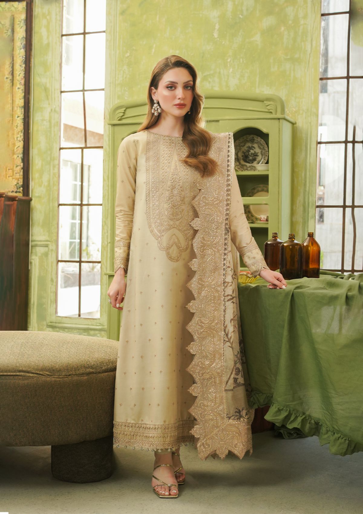 Rendered in opulent fawn ‘Alisa’ showcases exquisite tone-on-tone embroideries employing intricate threadwork accented with silver tinsels. The scalloped neckline and ethereal tribal motifs cascading over the diaphanous lawn canvas imbue a sense of feminine elegance into this sophisticated ensemble, Paired with an exquisite printed Khaadi net dupatta adorned with a blossoming embroidery, this ensemble is a true ode to femininity and romance. A collector’s reverie, it exudes a regal, timeless, and luxurious allure, inviting one to bask in its floral embrace.