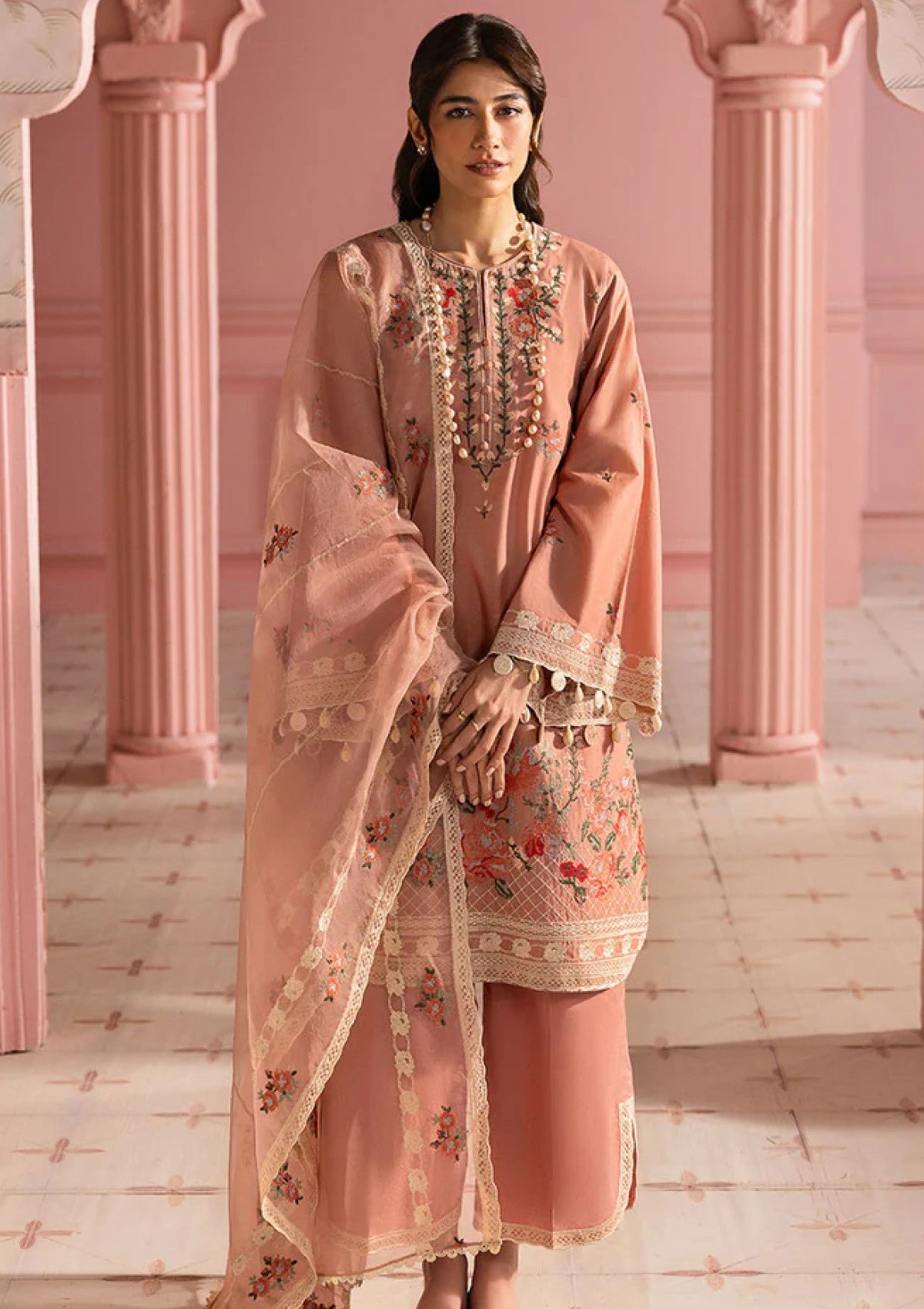 This ROSE QUARTZ-3PC PRINTED LAWN SUIT is crafted with expert precision and attention to detail. The lawn embroidered front and sleeves add an elegant touch, while the dyed back provides comfort and versatility. The cambric dyed trouser with 60" embroidered patti adds a sophisticated element. Complete the look with the organza embroidered dupatta for a truly stunning ensemble.