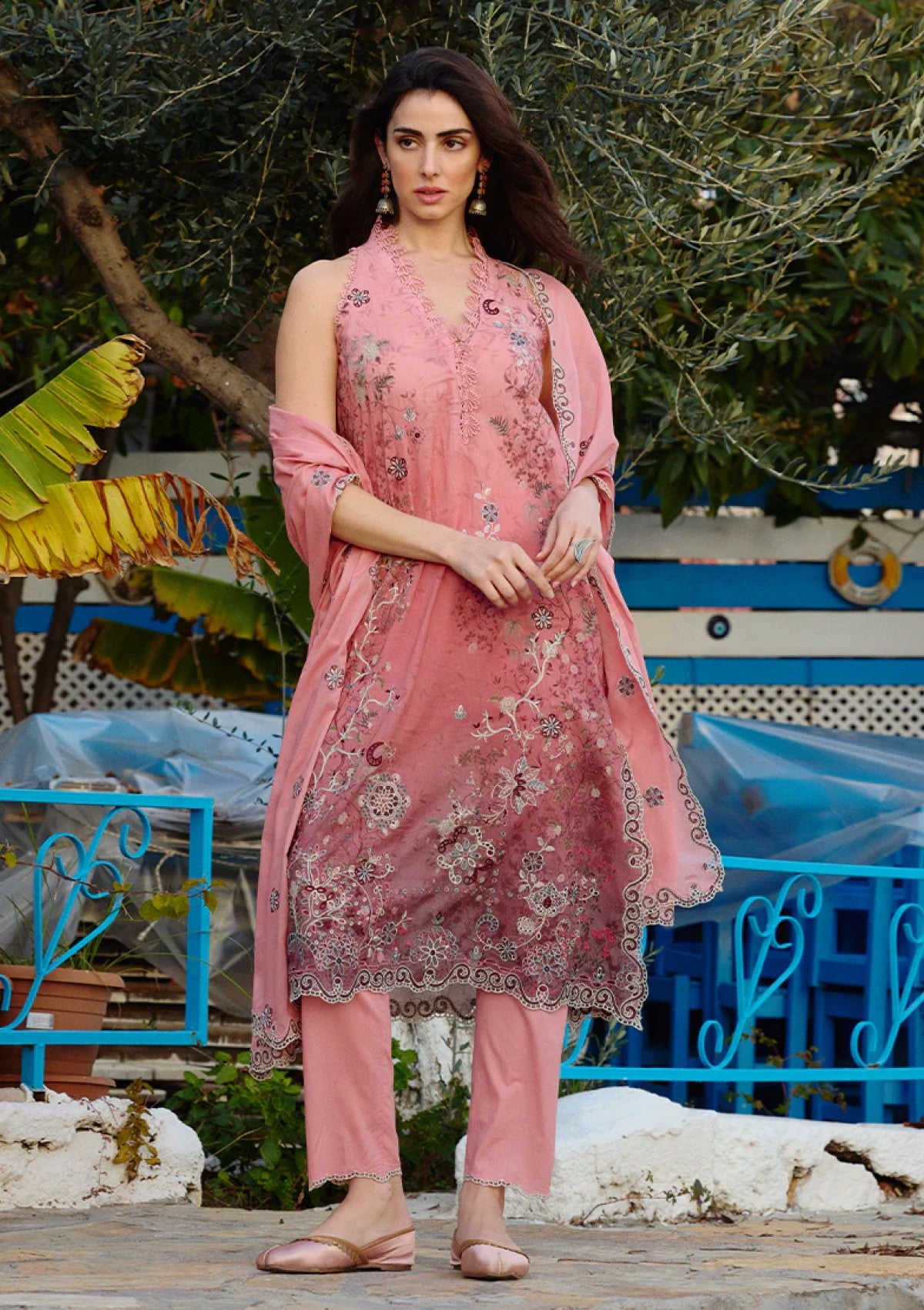 Sorina in Salmon Pink from our Spring Printkari '25 Collection. A printed cutwork embroidered cotton 3-piece outfit paired with dyed voile embroidered dupatta.