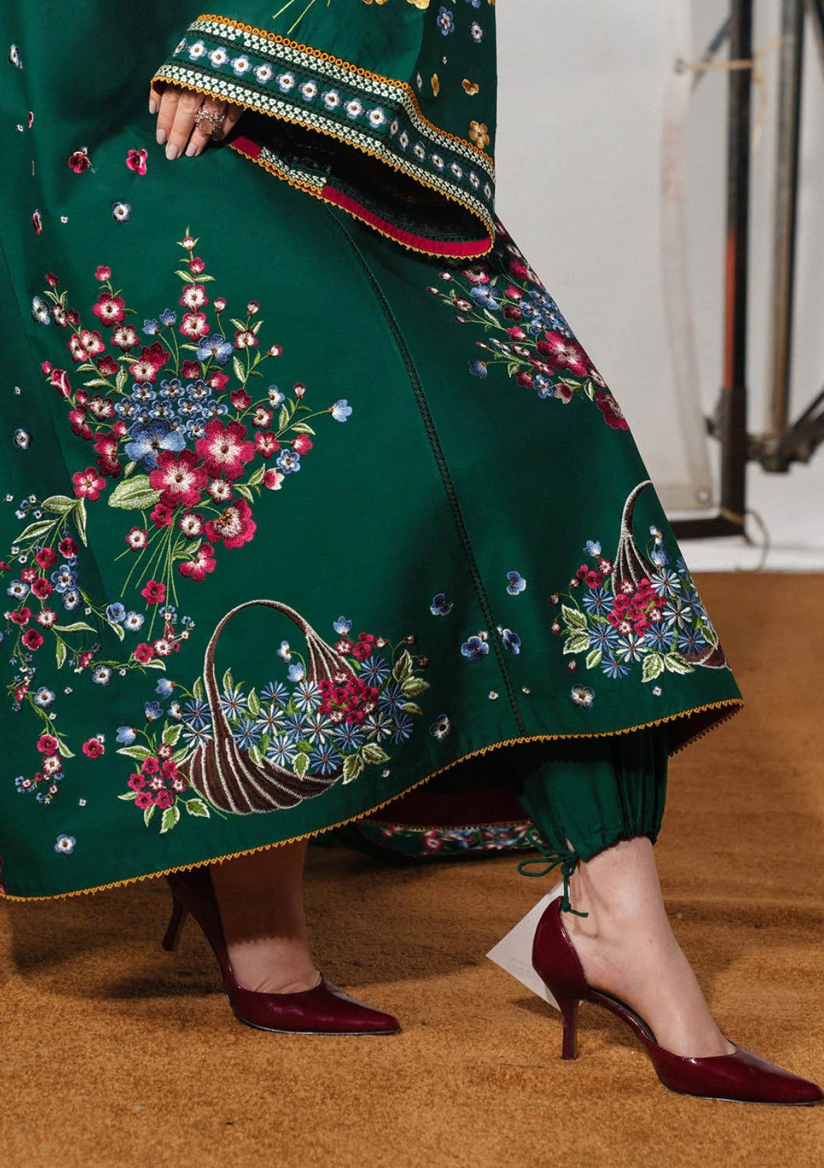 A long green shirt adorned with multicolor floral embroidery is elegantly complemented by bell sleeves featuring matching embroidered borders, creating a refined and graceful silhouette. The ensemble is paired with green dyed harem pants that offer fluidity and comfort, while a multicolor floral-embroidered chiffon dupatta adds a delicate, sophisticated finishing touch.
