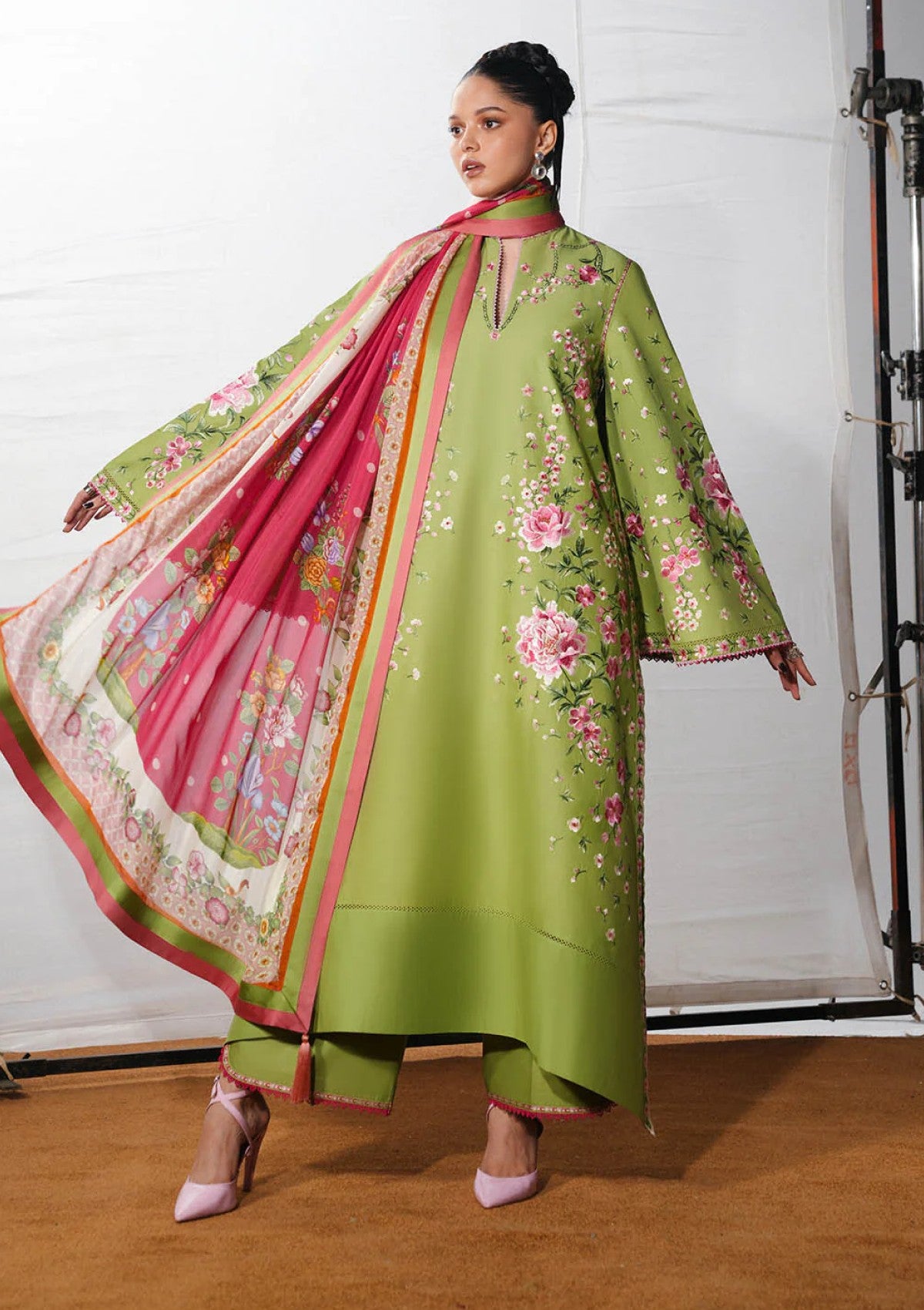 A long mint green shirt adorned with delicate floral embroidery and structured panels is complemented by matching embroidered bell sleeves, creating an elegant and graceful silhouette. The ensemble is paired with mint green dyed culottes featuring embroidered borders, while a digital printed silk dupatta completes the look with a sophisticated, timeless finish.