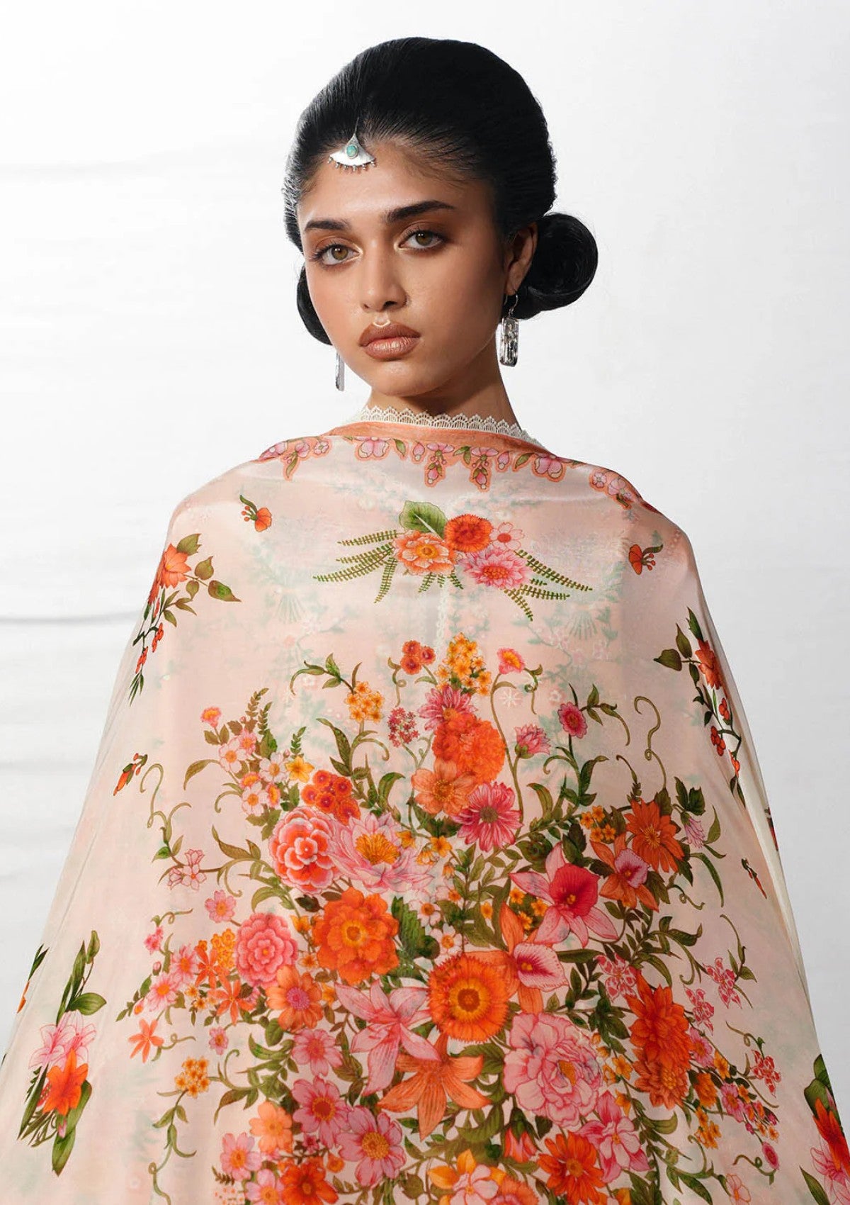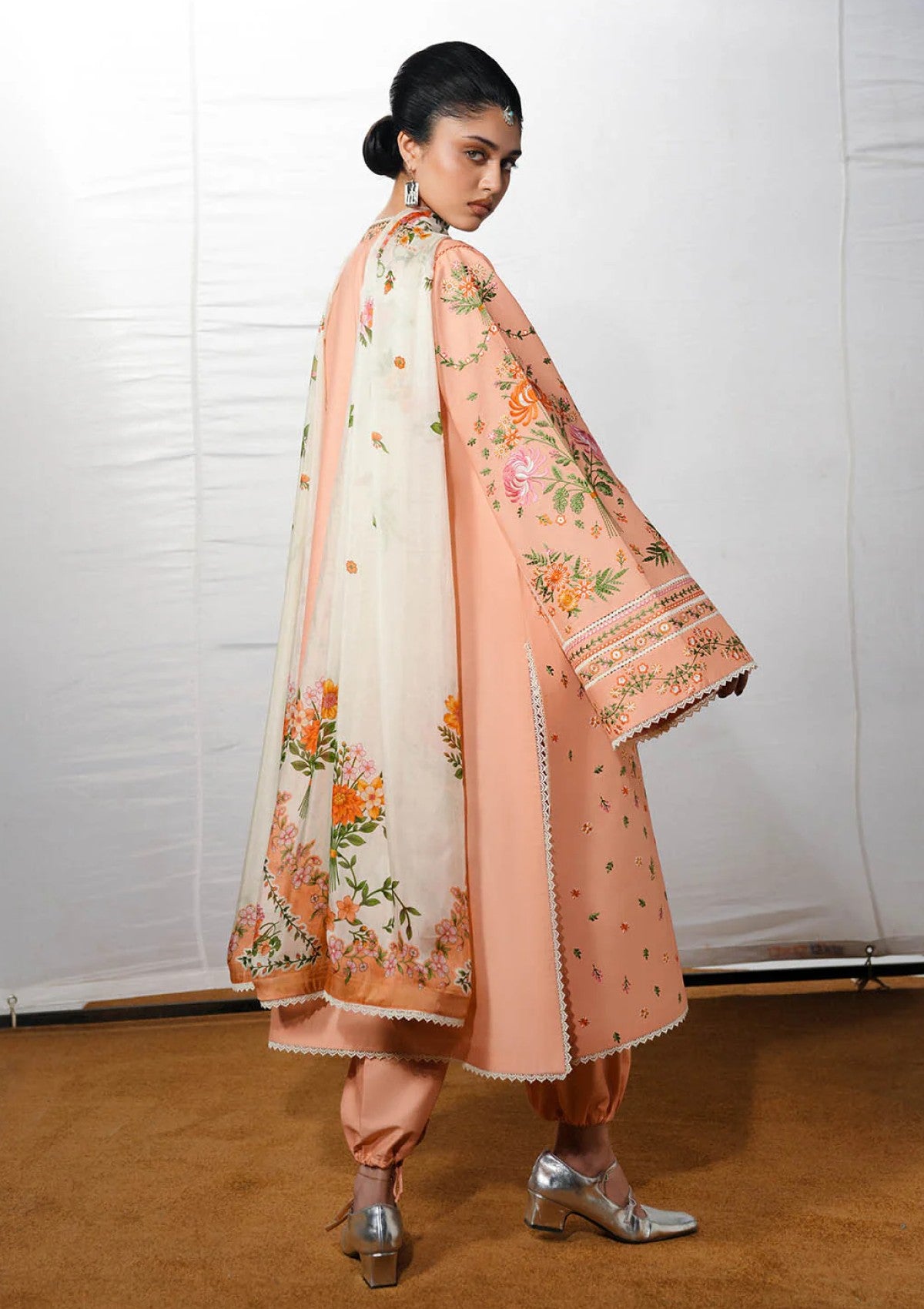 A long peach shirt adorned with multicolor floral embroidery is elegantly complemented by bell sleeves featuring matching floral-embroidered borders, creating a refined and graceful silhouette. The ensemble is paired with peach dyed harem pants that add fluidity and ease, while a digital printed silk dupatta brings a contemporary and sophisticated finish.