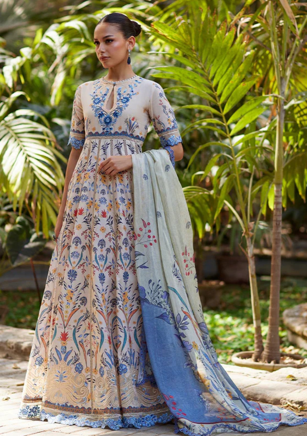 Look etheral in this Ivory signature printed pishwaas. The bodice of the pishwaas features bold floral embroideries that match Mina Hasan's signature print. The lehnga features floral watercolor florals throughout all the kalis, and embroidered details. The outfit is completed with a matching signature Mina Hasan printed dupatta and lawn pants. Fabric for full sleeves is provided in the box. Dupatta and kali laces are not included.
