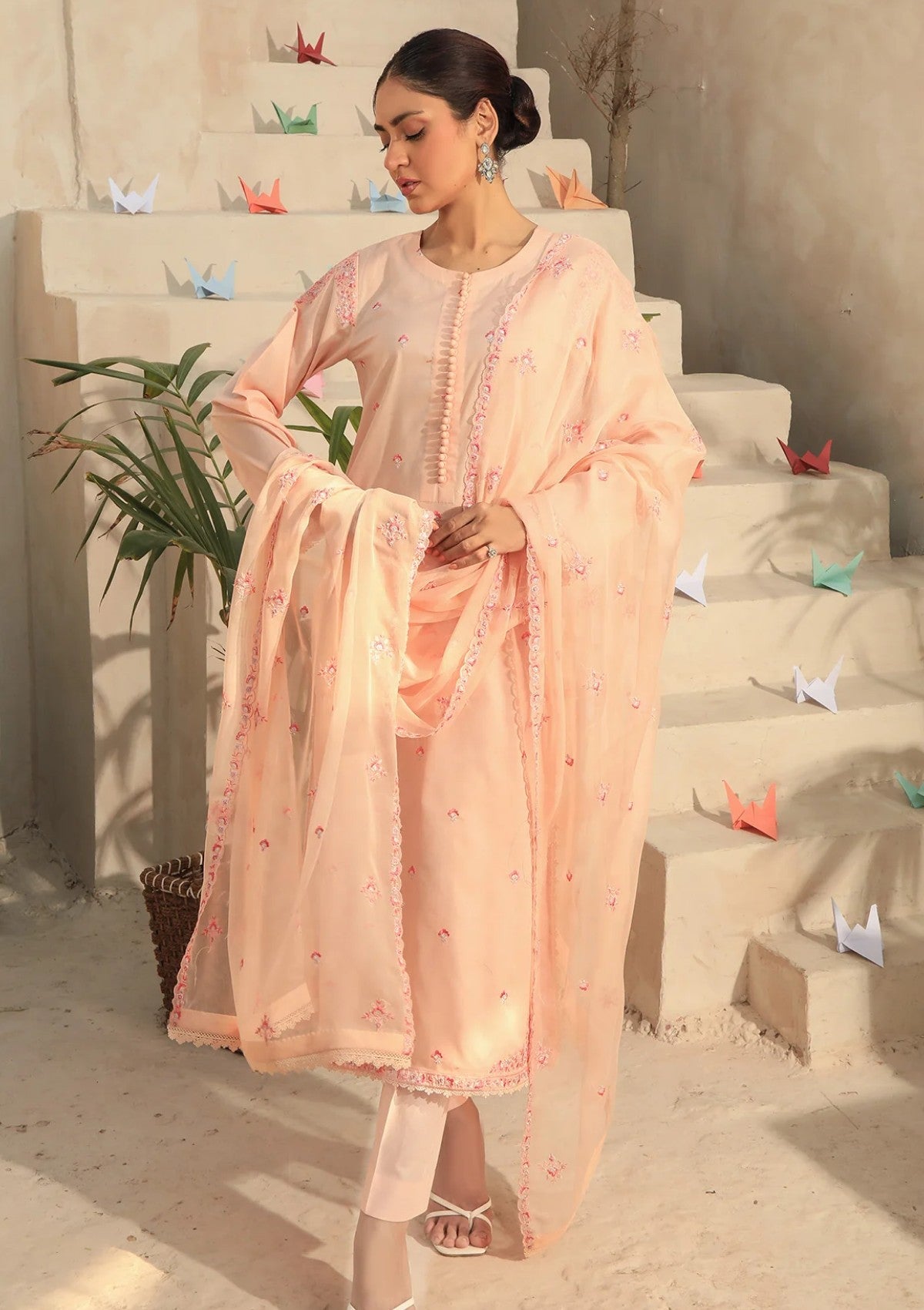 This 3-piece embroidered lawn outfit features a detailed front with double-sided borders and matching embroidered bunches for the shirt and sleeves. It comes with a plain lawn back, sleeves, and comfortable lawn trousers. The look is completed with an embroidered chiffon dupatta finished with lace, offering a simple yet elegant design perfect for everyday wear.