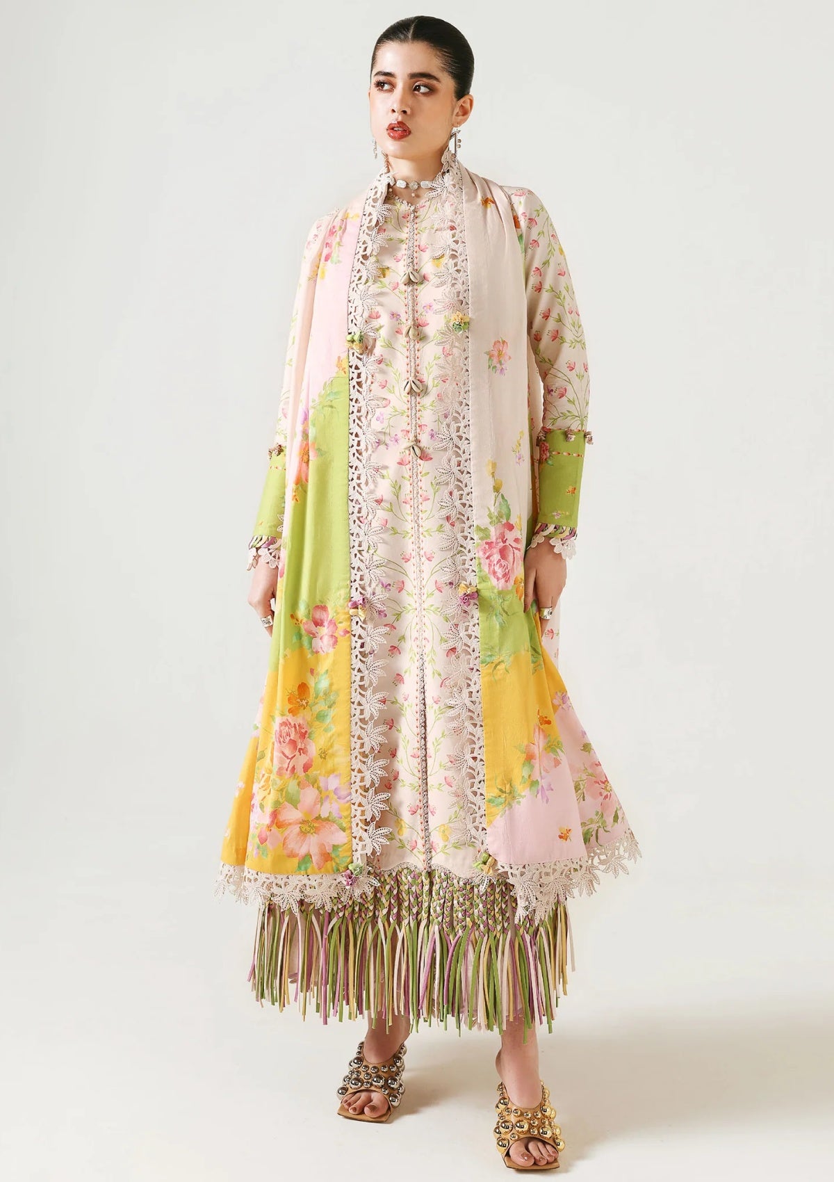 Unstitched lawn ensemble in a soft ivory beige tone, adorned with delicate lilac and yellow miniature floral detailing. Paired with a matching printed trouser and a beautifully flowing voile floral dupatta, this light and breezy outfit is perfect for summers.