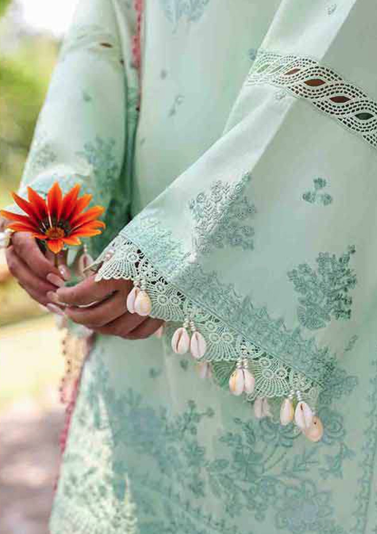 In a refreshing mint green hue, this three-paneled shirt blooms with a delicate mono floral design, subtle yet full of charm. Paired with a breezy chiffon dupatta, its beauty is framed by a bold pink satin border on all four sides adding a striking statement to this whisper soft symphony of color and grace.