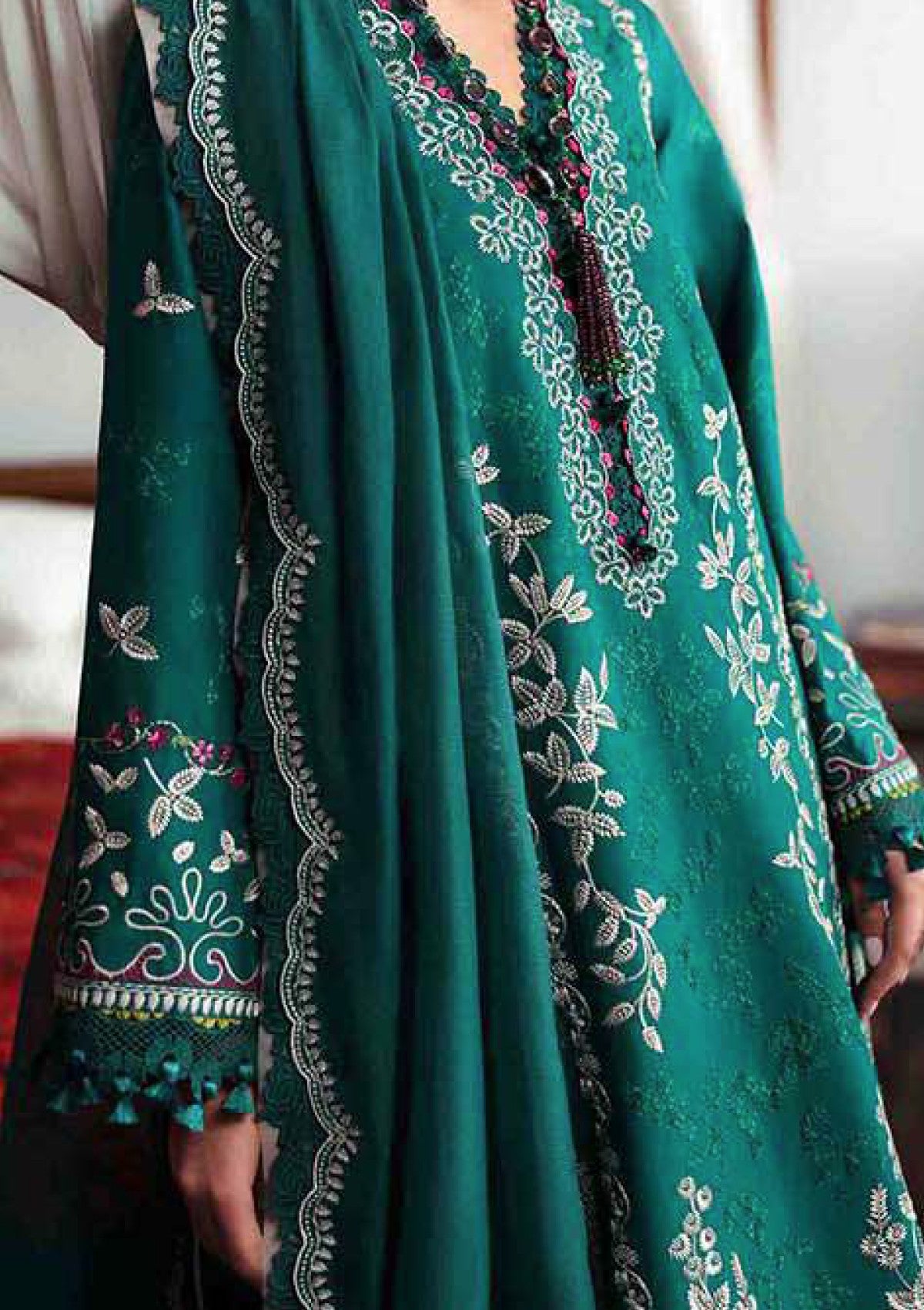 Radiating timeless charm, this three-paneled shirt features white satin-embossed floral stitches in a refined mono-textured finish, complemented by a V neckline adorned with delicate floral detailing. Shikargah-inspired motif grace the side panels, adding depth and tradition to the design. The look is elevated with a rocket net dupatta, finished with a scalloped four-sided border for an elegant touch. This ensemble seamlessly merges classic craftsmanship with modern flair, making it a standout expression of grace and sophistication.