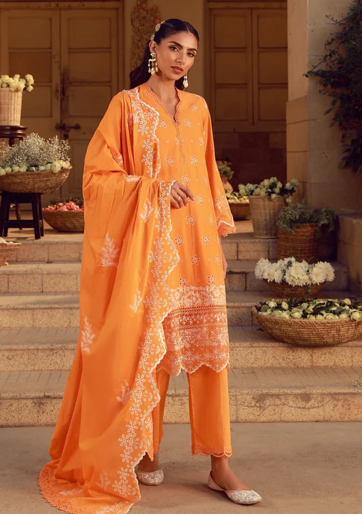This vibrant orange ensemble with a matching schiffli dupatta features intricate ivory chikankari embroidery and cutwork scallop details on the shirt and dupatta. Accented with silver zari embroidery details. The shirt has extensive floral schiffli embroidery along with embroidered organza borders for the daman. The ensemble combines traditional craftsmanship with a contemporary silhouette, suitable for semi-formal occasions or casual outings.