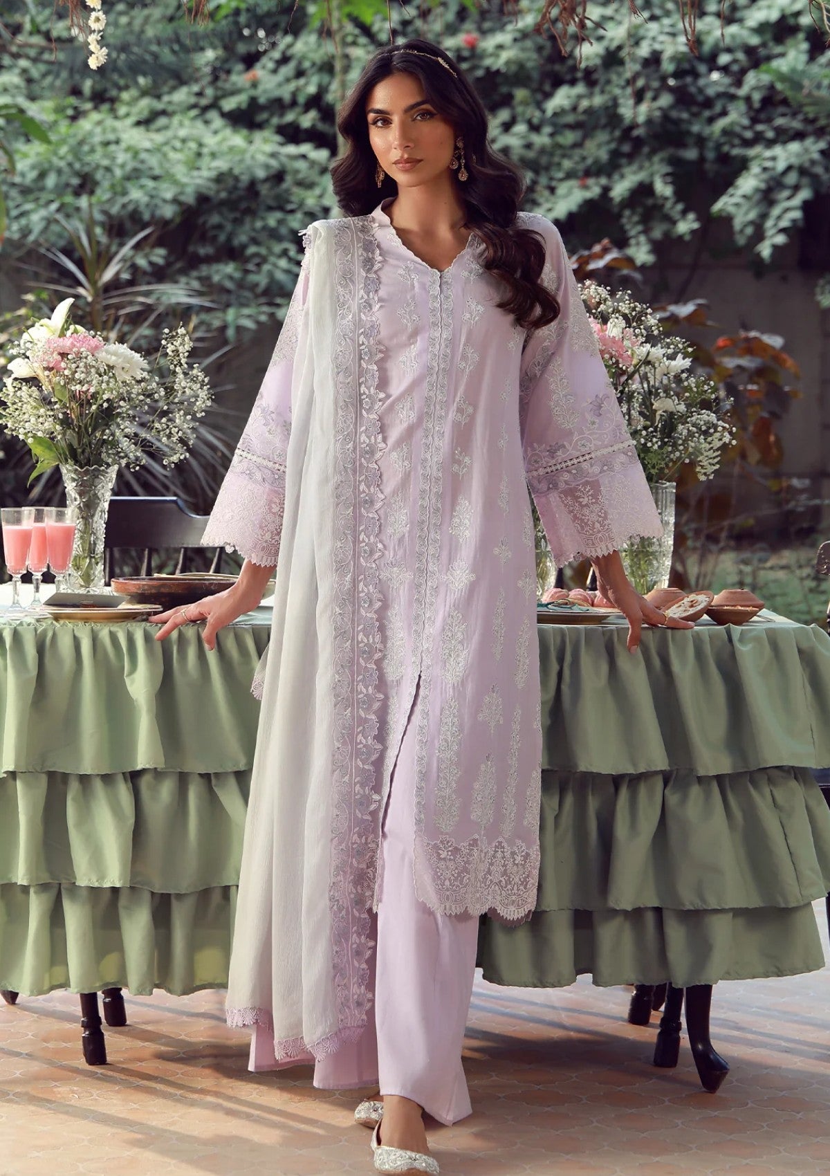 Step into understated elegance with this soft lilac ensemble, crafted for graceful eid occasions. This outfit is adorned with delicate white chikankari embroidery and scalloped organza lace detailing along the sleeves and hem, creating a refined and feminine silhouette. Paired with matching straight-cut trousers and a beautiful embroidered grey dupatta, this look flows effortlessly for garden gatherings, festive luncheons, and intimate celebrations, this ensemble blends classic craftsmanship with modern ease.