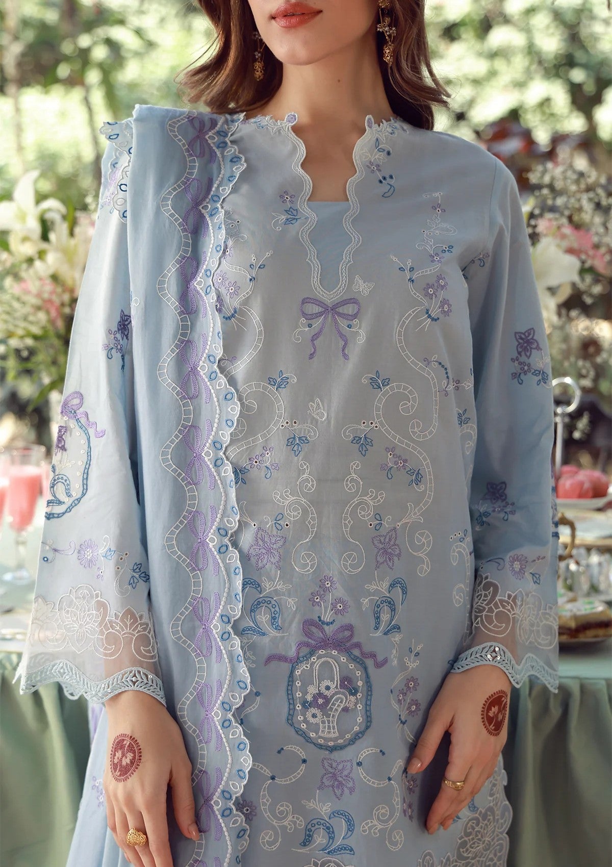 The shirt features delicate white and pastel blue embroidery in a classic composed layout, accented with subtle lavender embroidered details. The design shows fun elements like embroidered tulips, bows and butterflies to elevate the look. The hemline is adorned with an embroidered organza border along with an organza patch with floral vase motif attached on the front and sleeves of this outfit. The sleeves are further elevated by adding embroidered organza borders. This outfit is paired with a matching dupatta with running borders on two sides. Light, feminine, and timeless, this ensemble is ideal for daytime festivities, summer gatherings, and refined festive wear.