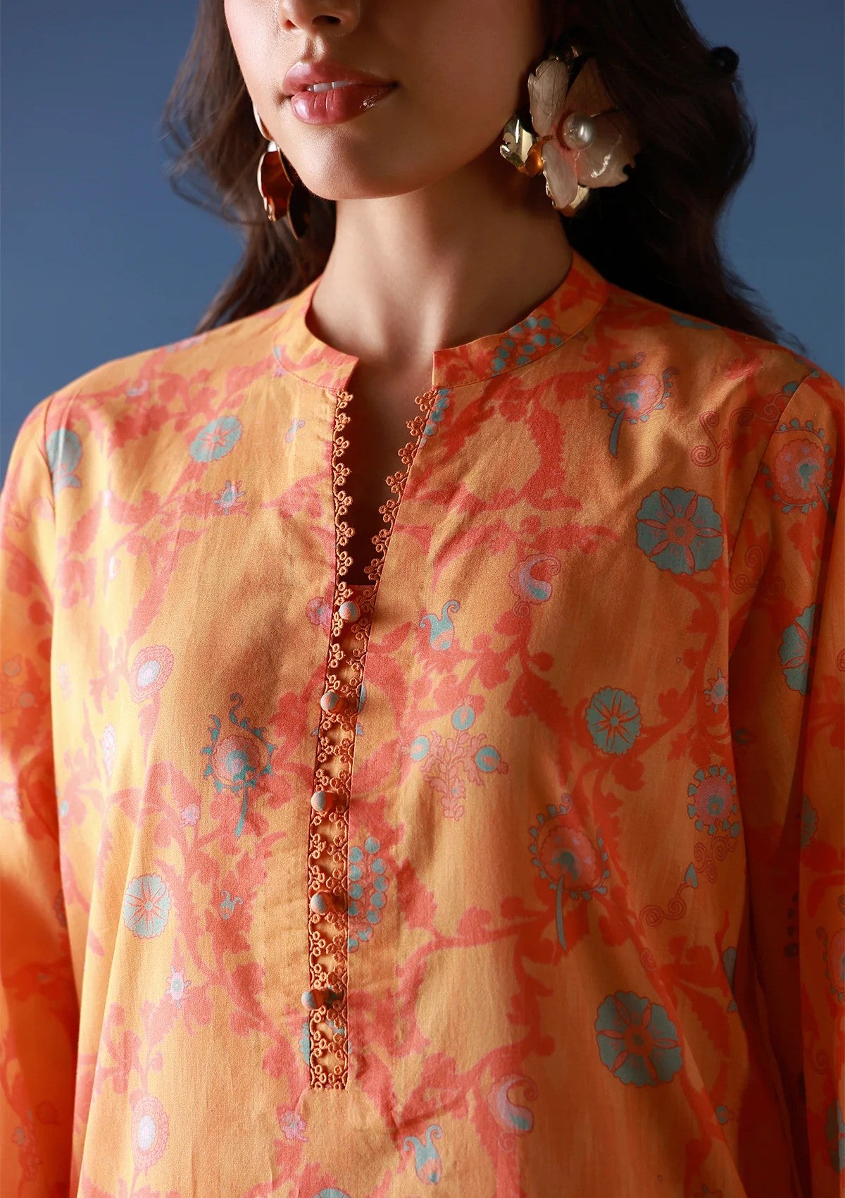 Warm peach and amber tones layered with delicate floral impressions. The softly tailored shirt and pants are complemented by a harmonized dupatta. Sunlit, graceful, and easy to wear.