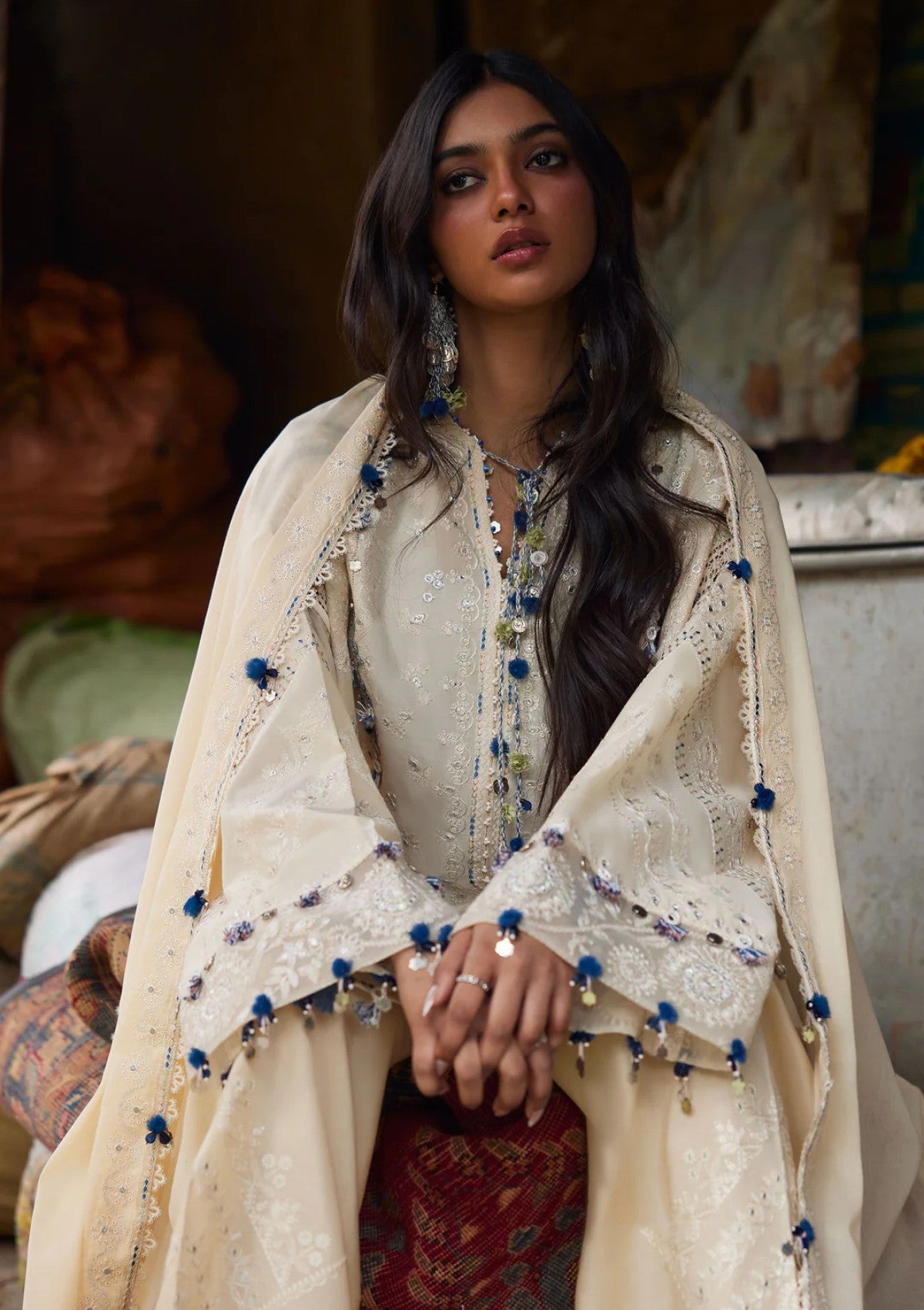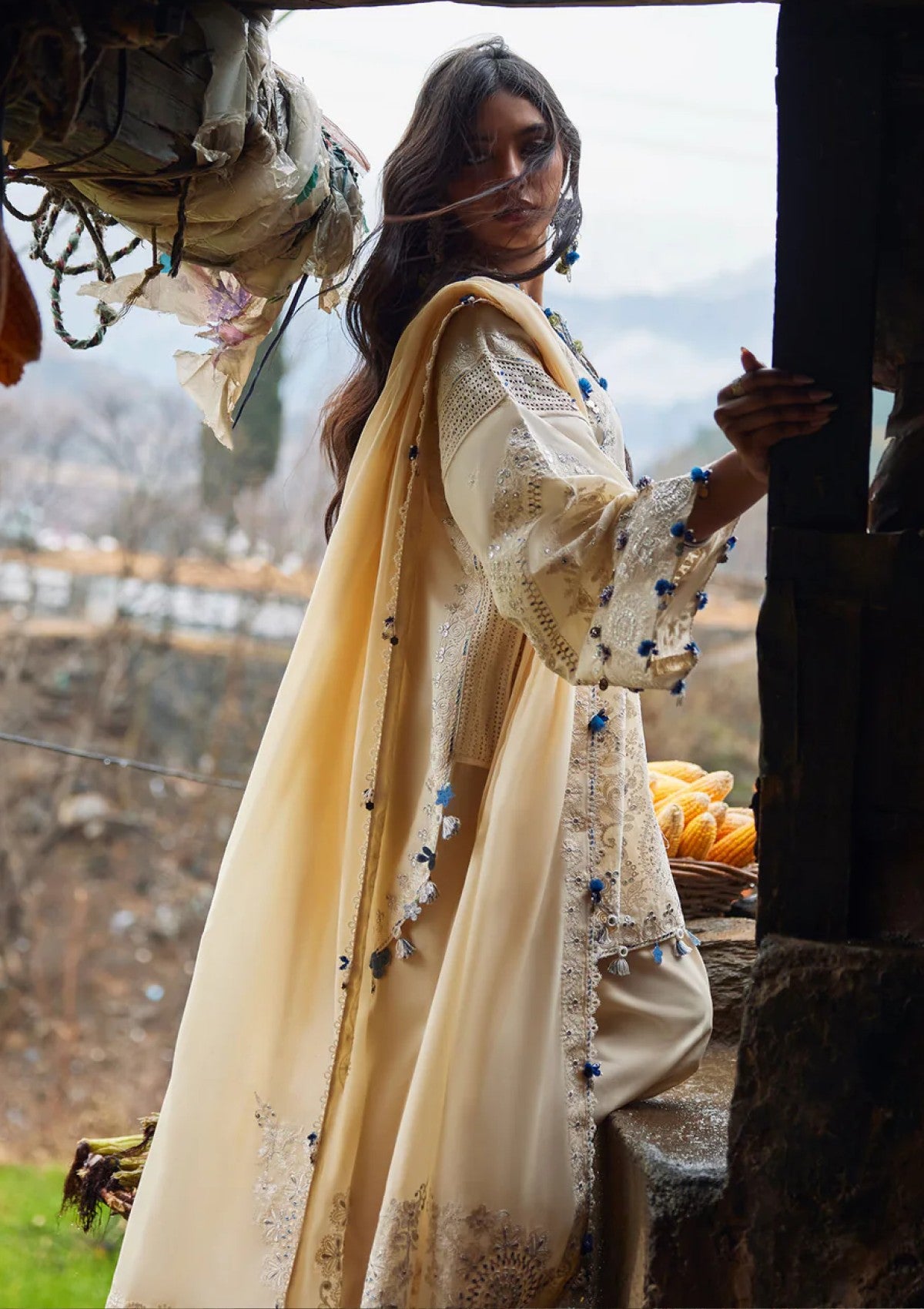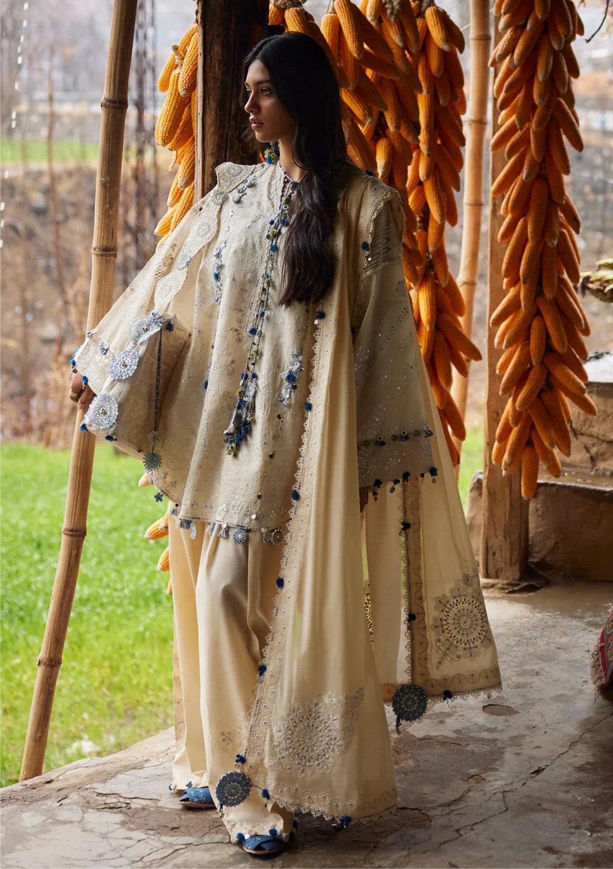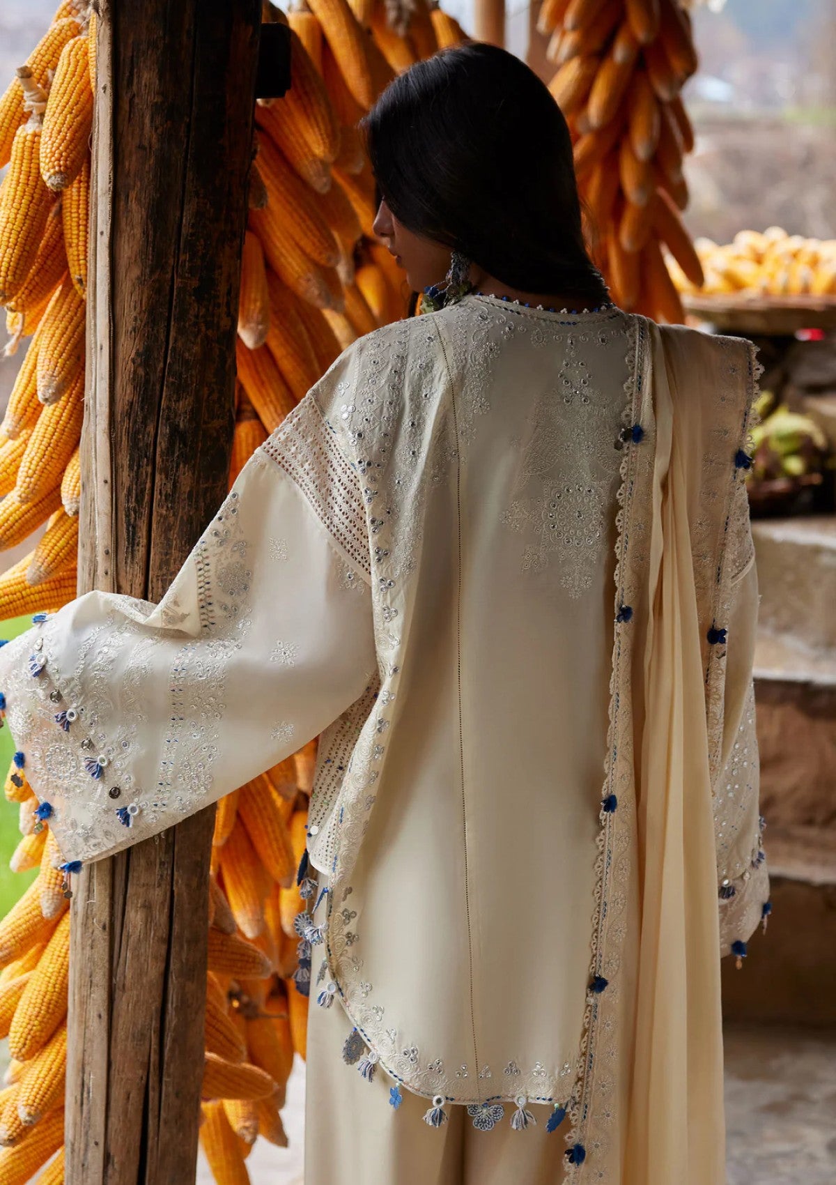 An ode to soft refinement, this buttercream-toned ensemble radiates understated luxury. The rounded shirt is delicately adorned with intricate ivory and pastel-accented embroideries, unfolding in graceful florals that echo timeless craftsmanship. Scalloped edges and fine lace accents frame the silhouette with subtle texture, while mirror details lend a gentle rhythmic sparkle. Paired with a lightweight voile dupatta, the look drapes with effortless elegance; airy, luminous, and serenely poised. Rùyá embodies embroidered texture in its most graceful form: pure, polished, and quietly captivating.