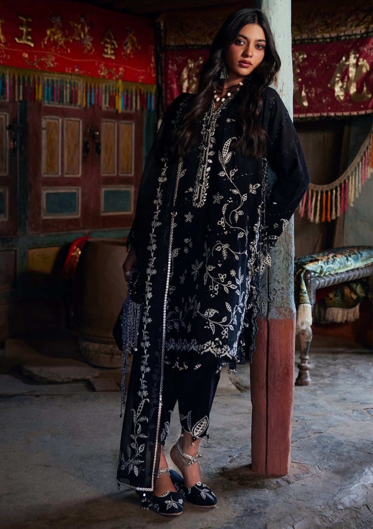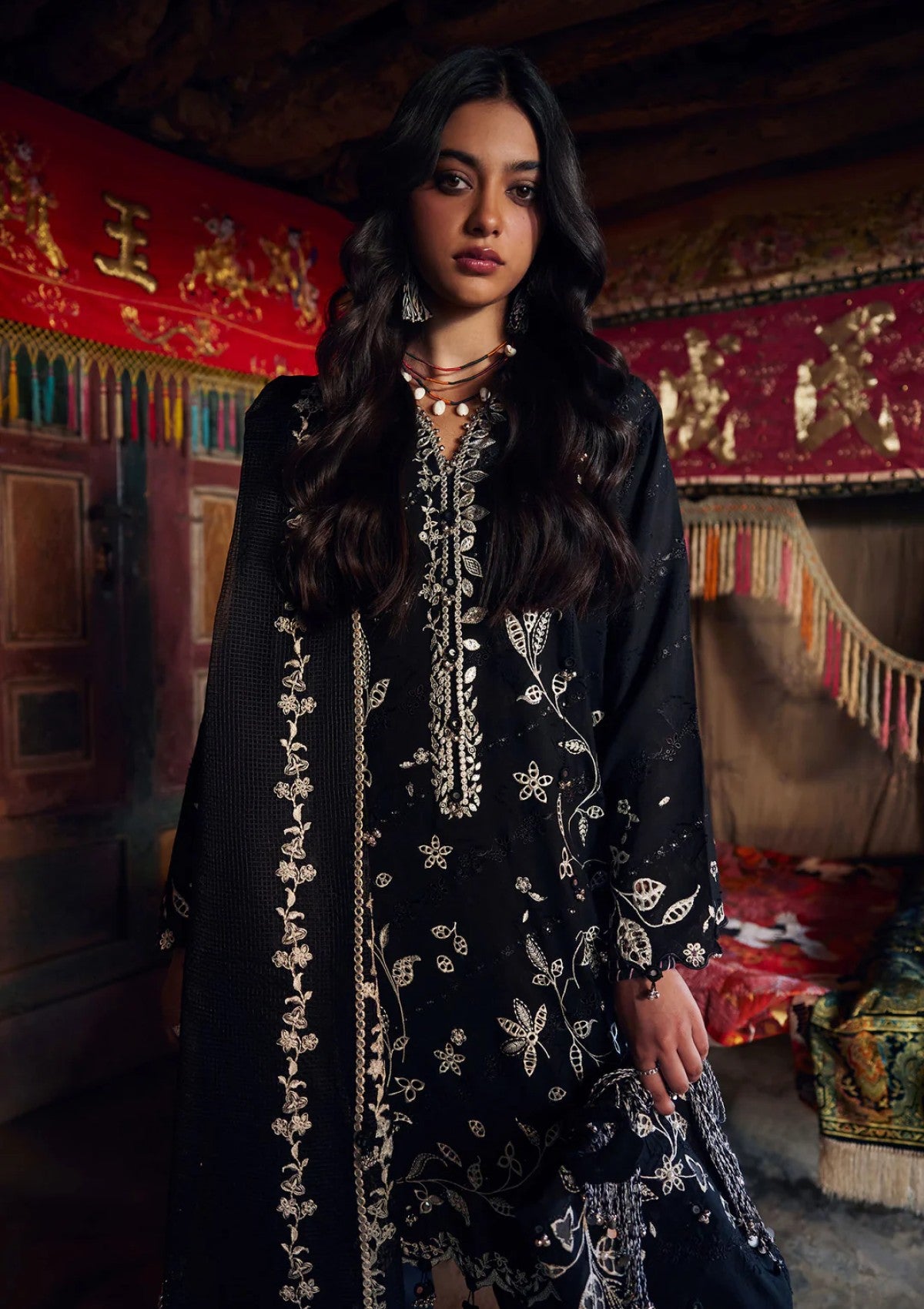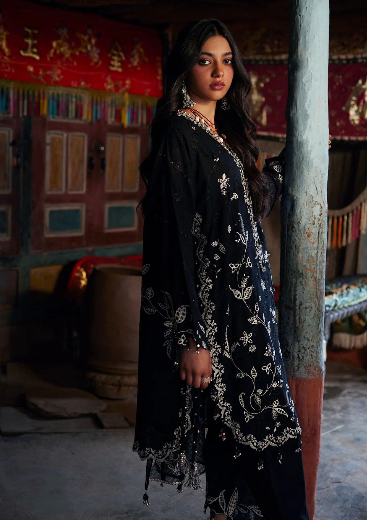An ode to understated elegance, this inky noir ensemble is a study in refined contrast. The elongated shirt is adorned with delicate ivory floral embroideries, tracing the neckline, sleeves, and hem with poetic precision, echoing heritage artistry reimagined for modernity.Coordinating trousers feature embroidered cuff accents, while a diaphanous dupatta flows effortlessly, framed with detailed borders and floral embroideries that mirror the ensemble’s ornate narrative.