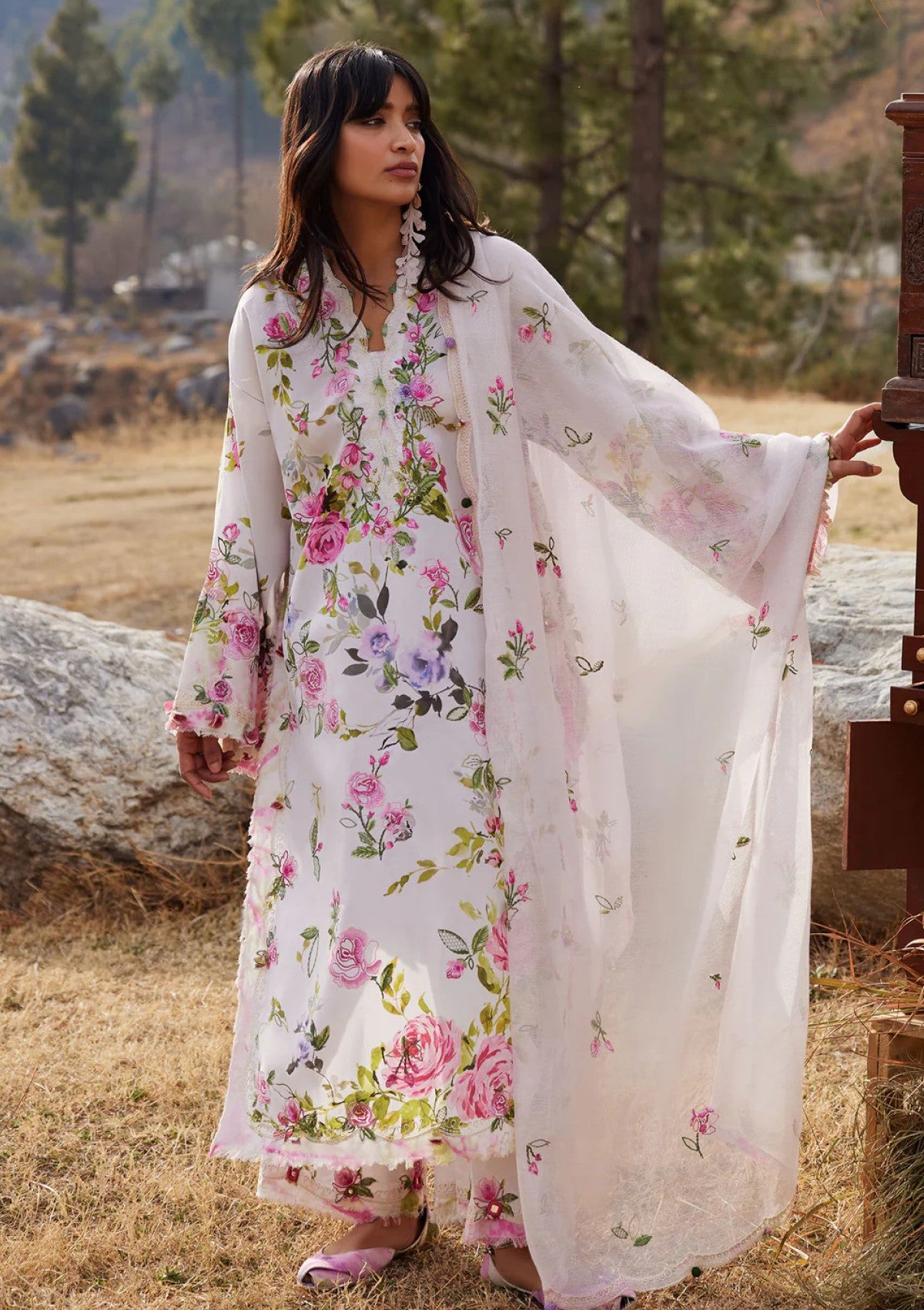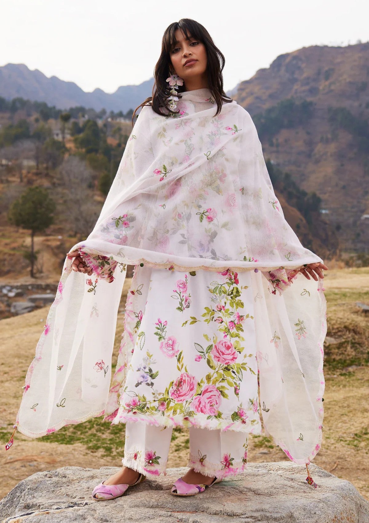 The flowing silhouette, paired with coordinated printed trousers, creates an effortlessly elongated form that moves with poetic ease. A textured cotton net dupatta, adorned with embroidered floral motifs, completes the ensemble with ethereal charm. Light as air yet beautifully composed, it drapes like a veil of lilac mist—romantic, luminous, and endlessly feminine.