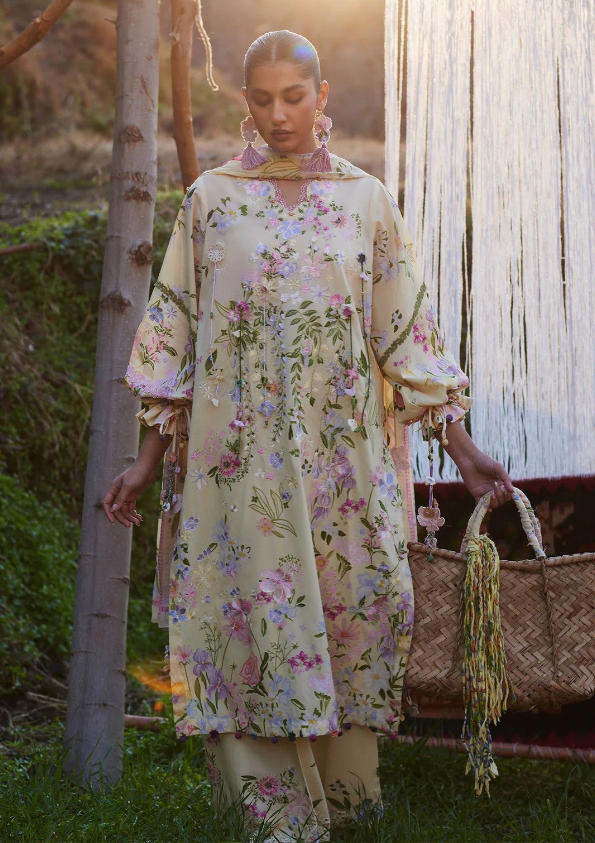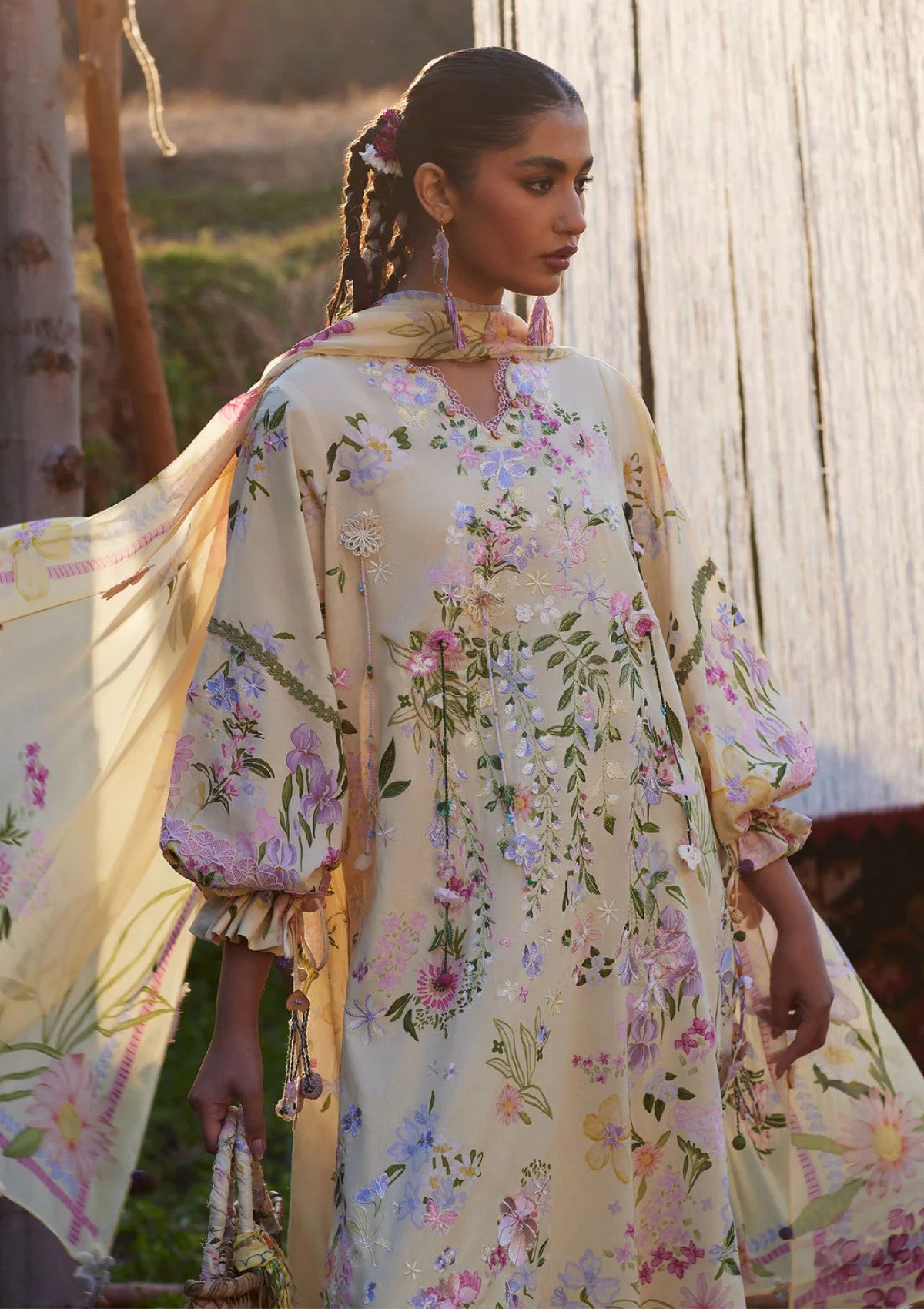 An ode to delicate femininity, jiā (佳) blooms on a creamy butter canvas adorned with pastel florals in blush, lilac, powder blue, and hints of fresh sage. The composition feels like a quiet spring garden, light, airy, and effortlessly graceful. Intricate thread embroidery traces the neckline and hem, unfolding into softly detailed blossoms that add texture without overpowering the serenity of the base. Subtle tassel accents and handcrafted elements lend gentle movement, enhancing the romantic charm of the silhouette. Paired with coordinating printed trousers, the look is completed with a flowing printed chiffon dupatta, sheer, weightless, and kissed with floral motifs that echo the ensemble’s tender palette. jiā (佳) is softness in motion, refined, feminine, and beautifully understated.