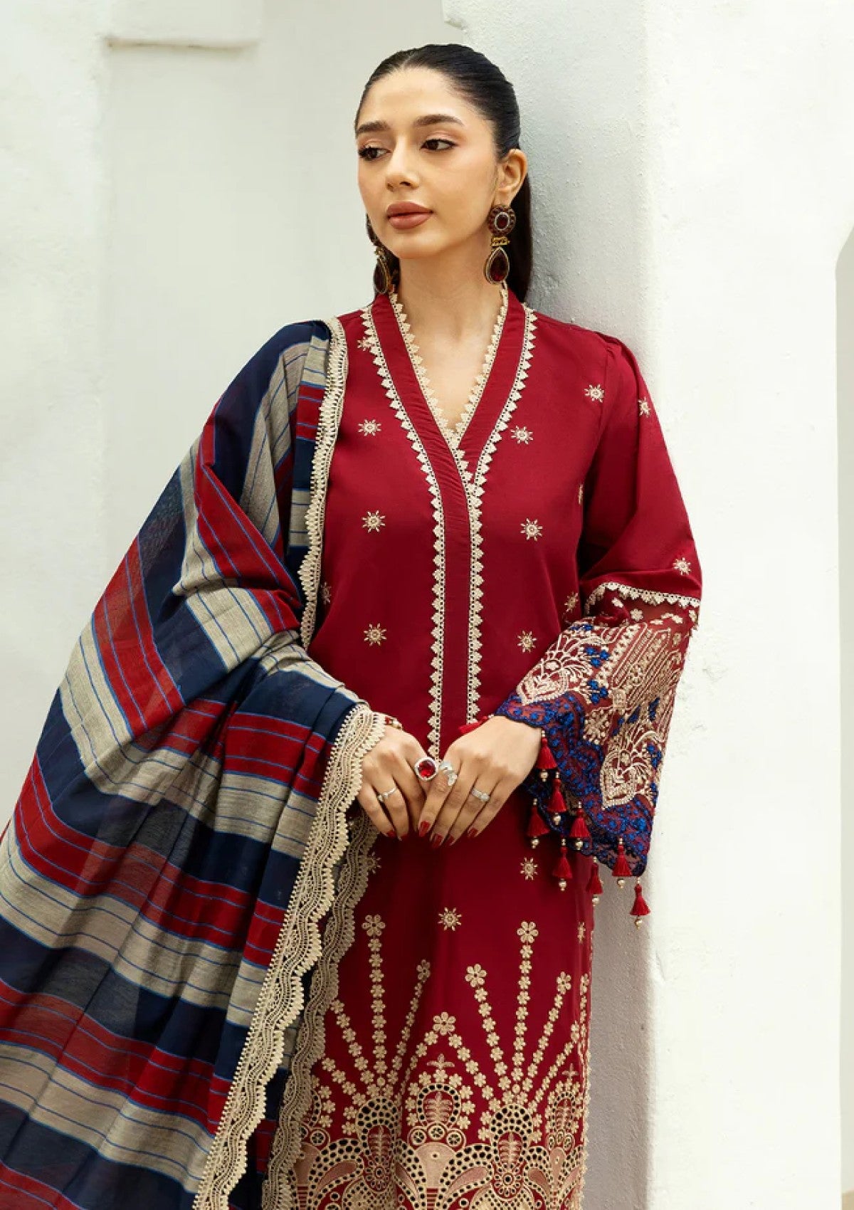 This elegant ensemble showcases a deep red hue, providing a sophisticated backdrop for the intricate craftsmanship. The shirt is meticulously adorned with delicate white chikankari embroidery, creating a stunning contrast and showcasing the traditional artistry. Further enhancing the ensemble is the rich rust-orange dupatta, featuring a blend of traditional patterns and complementary borders, adding a touch of warmth and opulence.