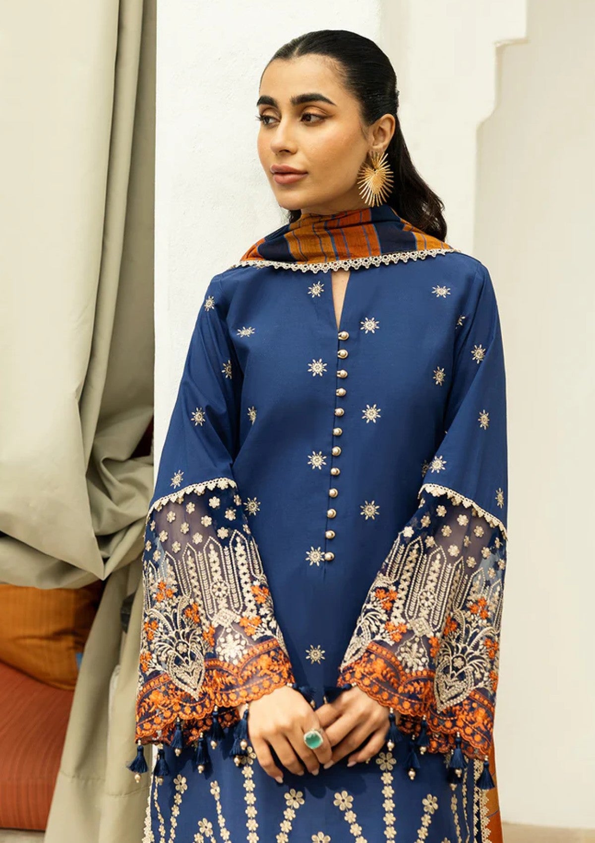 This elegant ensemble showcases a deep navy blue hue, providing a sophisticated backdrop for the intricate craftsmanship. The shirt is meticulously adorned with delicate white chikankari embroidery, creating a stunning contrast and showcasing the traditional artistry. Further enhancing the ensemble is the rich rust-orange dupatta, featuring a blend of traditional patterns and complementary borders, adding a touch of warmth and opulence.