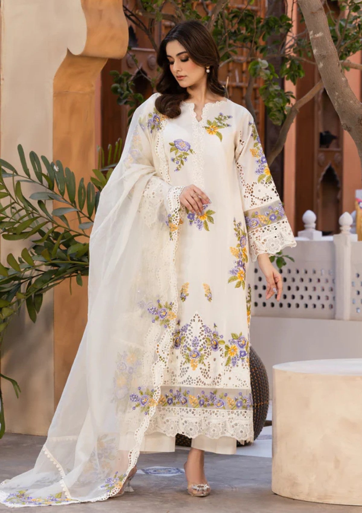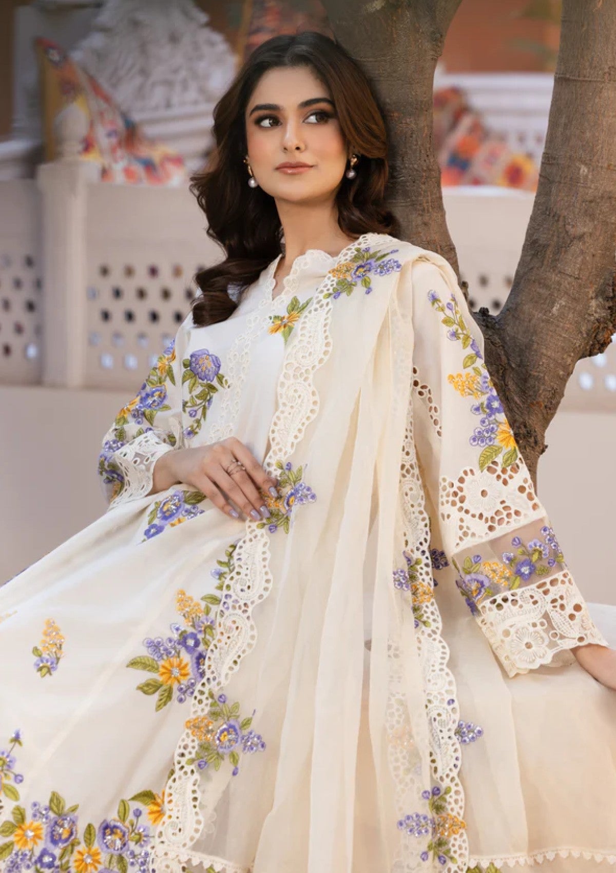 Embrace effortless elegance with Ivory Bloom, a delicate ivory ensemble adorned with floral embroidery in soft shades of lavender and gold. The intricate lace detailing adds a touch of feminine sophistication, making this outfit a must-have for daytime elegance and festive gatherings.