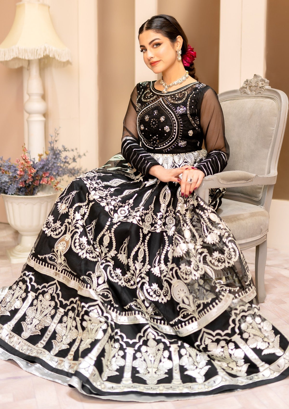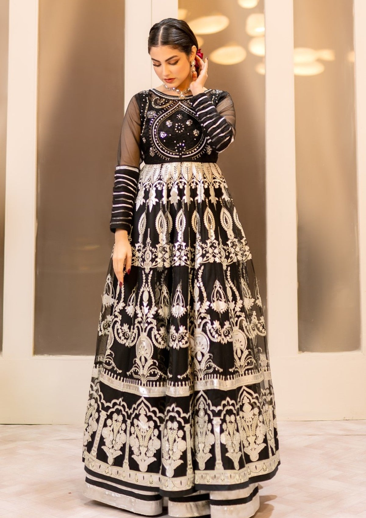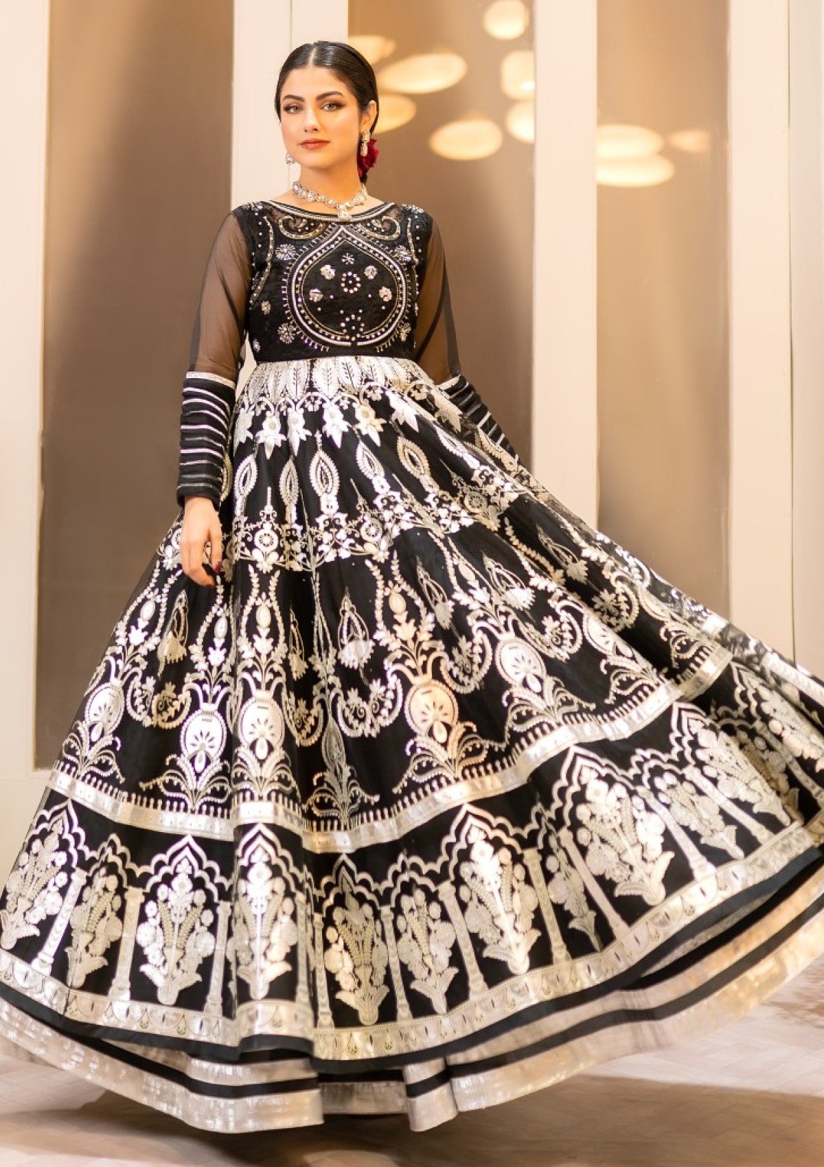 A gorgeous double layered embossed flock printed tulle gown rendered in delicate adda work with a cerulean black and silver hue, this ensemble carries an intricately embroidered neckline with cut dana, pearl and thread paired with a decadently embroidered bodice in an exquisite floral motif with hints of silver accompanied by embroidered borders for hemline and rounds of embroidered borders for the hemline and