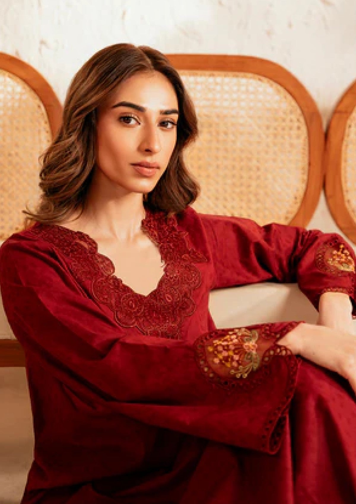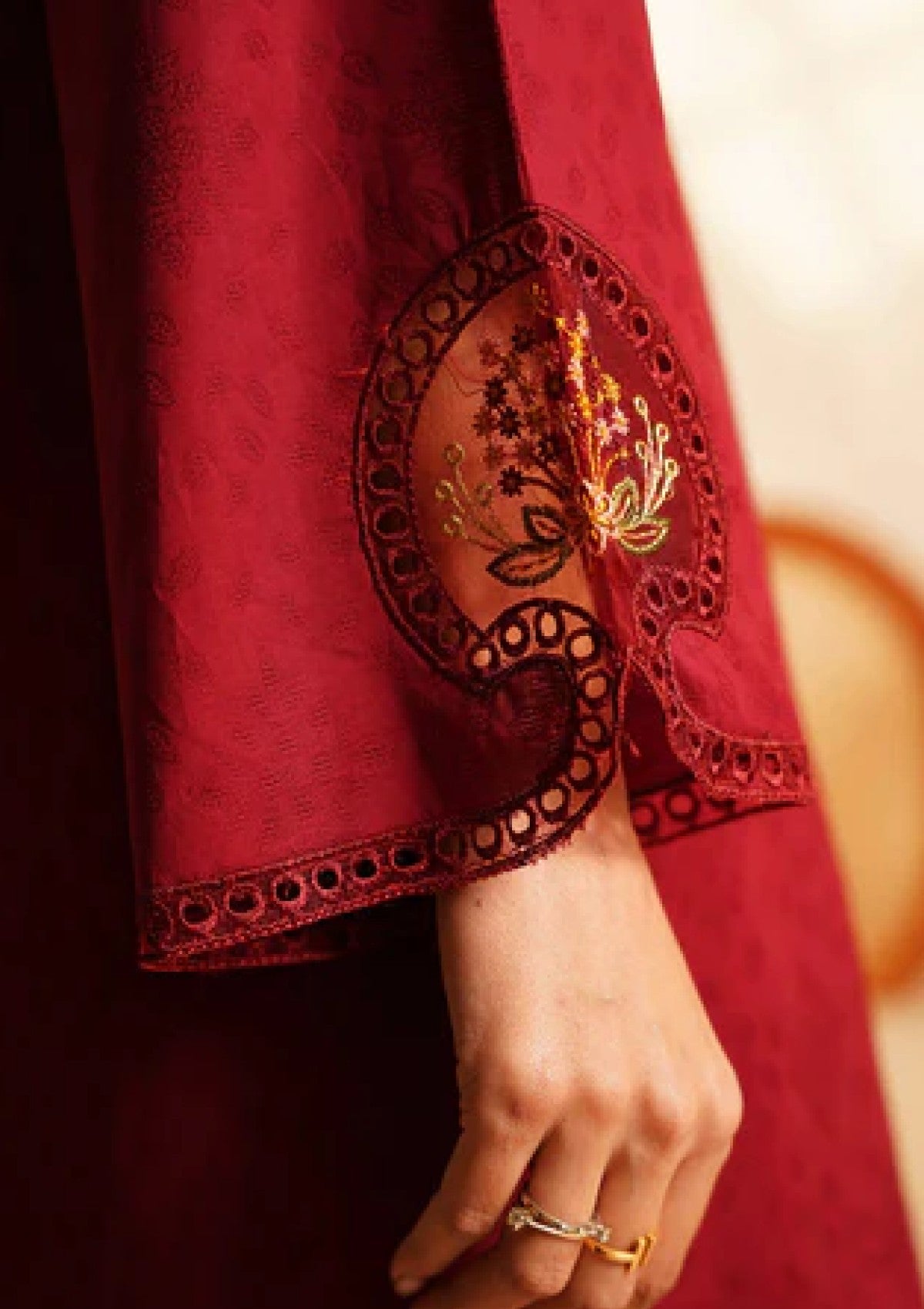 This ensemble features a deep red long shirt made from self-jacquard fabric, which offers a refined, smooth texture, giving the piece an understated elegance. The bold deep red color provides a striking pop, ensuring the shirt stands out. Paired with relaxed cotton trousers, this outfit perfectly combines style and comfort. The breathable cotton fabric ensures a soft and easy fit, making it ideal for both casual and semi-formal occasions. Whether worn for a day outing or a more polished event, this outfit exudes effortless charm and modern sophistication.
