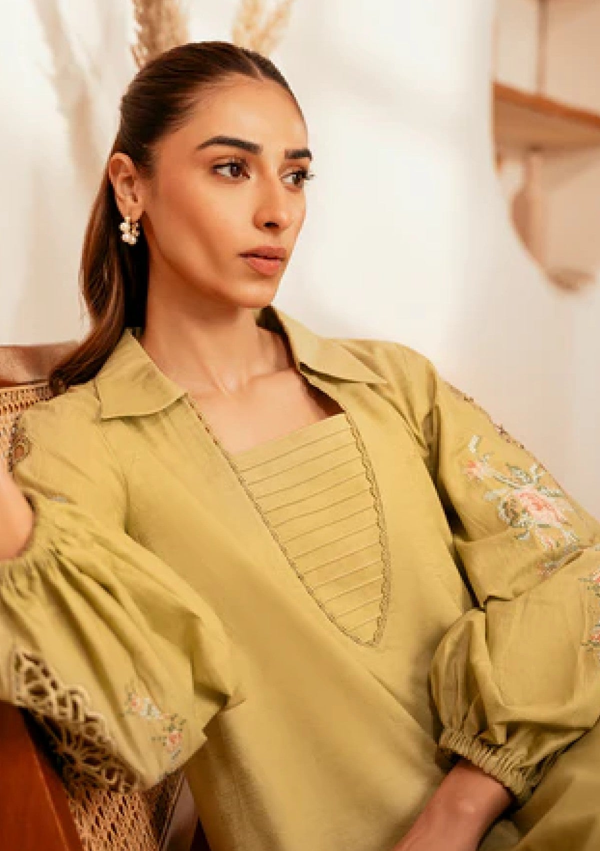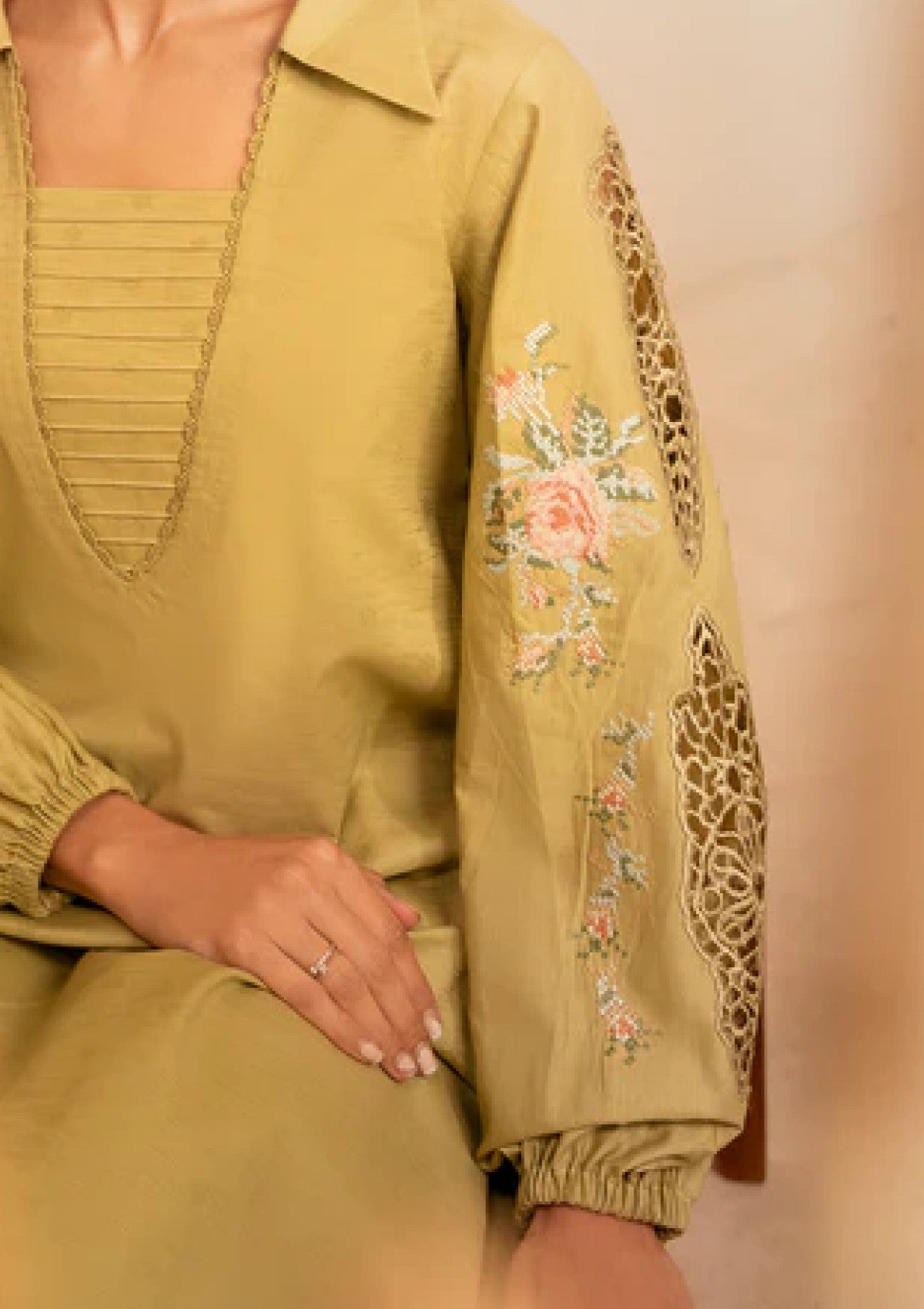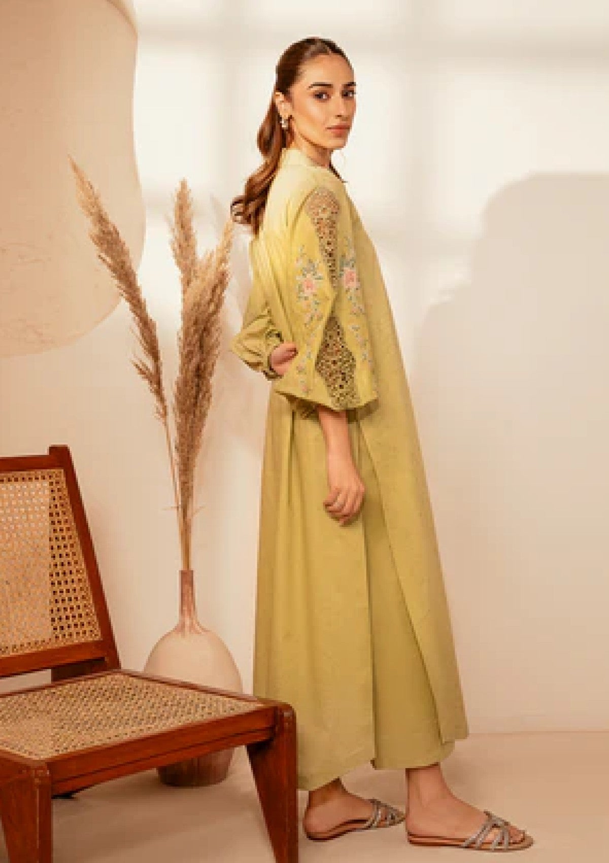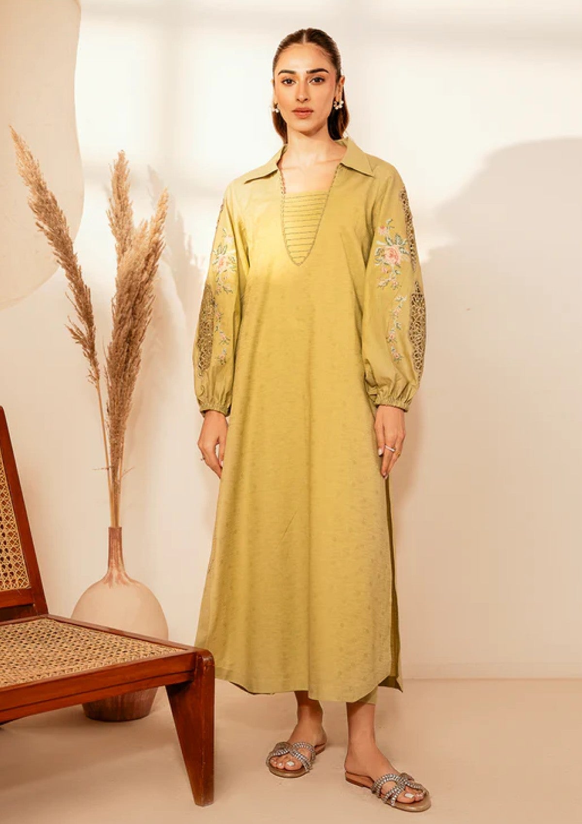 This outfit showcases an eye-catching apple green shirt, crafted from premium self-jacquard fabric with a soft texture and intricate pattern that enhances its sophisticated design. The vibrant apple green hue adds a refreshing pop of color, making it a standout piece for any wardrobe. Paired with breathable cotton pants, this ensemble offers a perfect balance of style and comfort, ideal for all-day wear. Whether for casual outings or semi-formal events, this outfit is a chic, versatile choice that combines modern elegance with practicality.