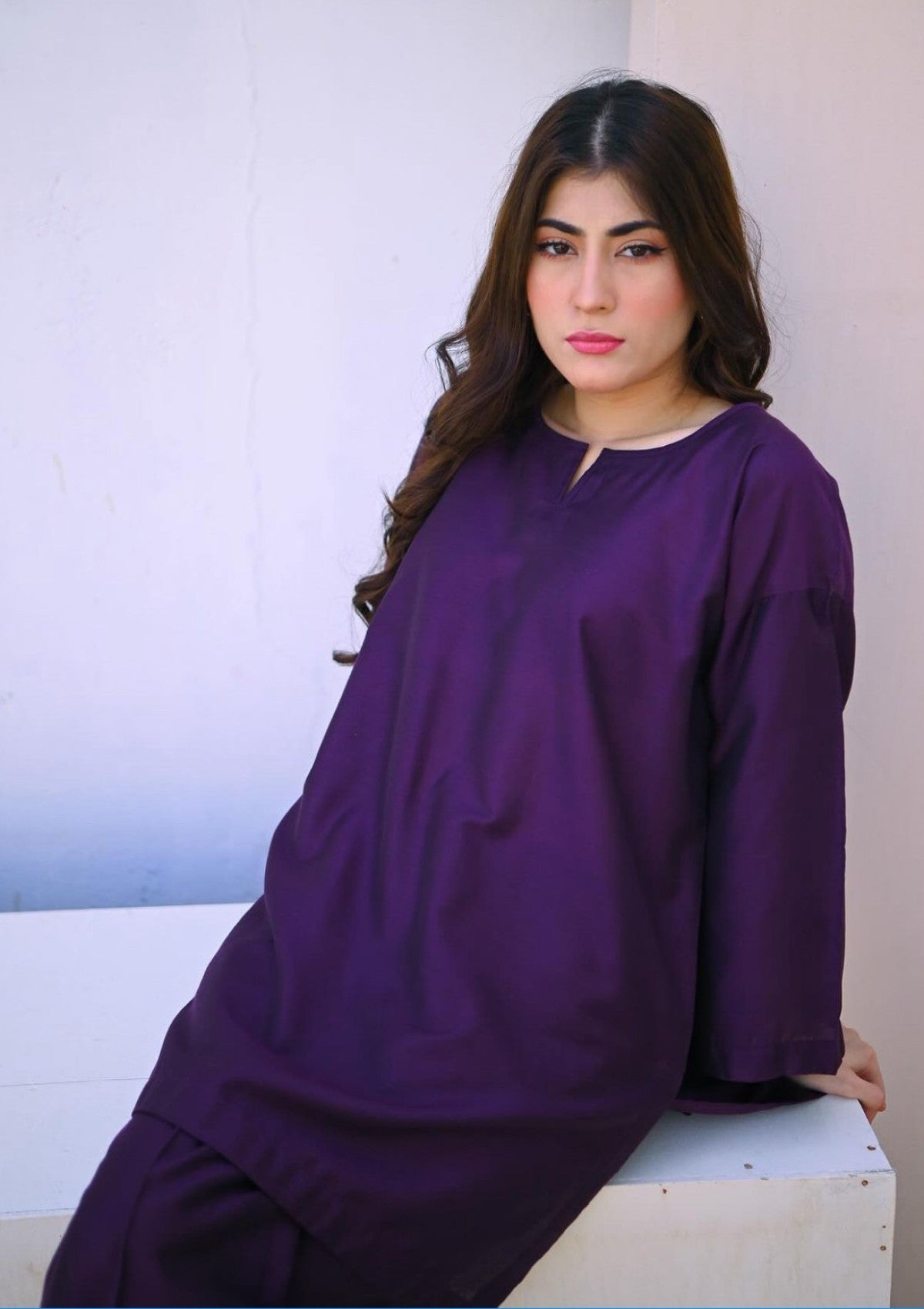 Deep violet matching set includes square cut shirt and boot cut style pants in-house khadi cotton fabric suited for winters.