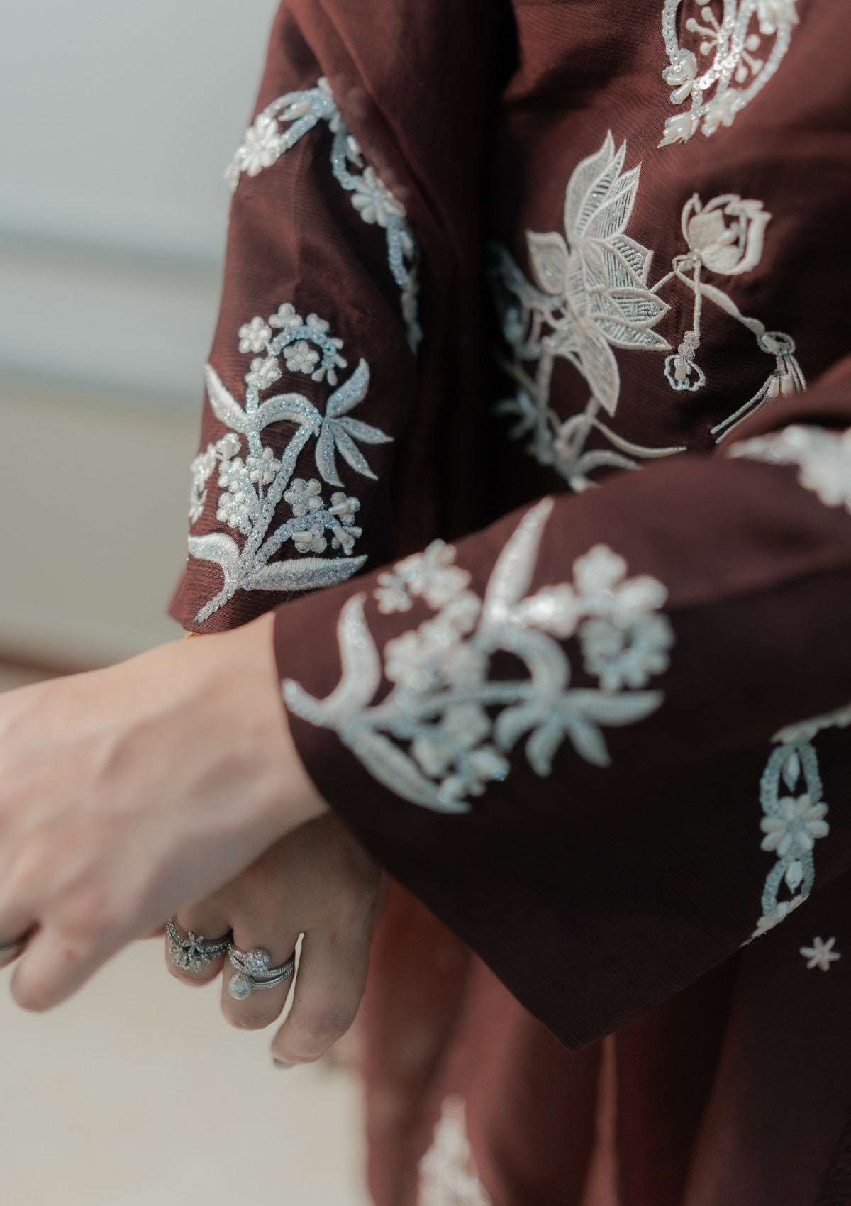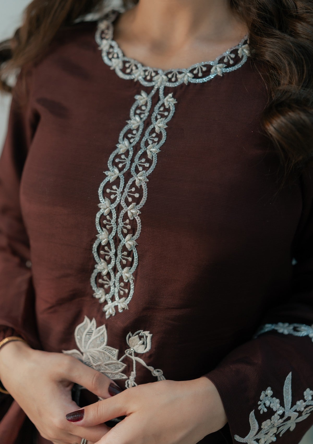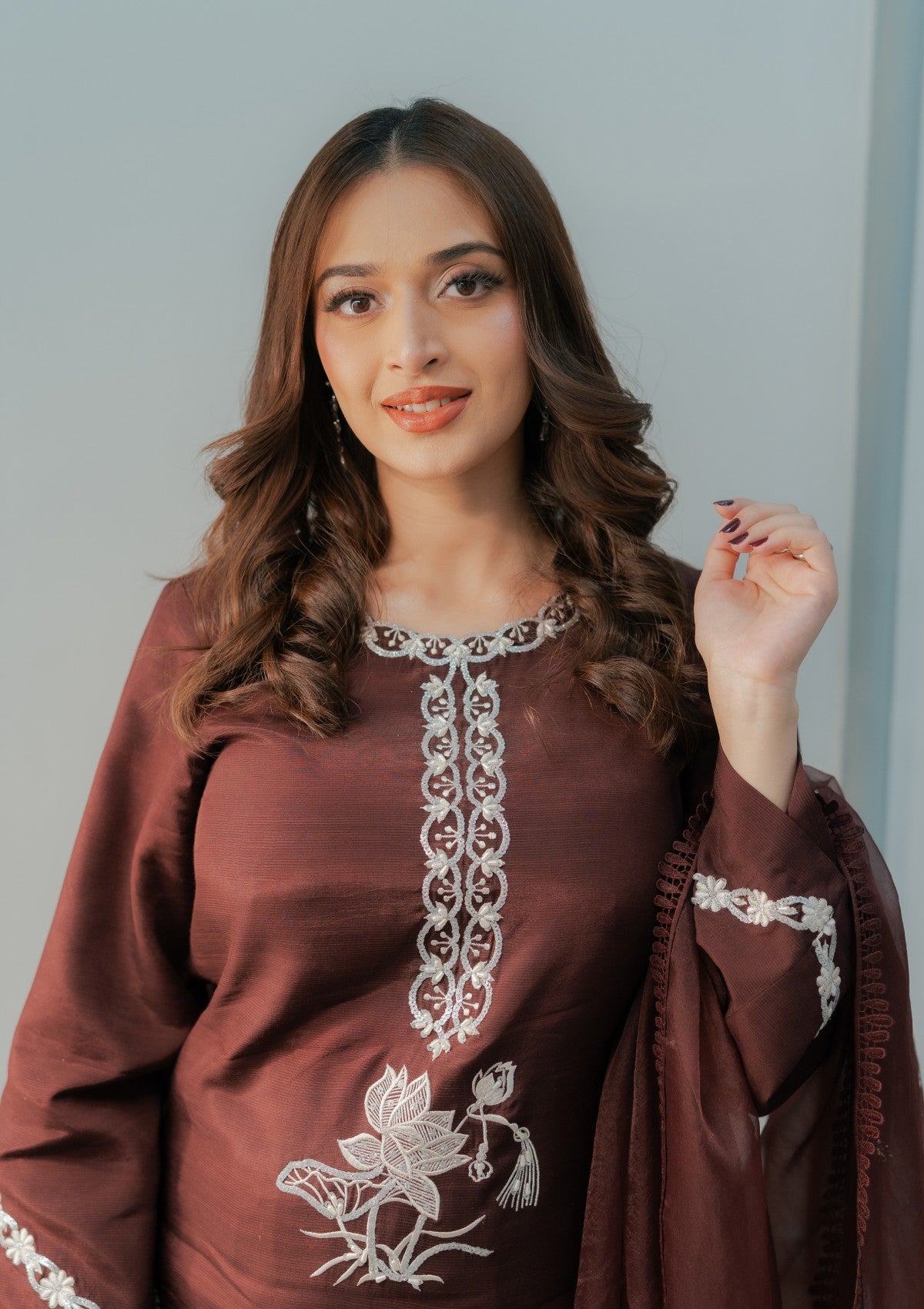 This 3-piece brown embroidered silk dress with an organza dupatta is the epitome of timeless elegance. The deep brown silk shirt is beautifully adorned with intricate embroidery, adding richness and texture to the ensemble. Paired with matching silk trousers for a seamless silhouette, the outfit is completed with a delicate organza dupatta that brings a touch of lightness and sophistication. The contrast between the lustrous silk and airy organza creates a perfect balance, making this outfit ideal for festive occasions, formal events, or evening gatherings. Classic yet contemporary, it’s a graceful choice for any refined wardrobe.