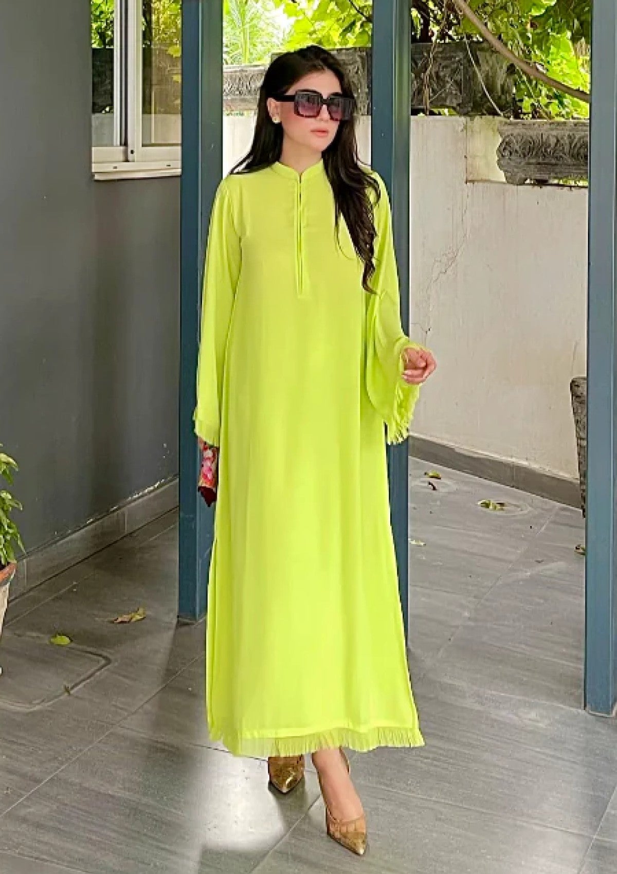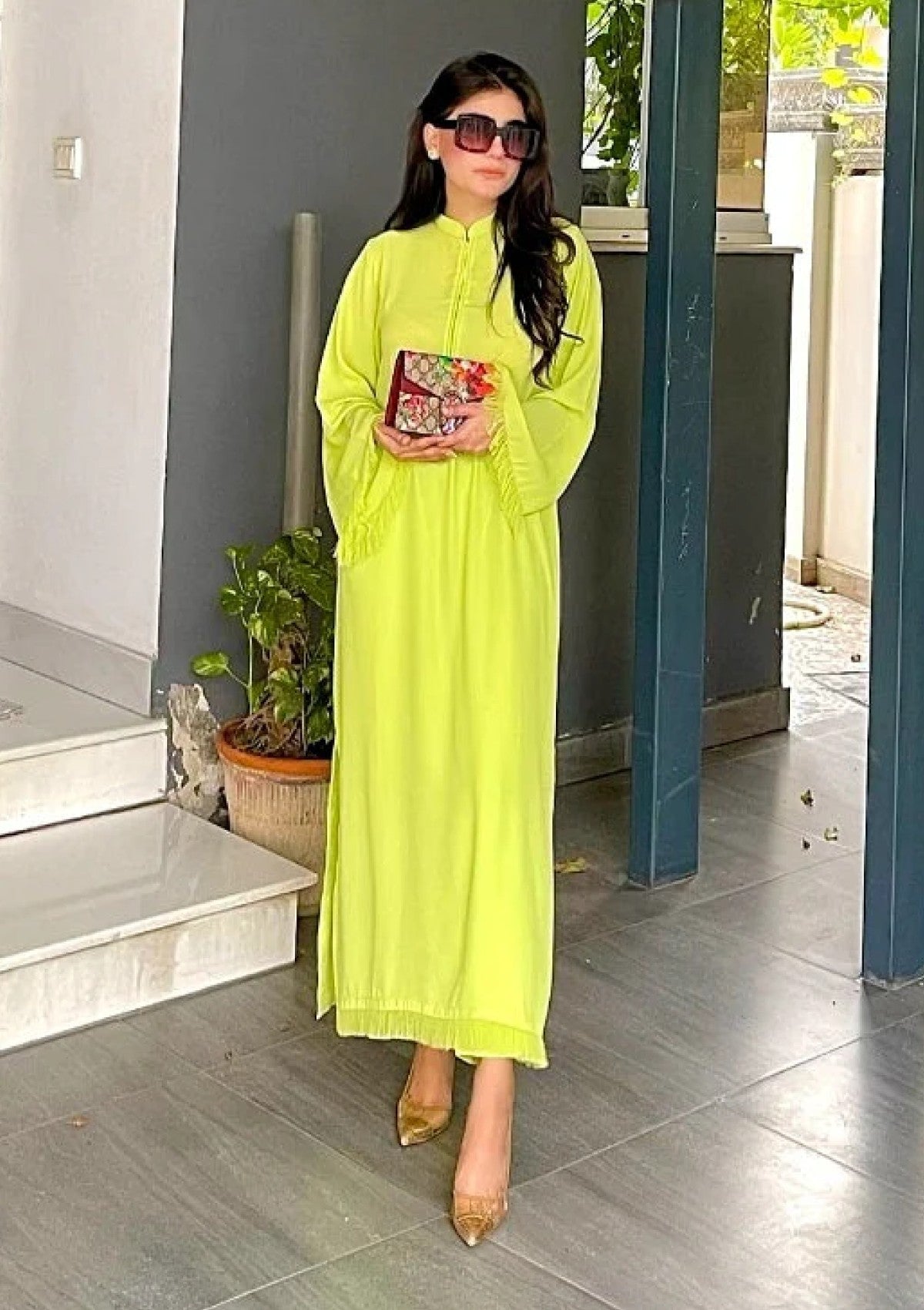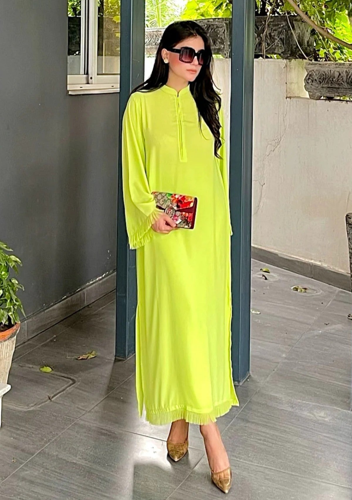 Introducing Neon Fringes by Manahils By ALLECHANT Clothing. This rare and attractive neon green color is a best seller in Pakistan. Elevate your style with this unique piece.