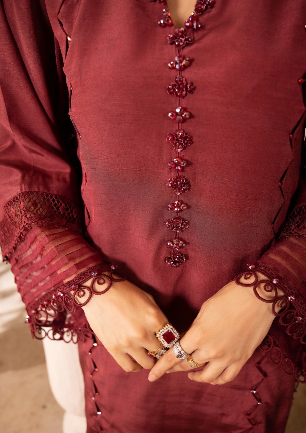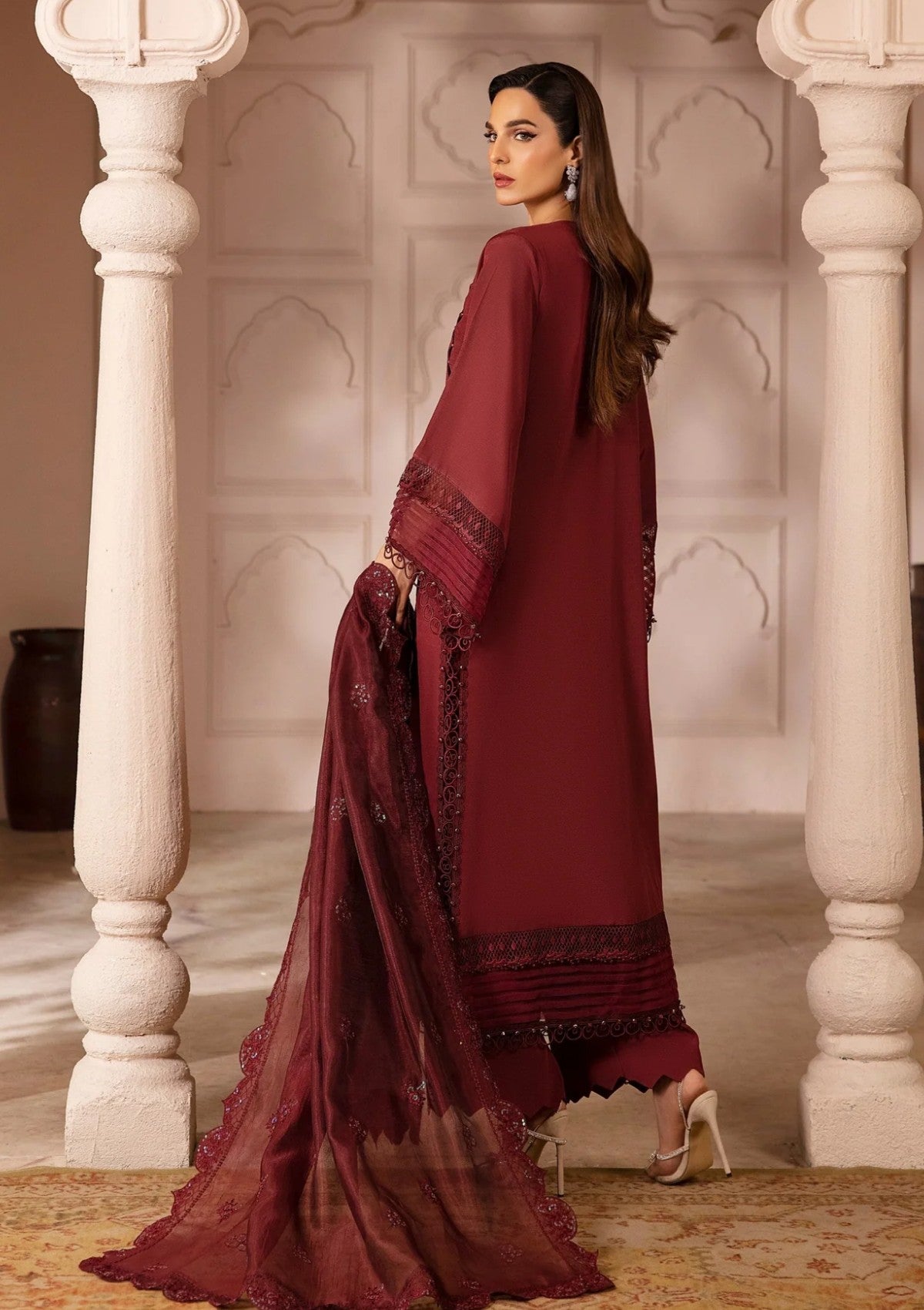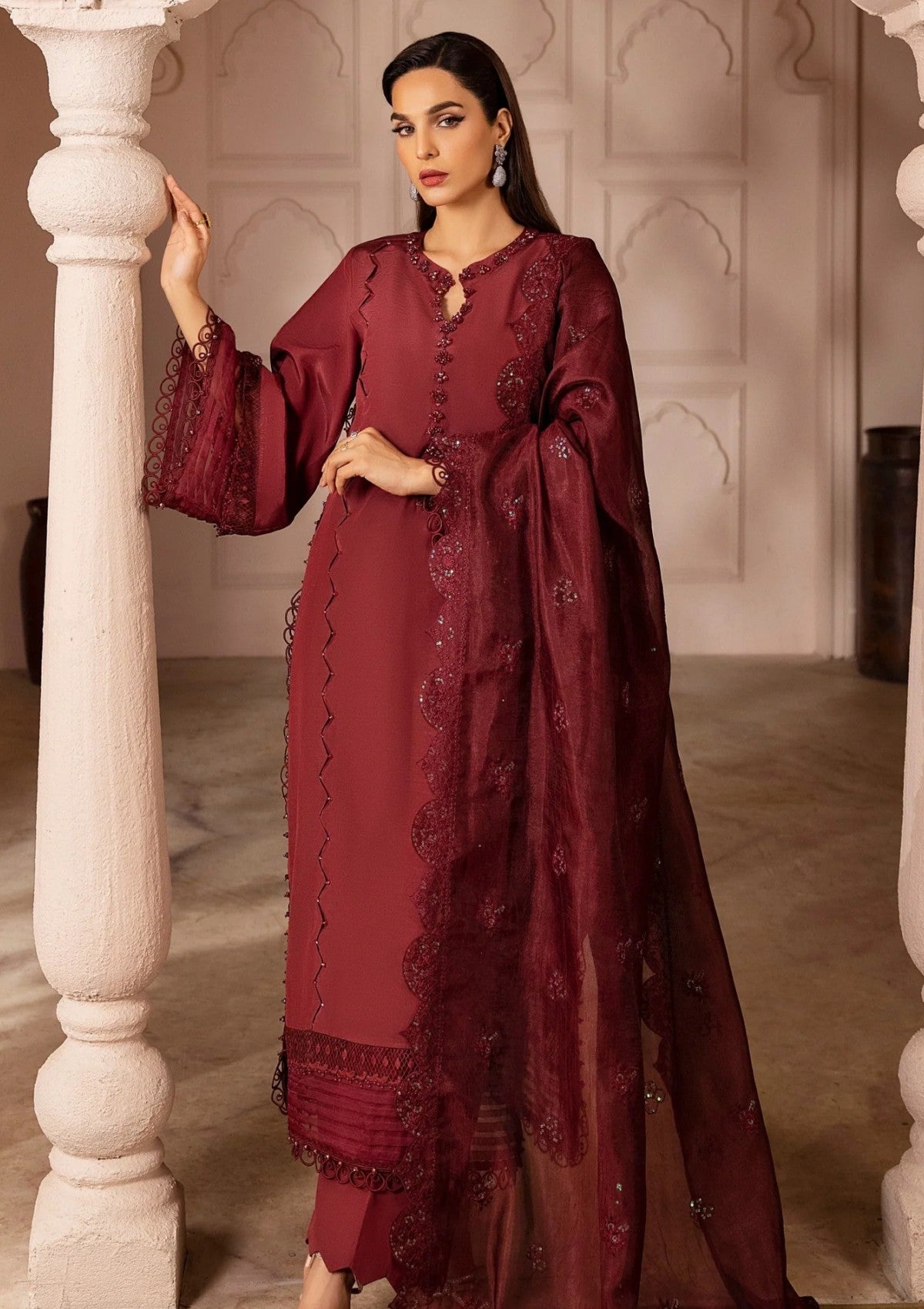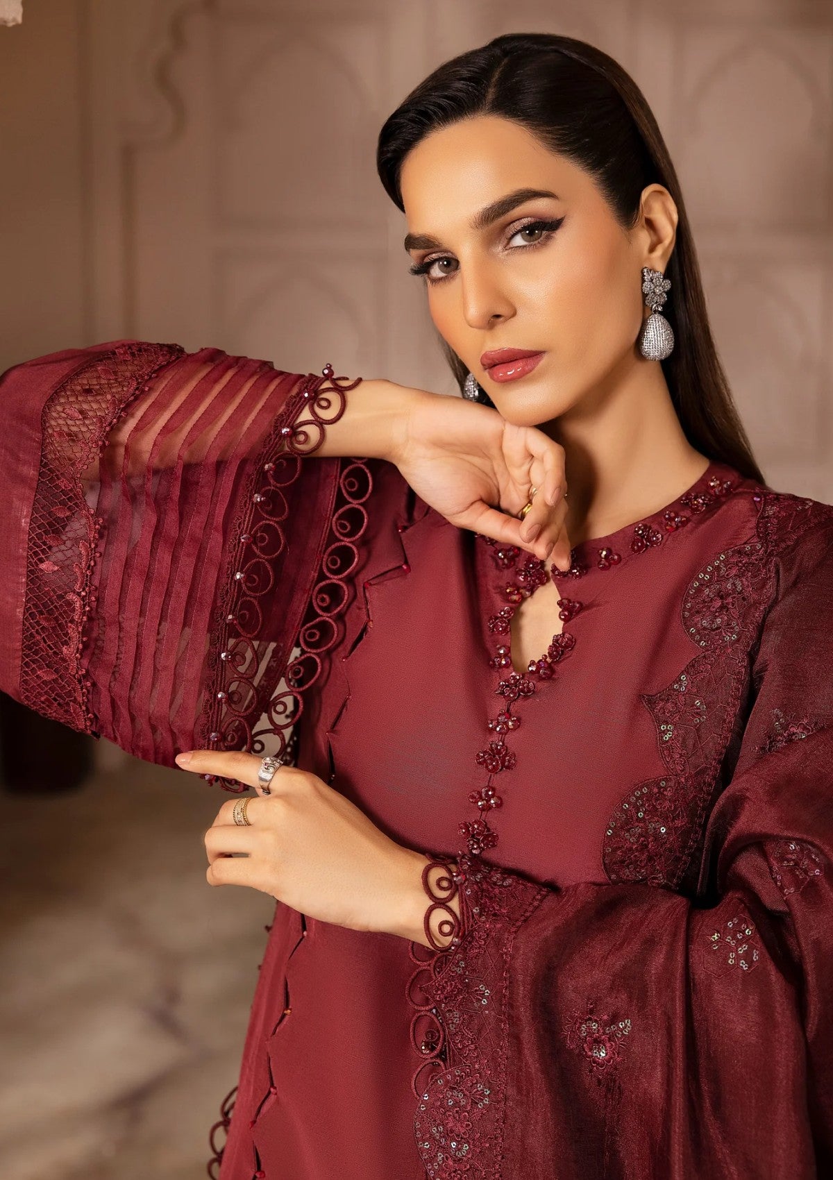 A gorgeous maroon traditional outfit. The dress is adorned with intricate embroidery along the neckline and sleeves, adding a rich, elegant touch. The matching dupatta is beautifully detailed with embellishments, complementing the outfit's overall look.
