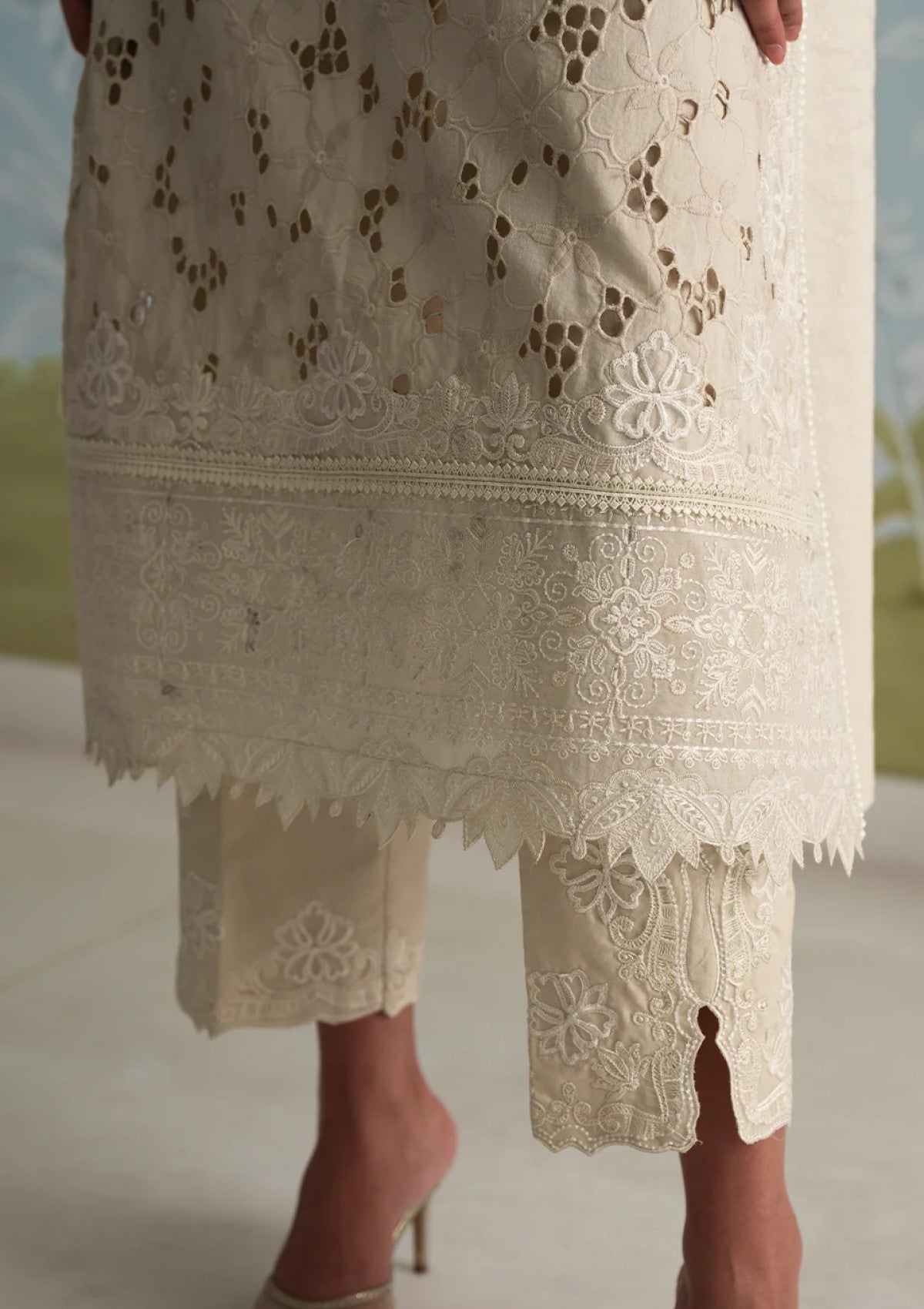 Add a touch of chic elegance to your wardrobe this season with ‘MILA’, this ivory beige eyelet cotton tunic. Rendered in a beautiful hues of beige, this ensemble is the ultimate luxe evening wear. The neck line of the shirt is thoughtfully embroidered enhanced with pearls sequins and French knots. The hemline and sleeves are further adorned with beautiful embroidered borders and Cutwork detailing. Pair this stunner with our signature pants with embroidery inserts. To complete the look style it with dyed cotton net dupatta finished with embroidered corners framed with intricate embroidered border. Perfect for summer soirées, this look captures the essence of understated elegance, making it a must-have for your seasonal wardrobe.