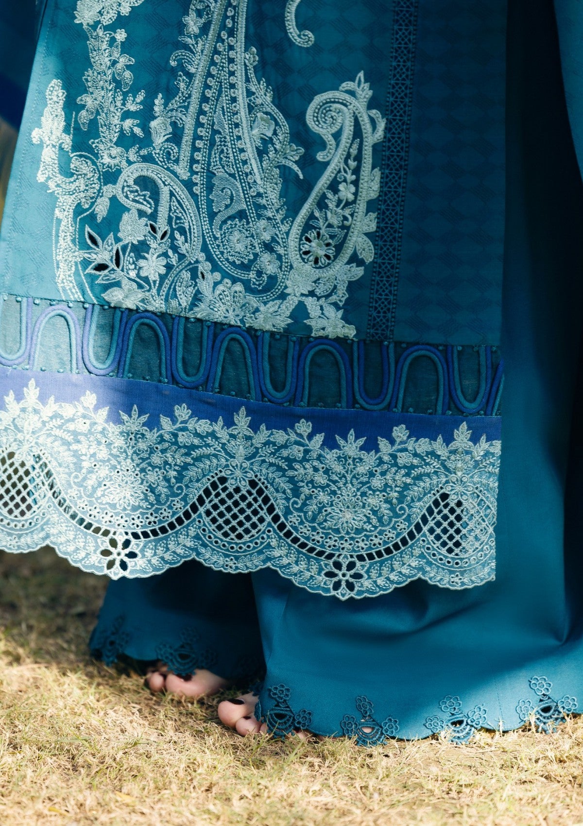 • Vivacious and feminine, Kashmiri is a mesmerizing 3-piece ensemble featuring a self-textured jacquard shirt in a rich teal green base, adorned with intricate Kashmiri tanka embroidery in a harmonious palette. Paired with plain dyed pants and a custom-woven jacquard shawl, this outfit celebrates antique craftsmanship, making women celebrate the heritage with a modern twist.
