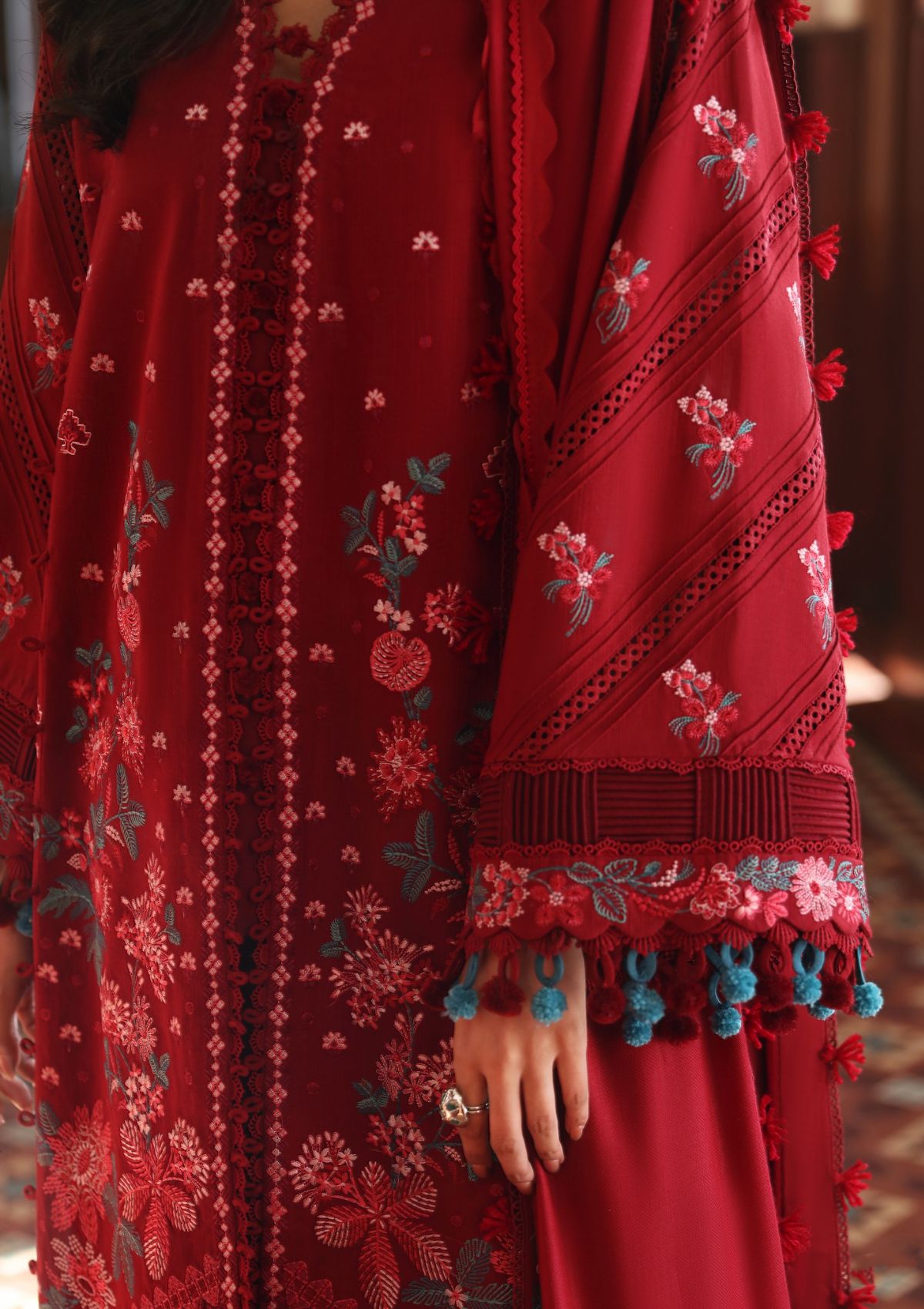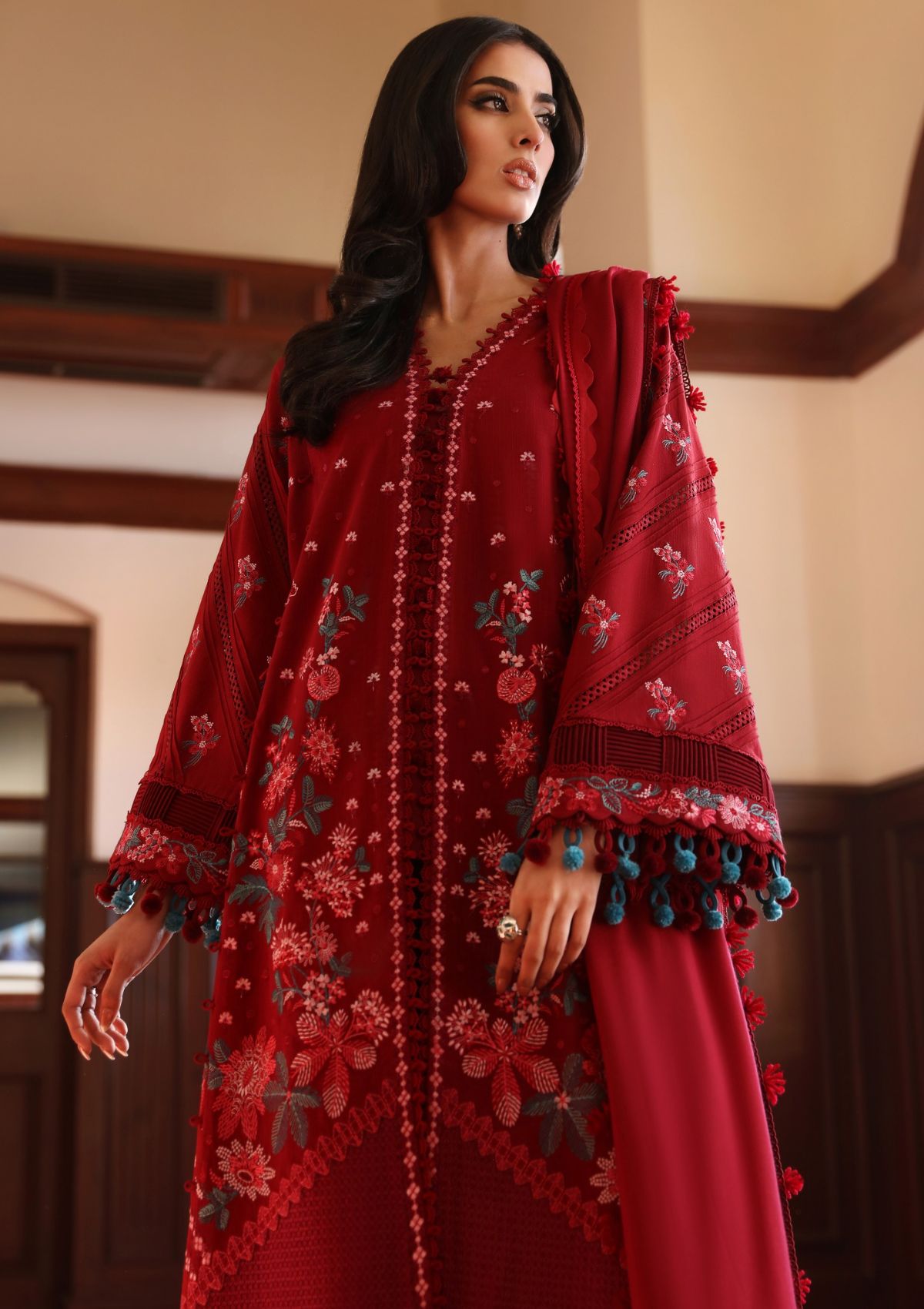 The beguiling interplay of coral, green, and red hues within this ensemble crafts a genuinely captivating silhouette. The design is adorned with exquisite detailing, featuring intricate floral and leafy patterns meticulously embroidered on rust khaddar fabric, adding a nuanced touch of elegance to the overall aesthetic. The impeccably coordinated printed floral pashmina shawl serves as the consummate finishing touch, elevating the ensemble to a pinnacle of refined sophistication.