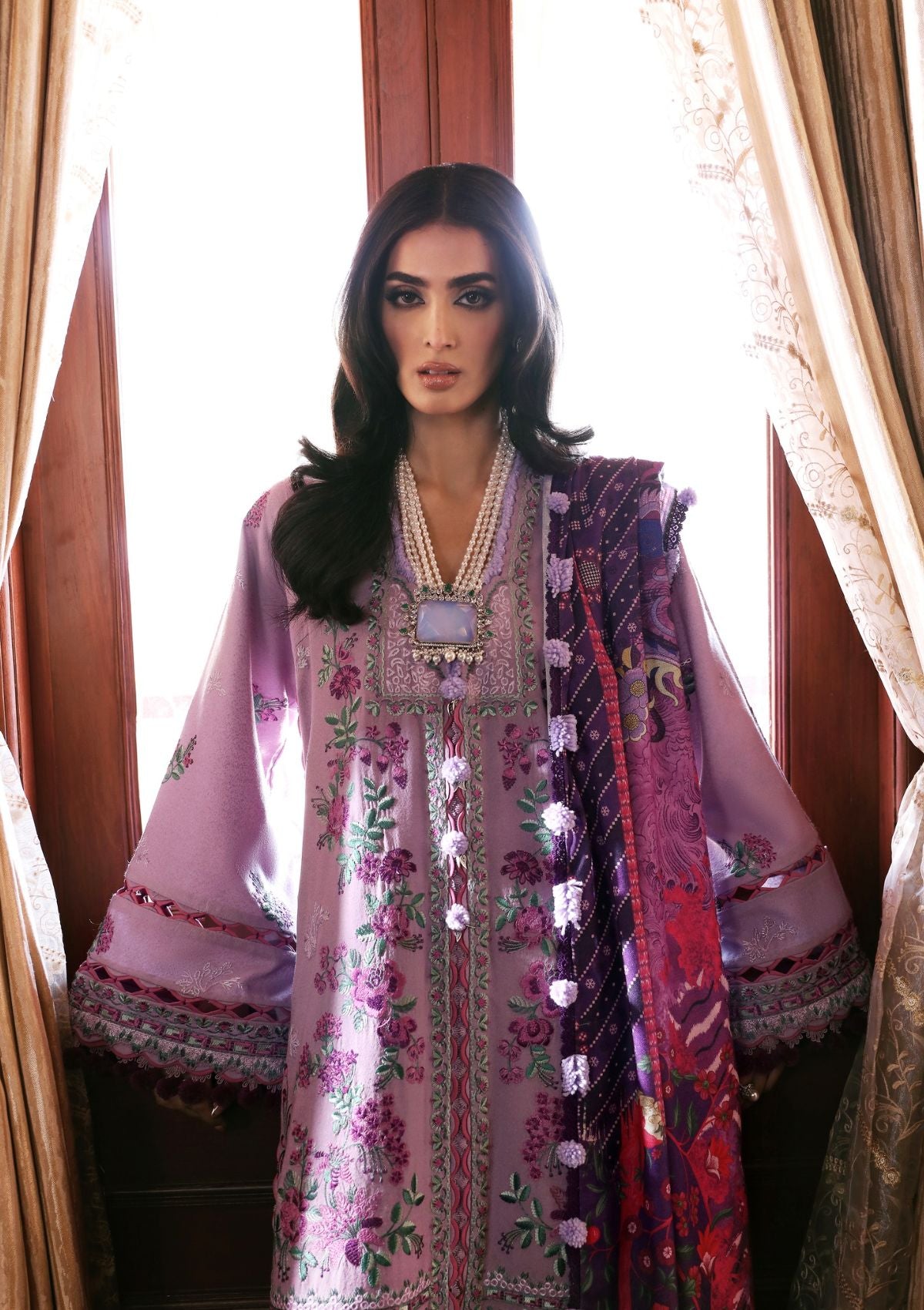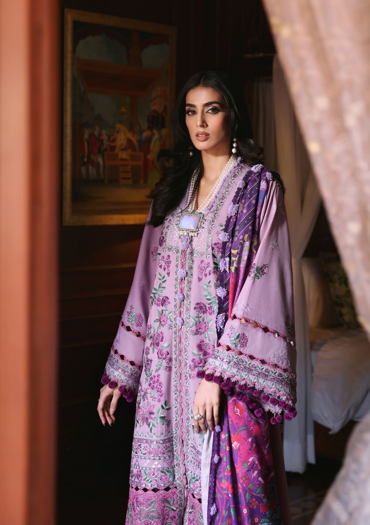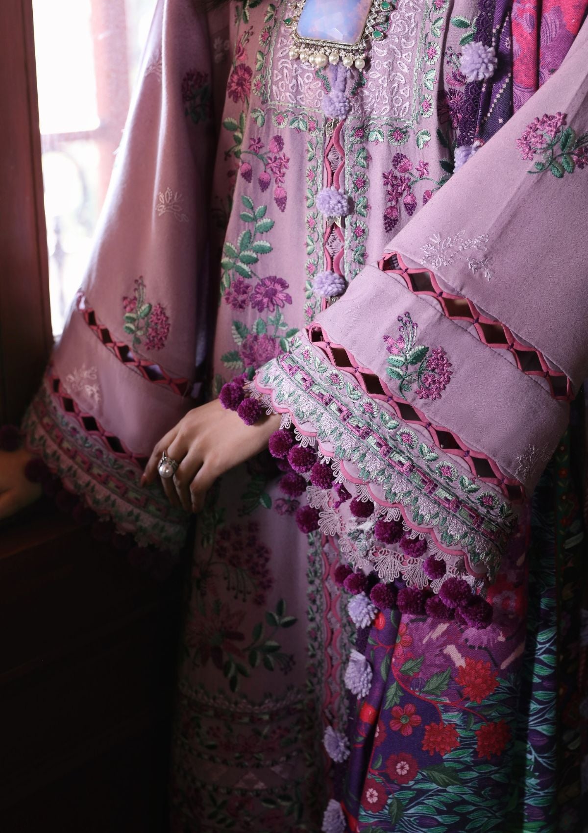 Crafted from a lilac karandi canvas, this two-paneled jacket is a work of art, intricately designed with floral bunches, leaves, and swirling vines. The shirt is adorned with multiple killim borders, complemented by chain stitch and satin stitches. The ensemble is completed with a printed acrylic shawl featuring hues of pinks and lilacs, adorned with geometric and leafy elements that further enhance the overall beauty of the design.