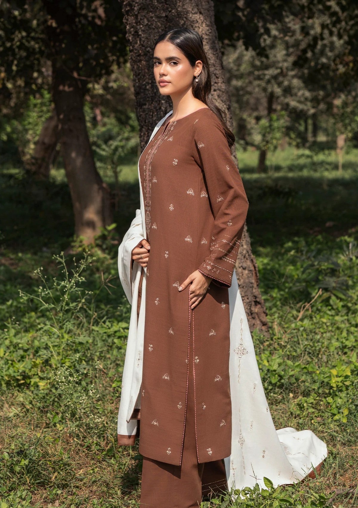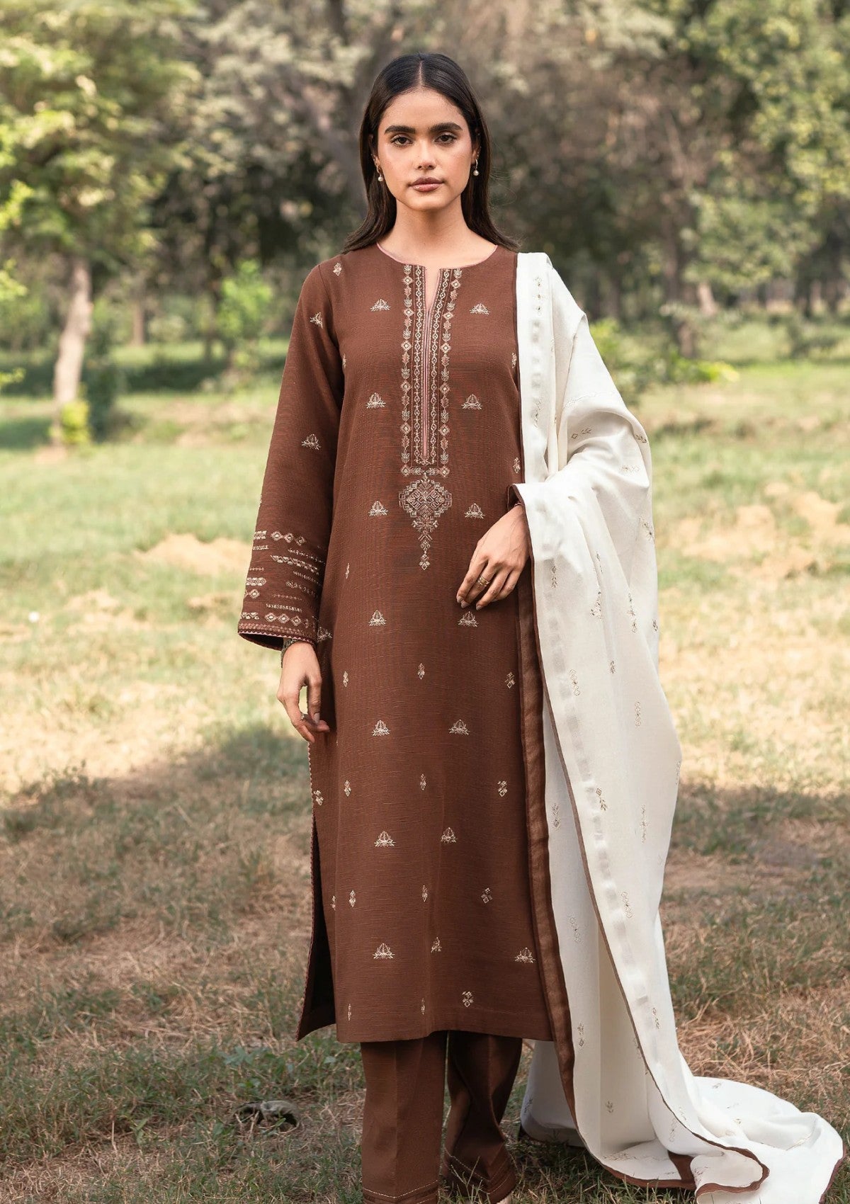 Unveil your inner elegance with Dusky. This rich brown khaddar slub ensemble combines ethnic and geometric embroidery for a bold statement. From the front and back embroidered spray to the intricately detailed blended shawl, every stitch tells a story of craftsmanship and grace.