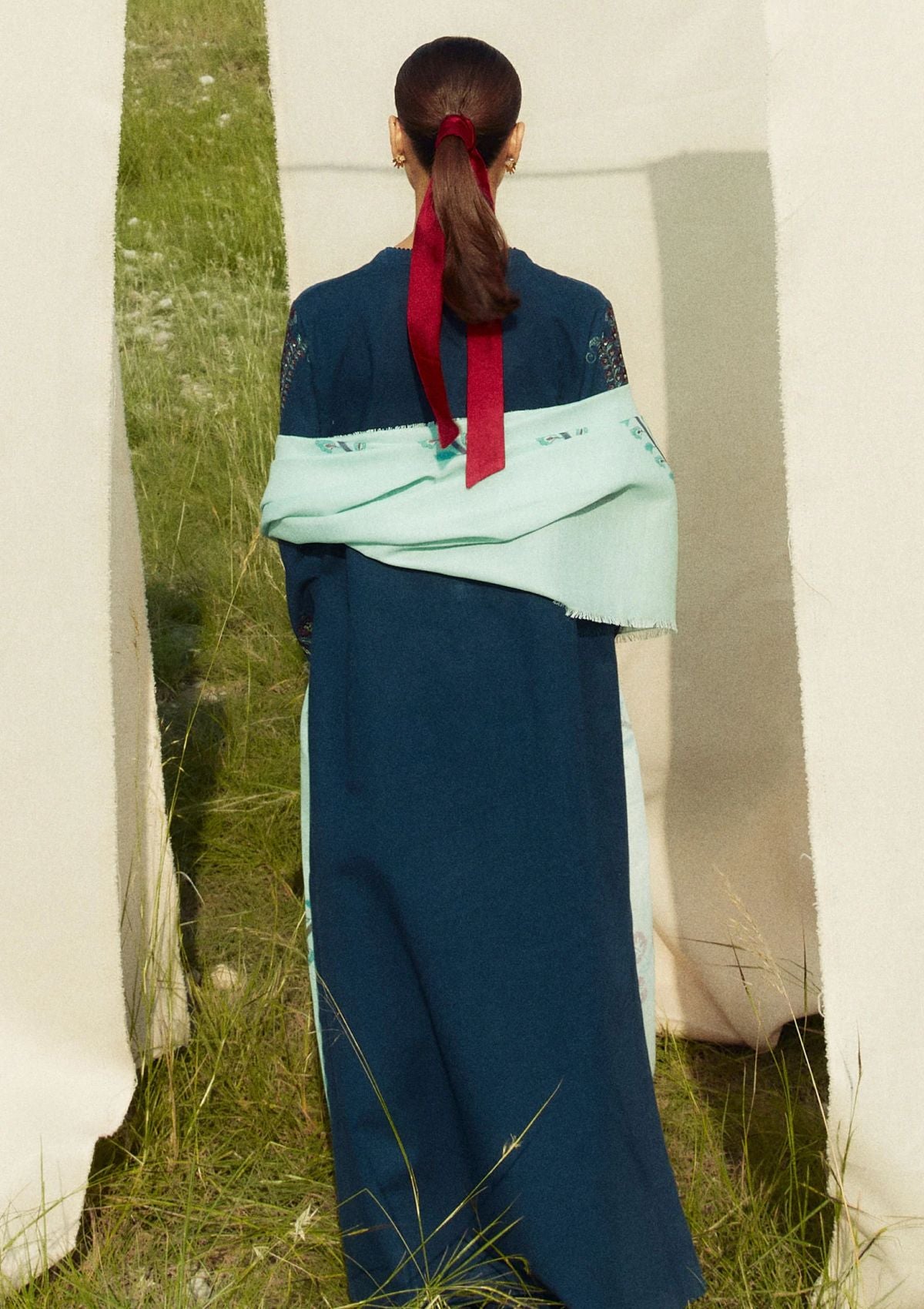 A navy blue shirt adorned with dori work adds an ethnic touch to your wardrobe . Paired with solid pants and a printed shawl, this ensemble is perfect to keep you warm and cozy.