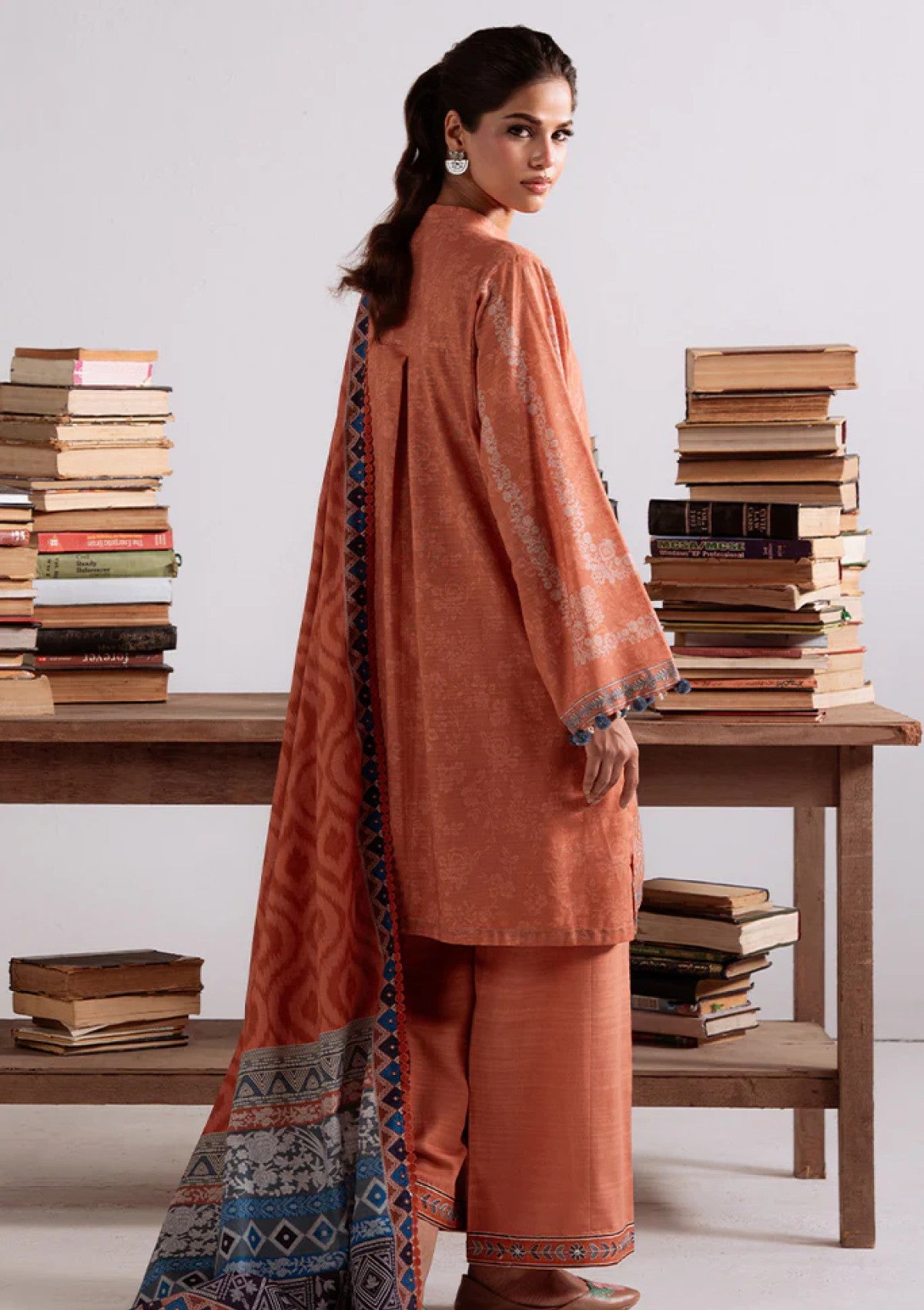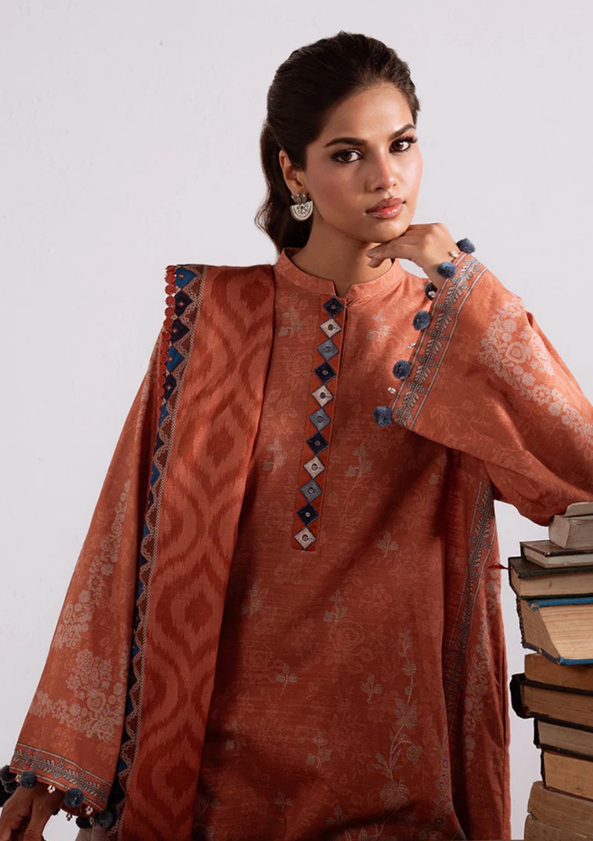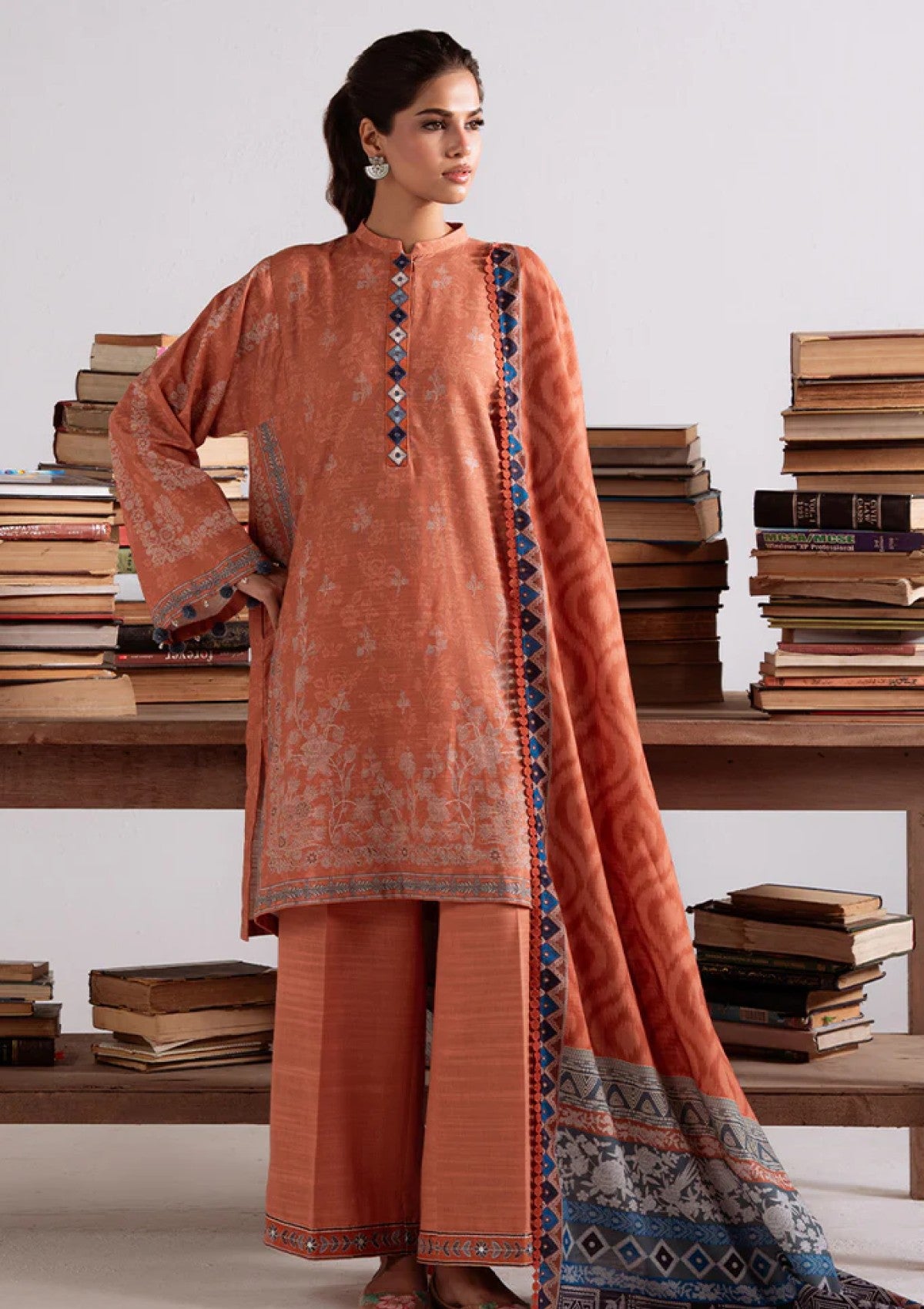 Discover the AMBER MIRAGE 3PC Khaddar Printed set, crafted for elegance and comfort. The shirt features a 40" embroidered patti along the placket, enhancing its traditional charm. Paired with a khaddar dyed trouser adorned with a 60" embroidered patti, this combination ensures a refined look. Completing the set, the khaddar printed dupatta adds a graceful touch. Ideal for cooler weather, this ensemble blends classic craftsmanship with contemporary style, offering durability and a distinguished appearance.