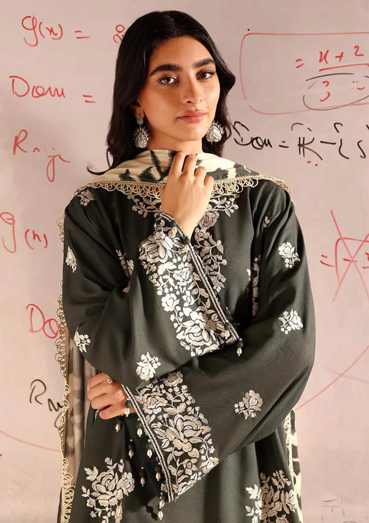 This Vintage Gray 3-piece linen embroidered suit blends classic elegance with refined craftsmanship. The shirt features intricate embroidery on the front and sleeves, complemented by a dyed back for contrast. An 80-inch embroidered patti enhances the hem, adding a graceful finish. The matching linen trousers are dyed to maintain a cohesive look. Completing the ensemble, the staple woolen printed dupatta offers a delicate touch, making this suit an ideal choice for sophisticated occasions.