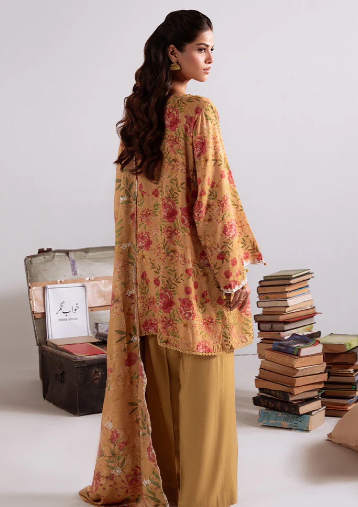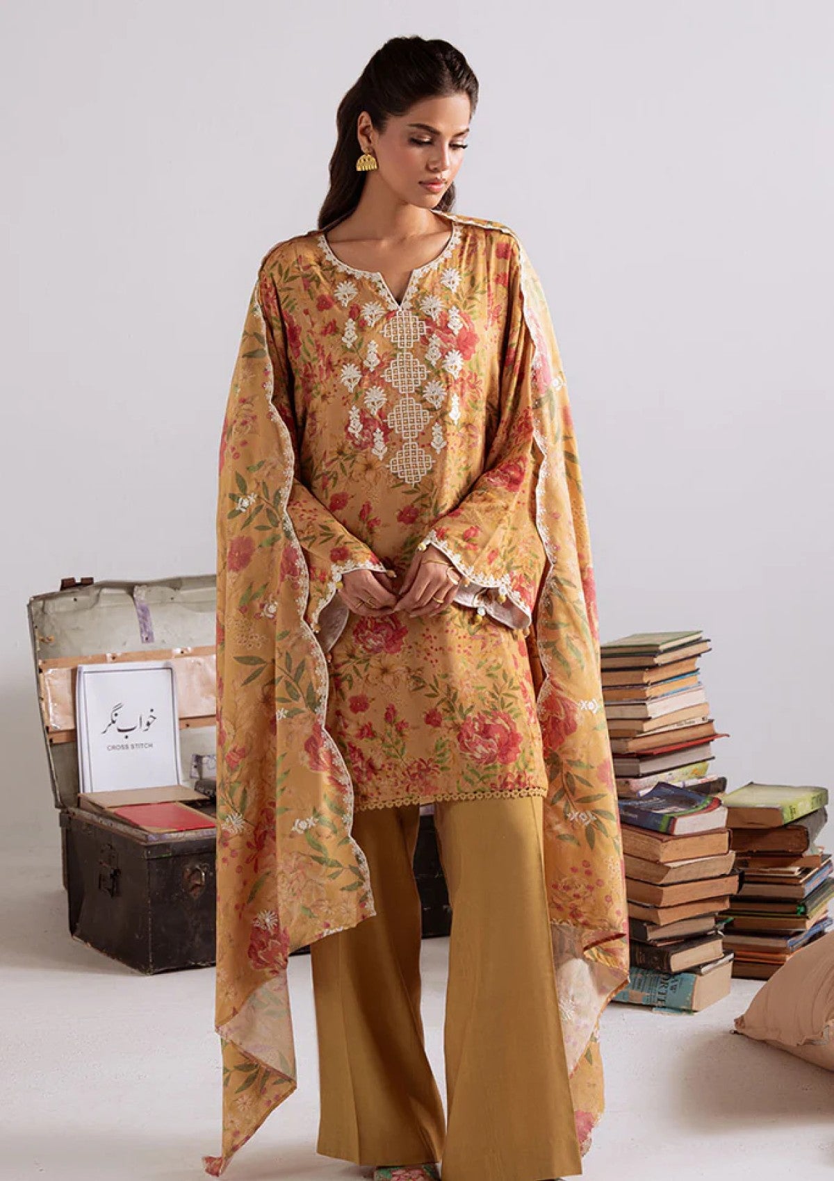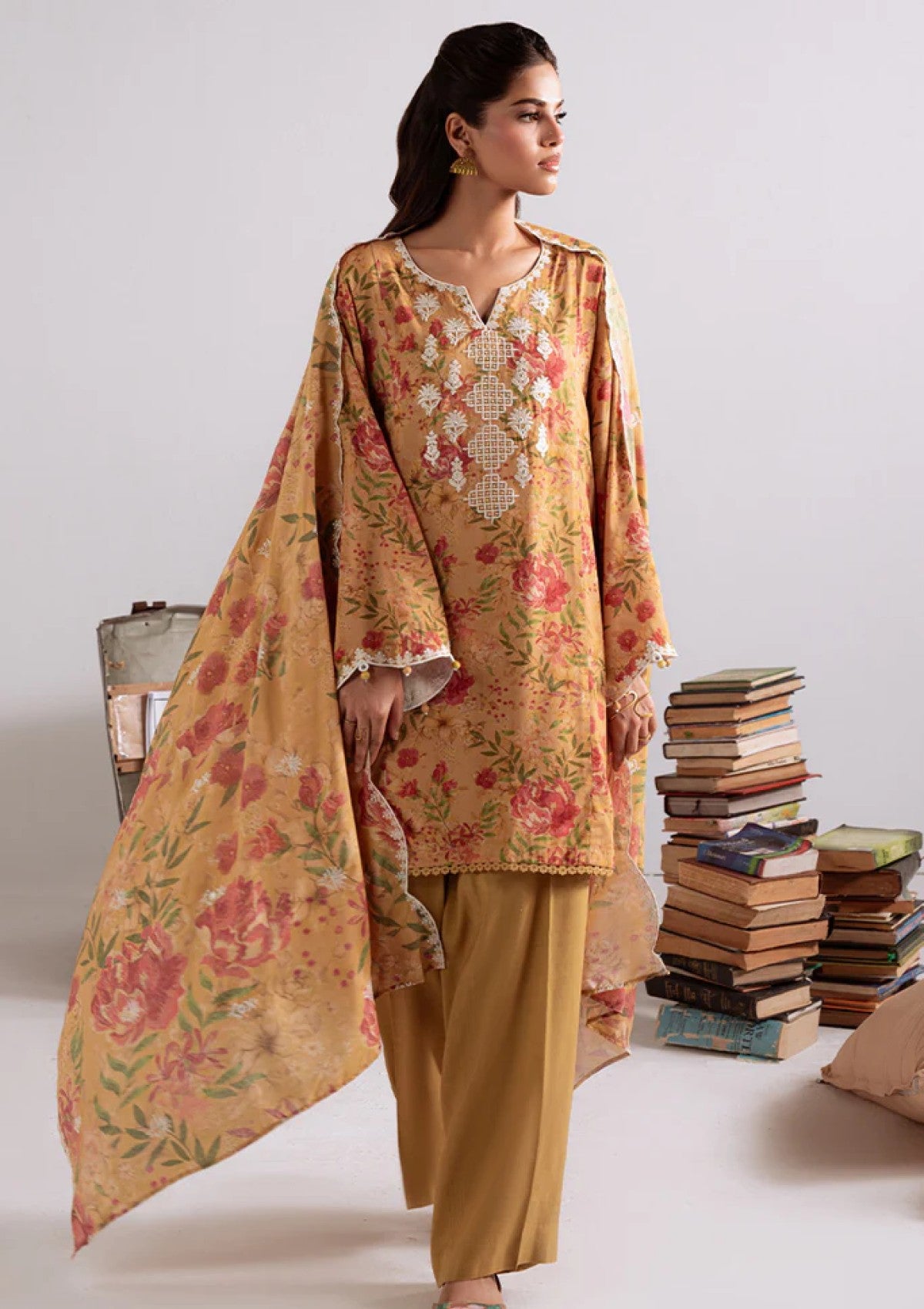 This Mustard Orchid 3PC Linen Printed Suit features a finely embroidered neckline and 40-inch embroidered patti detailing on the sleeves, enhancing its elegant design. The accompanying linen-dyed trousers offer comfort and a refined finish, while the net printed and embroidered dupatta adds a delicate, stylish touch, perfect for a sophisticated and polished look.