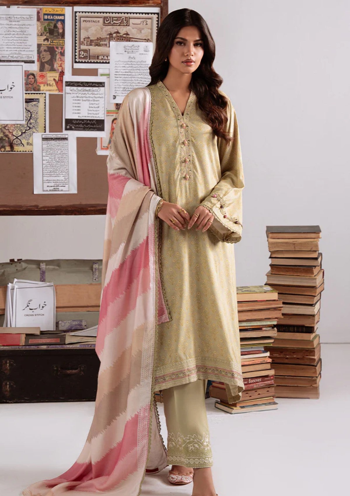 This Sage Garland 3-piece linen printed suit combines elegance and intricate craftsmanship. The shirt features a 40" embroidered patti on both the placket and hem, enhancing its refined look. Paired with dyed linen trousers accentuated by a 60" embroidered patti, this ensemble balances comfort and sophistication. The net printed dupatta completes the set with a delicate finish, making it an ideal choice for those seeking a luxurious yet breathable outfit.
