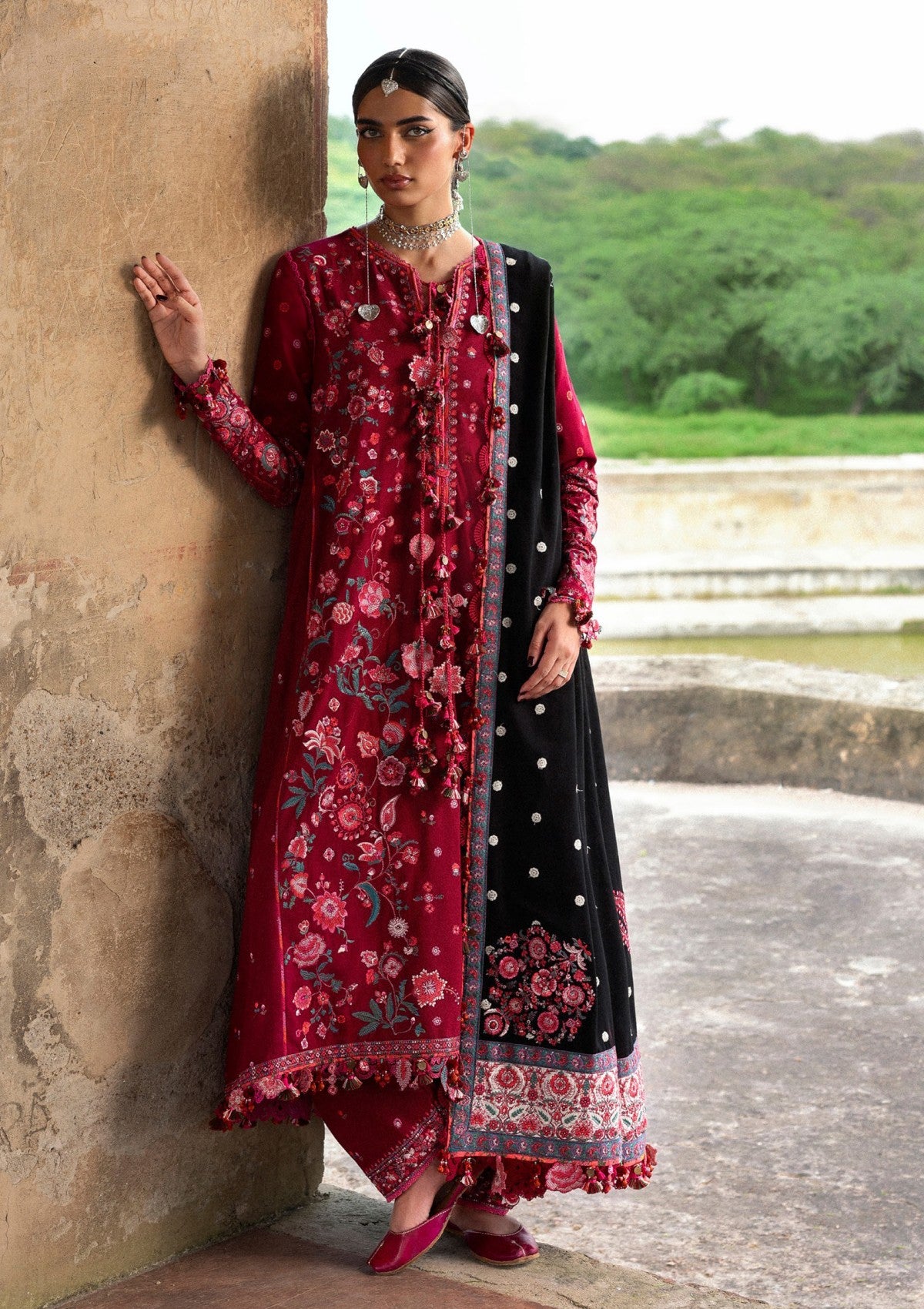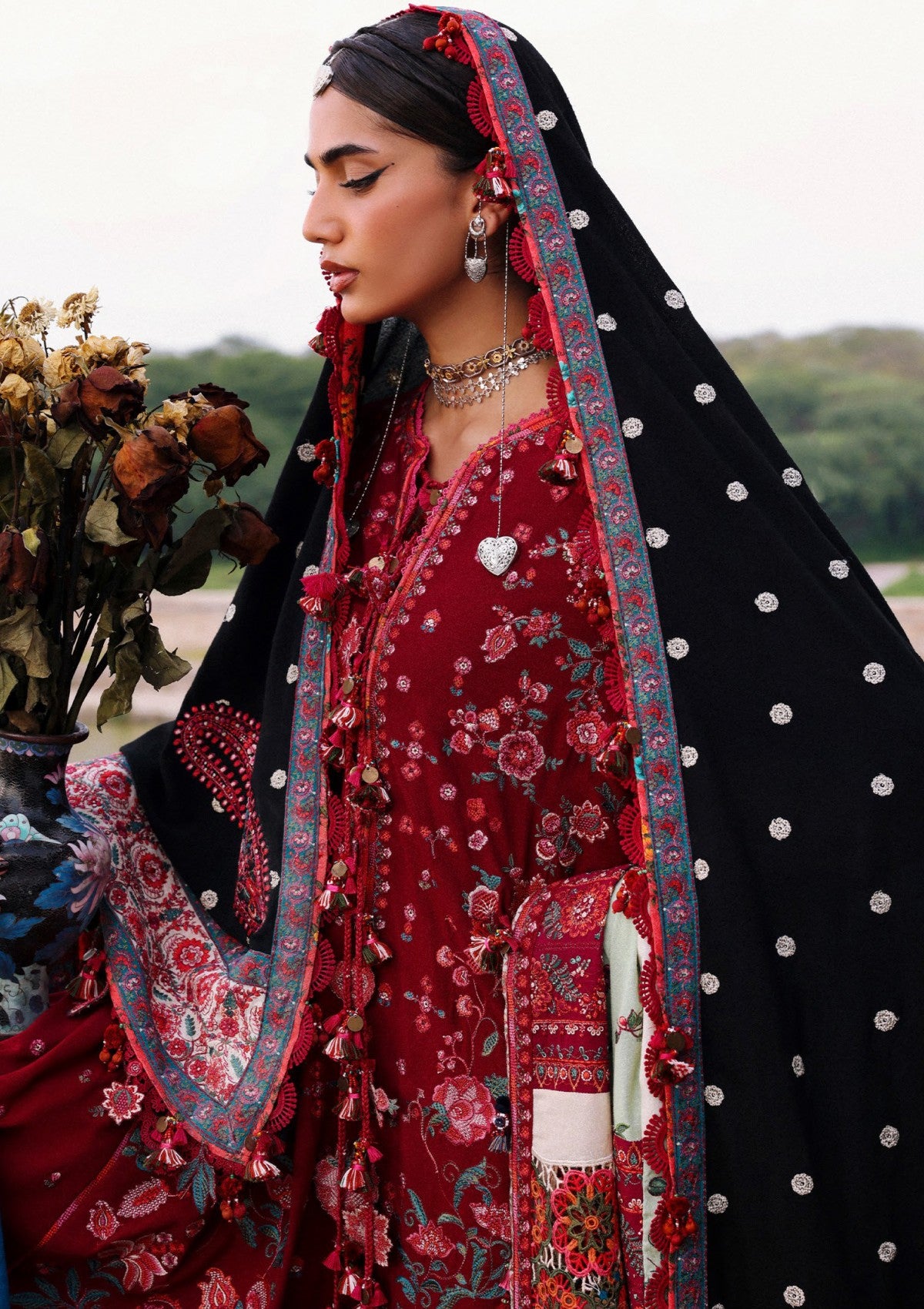 A vision of unparalleled elegance, this unstitched wine red ensemble offers a sophisticated elevation of the classic karandi silhouette. The shirt is beautifully embellished with delicate embroidery details. It is flawlessly complemented by a contrasting black embroidered karandi shawl, which features an eye-catching ivory border patch and is finished with a teal embroidery patti along all four sides. The outfit is completed with a matching wine red shalwar enhanced with tasteful embroidery accents, crafting an attire that exudes effortless grace.