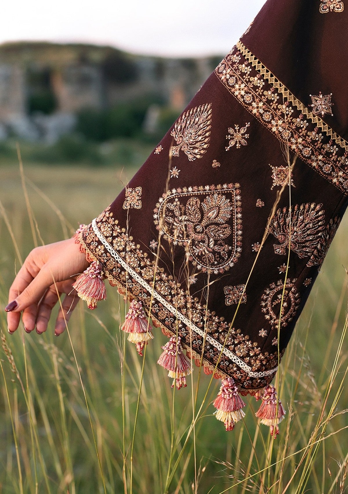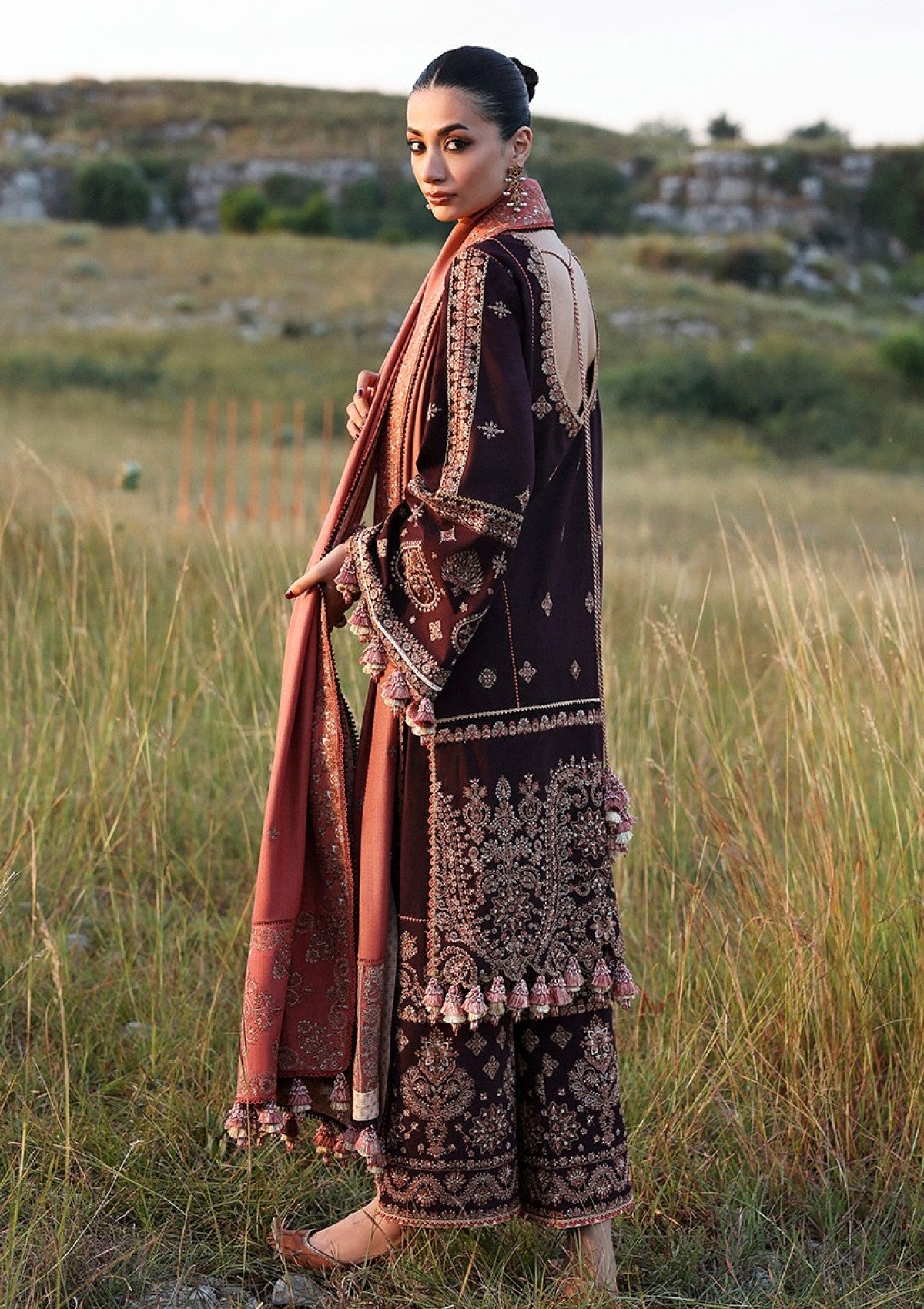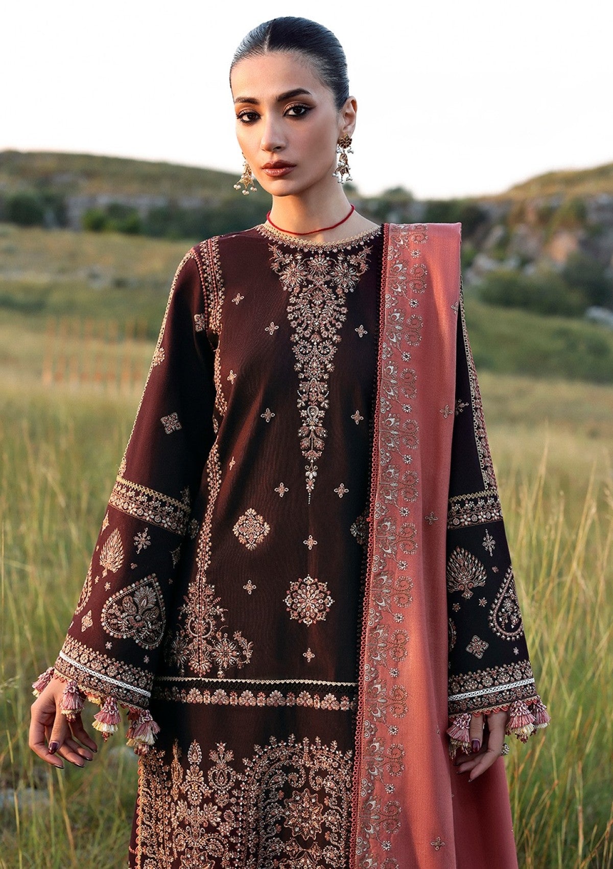 A perfect blend of modern charm and winter elegance — this mid-length brown khaddar shirt features a chic V-shaped embroidered neckline with ornate motif spray across the panels, enhanced by a bold, intricately embroidered hem and richly detailed sleeves. Paired with fully embroidered culottes and a contrasting peach wool shawl adorned with exquisite embroidery and a heavy pallu, this ensemble exudes warmth, sophistication, and contemporary grace.