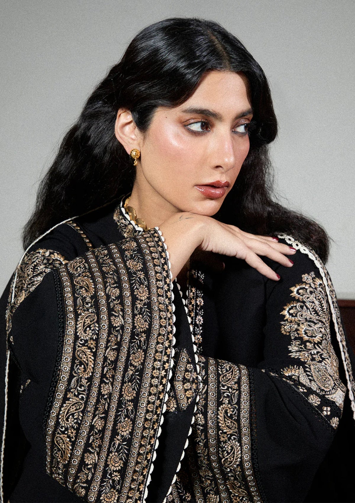 This ensemble features a black shirt exquisitely adorned with intricate monochrome Kashmiri embroidery, reflecting refined craftsmanship and timeless elegance. The sleeves mirror the detailed embroidery, adding harmony to the design. Matching black shalwar carries the same elegant motifs, creating a cohesive and sophisticated silhouette. Completing the ensemble, a monochrome Kashmiri embroidered shawl drapes gracefully, adding texture, depth, and a classical, regal charm to the traditional attire.