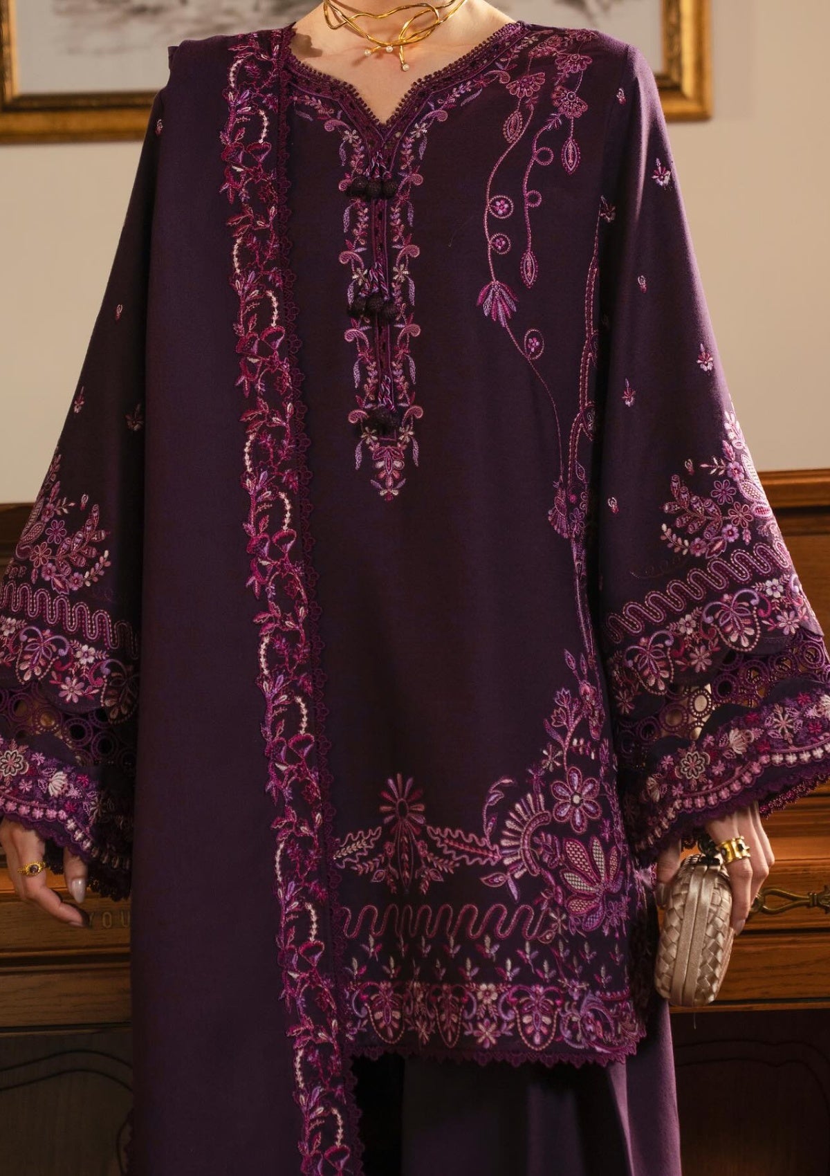 Step into effortless elegance with this rich plum karandi ensemble, featuring a short shirt with a graceful round daman, adorned with intricate self-tone embroidery for a subtle yet sophisticated appeal. The look is paired with a beautifully embroidered farshi shalwar, adding traditional charm and gentle volume to the silhouette. A coordinating karandi embroidered dupatta completes the outfit, making it an ideal choice for refined winter soirées or intimate festive gatherings.