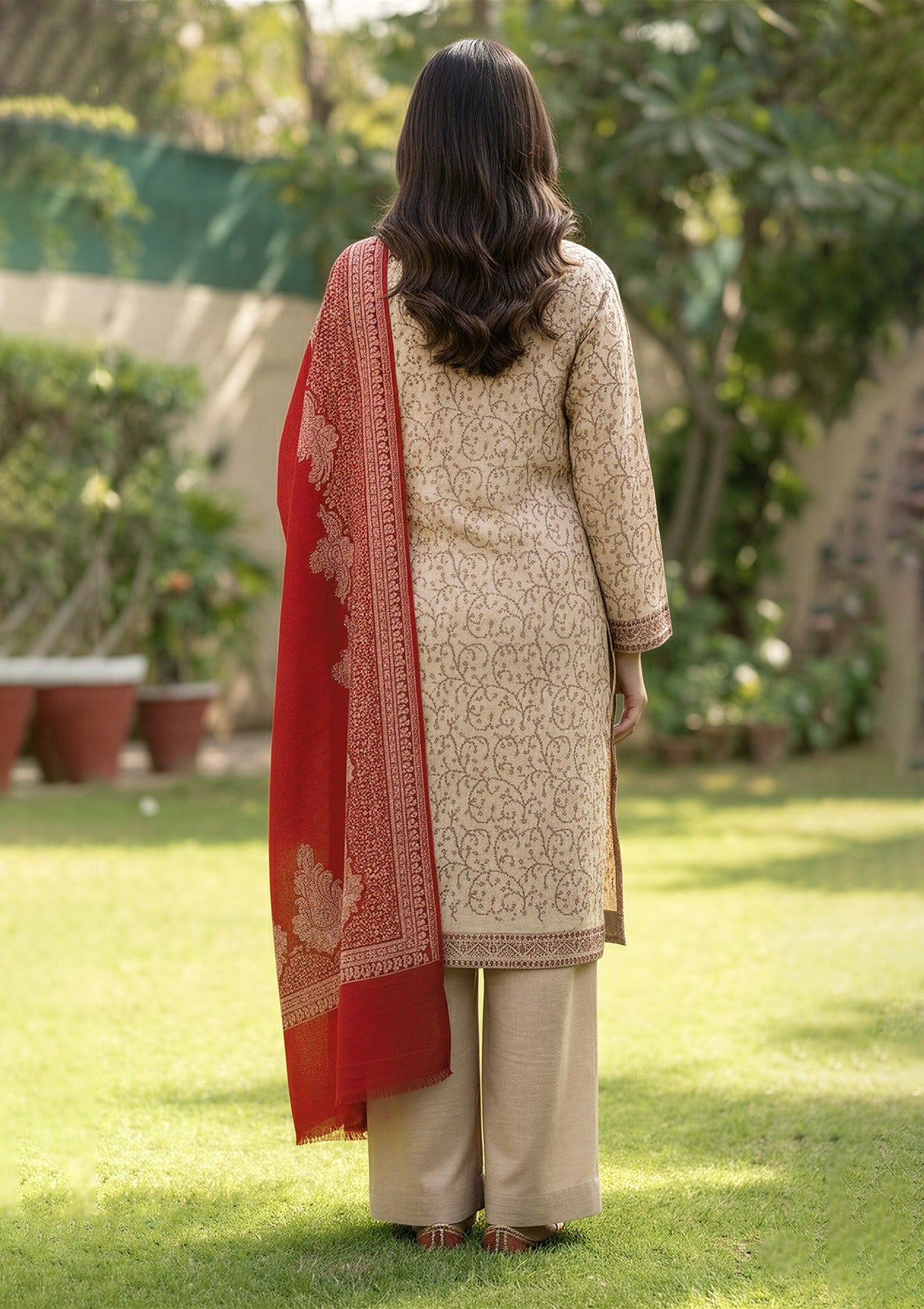 Winter - Riwaj - Pashmina Embroidered Suit - Premium 25 - D#01 - Fawn