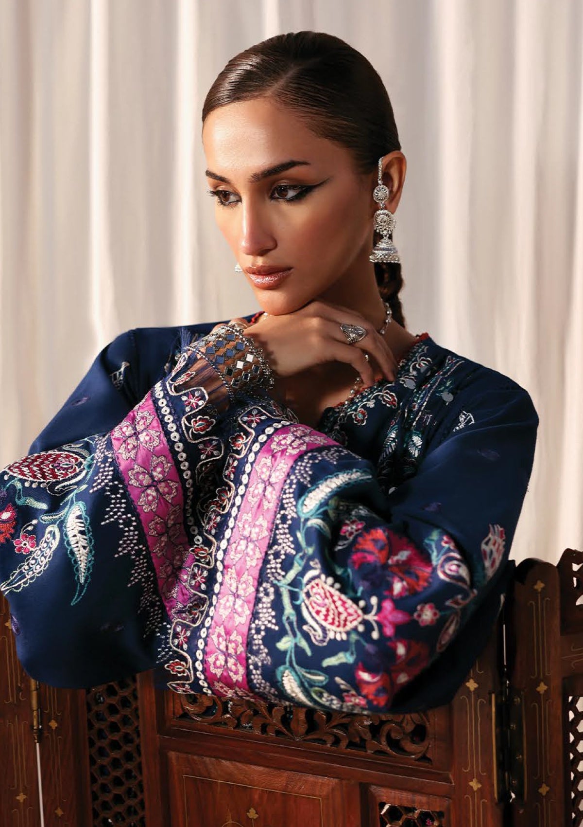 Navy Blue khaddar shirt features Turkish embroidery motifs set in a striking palette of pinks and lavenders. Paired with a matching trouser and shawl framed with a beautifully scalloped embroidered border to elevate the look.