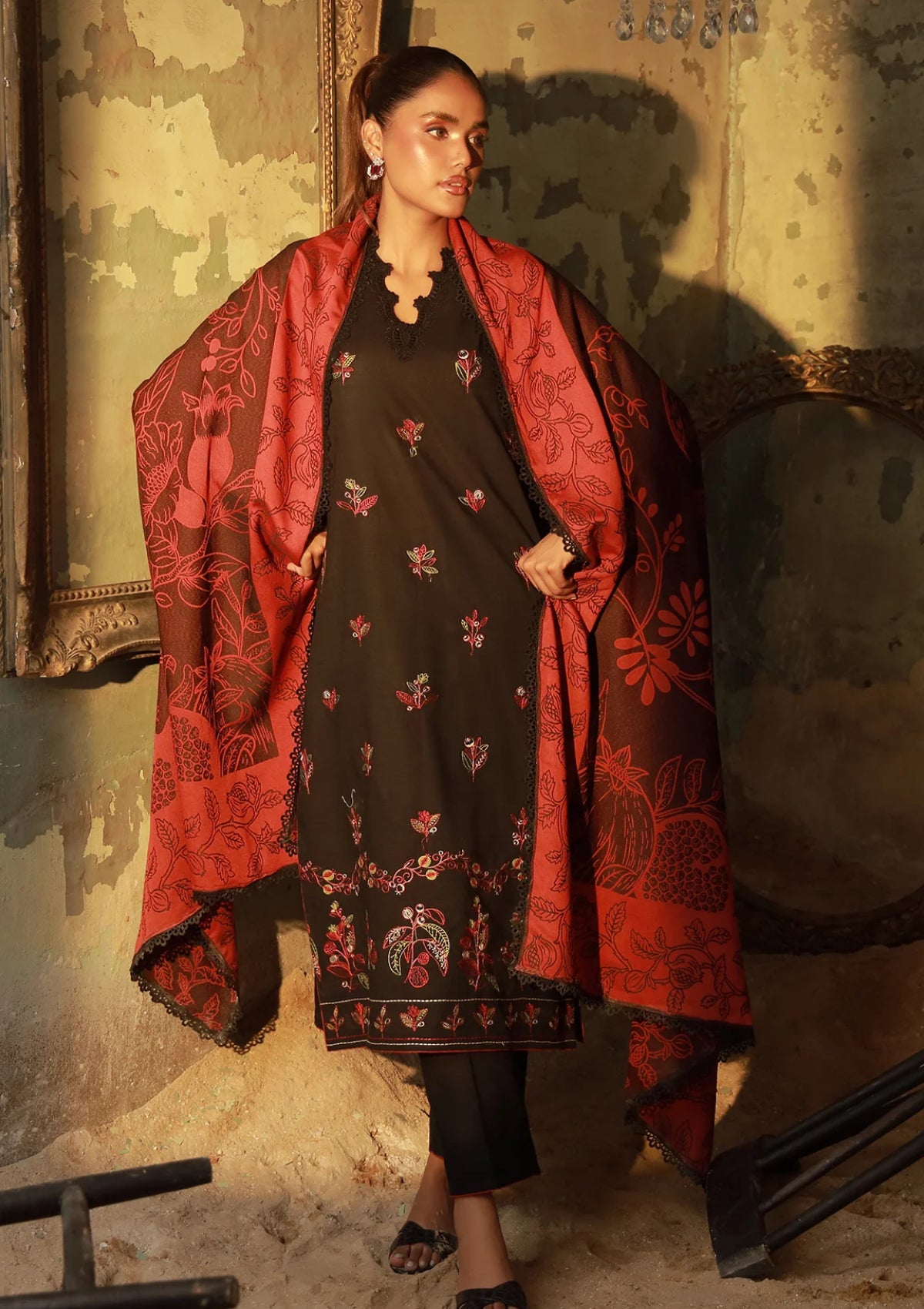 A black long shirt adorned with pomegranate-themed embroidery in rich crimson and olive accents. Paired with a rust-colored shawl featuring matching motifs, the outfit blends earthy warmth with elegant detailing.