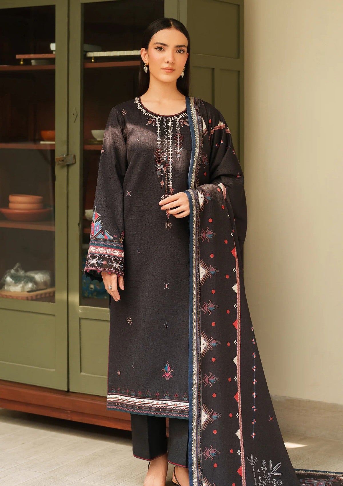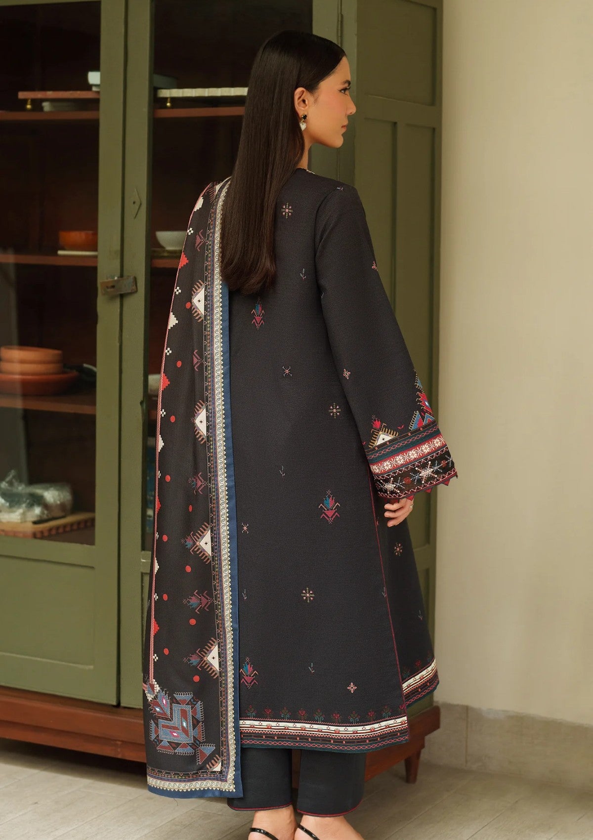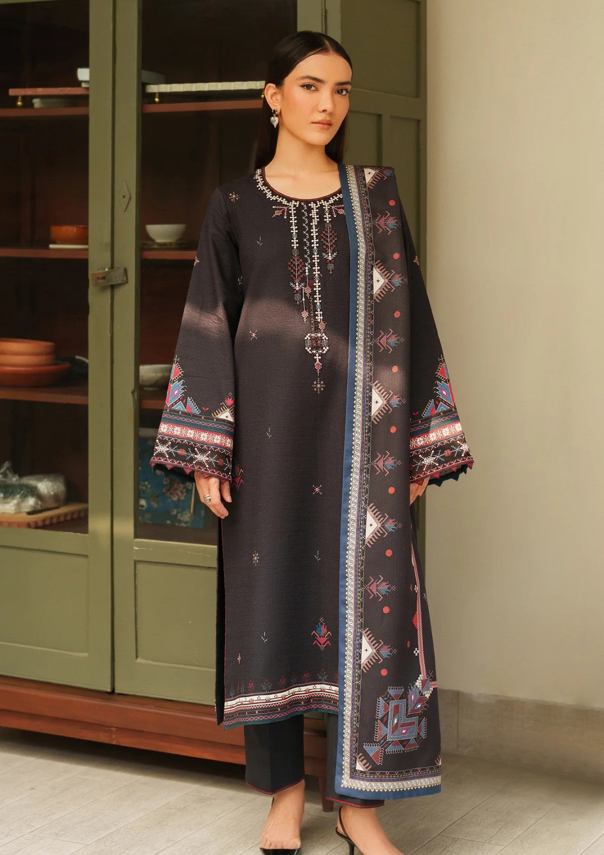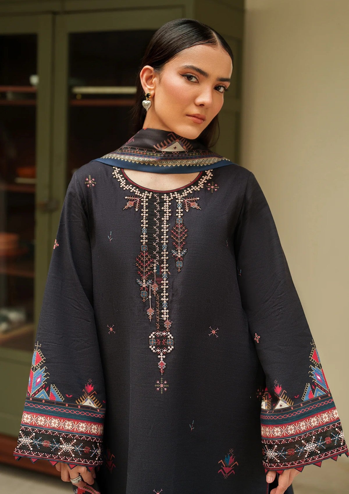 A charcoal black slub khaddar ensemble beautifully embroidered along the neckline and sleeves with fine threadwork in crimson and ivory. The plain trouser provides a refined contrast, while the printed blended shawl dupatta ties the look together with artisanal charm. Perfect for winter days that call for quiet sophistication and timeless grace.