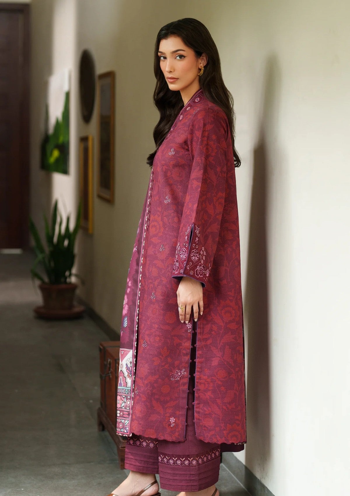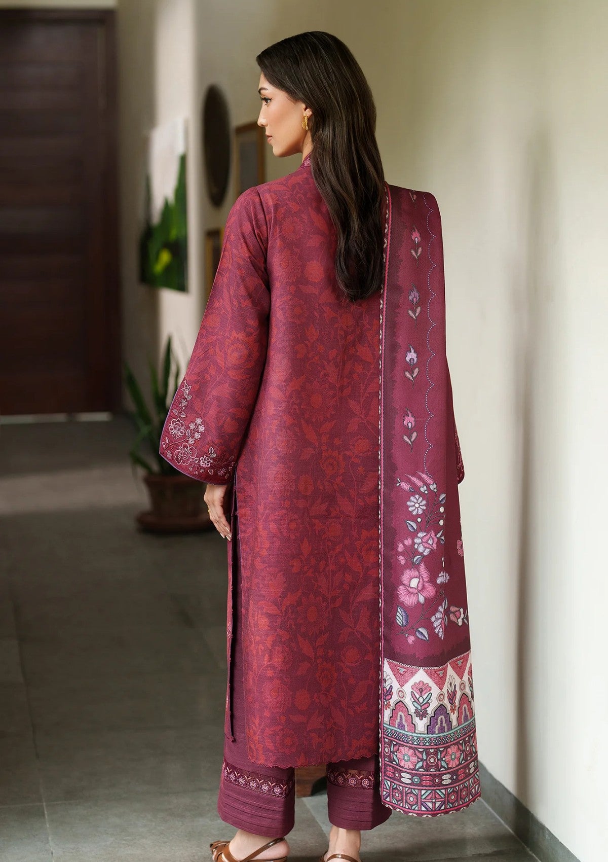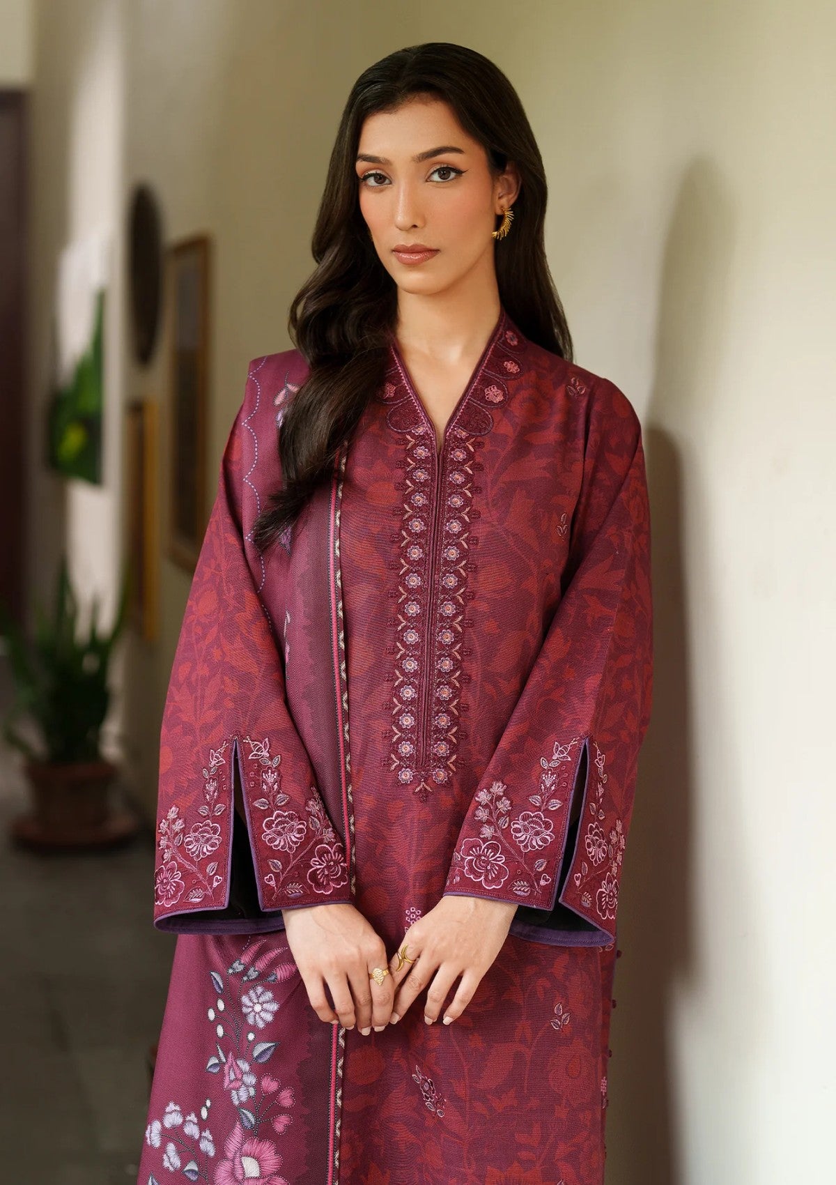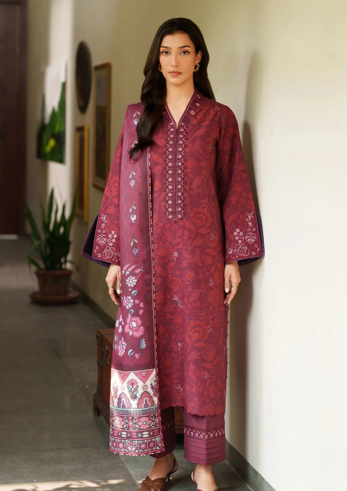A three-piece slub khaddar ensemble in a maroon hue, designed for refined winter elegance. The shirt showcases intricate thread embroidery along the neckline, complemented by scattered embroidered motifs across the front and delicate embroidery on the sleeves. Paired with plain khaddar trousers featuring embroidered hems, it embodies timeless detailing. The look is finished with a blended shawl, beautifully printed with intricate patterns, bringing together artistry and modern poise.
