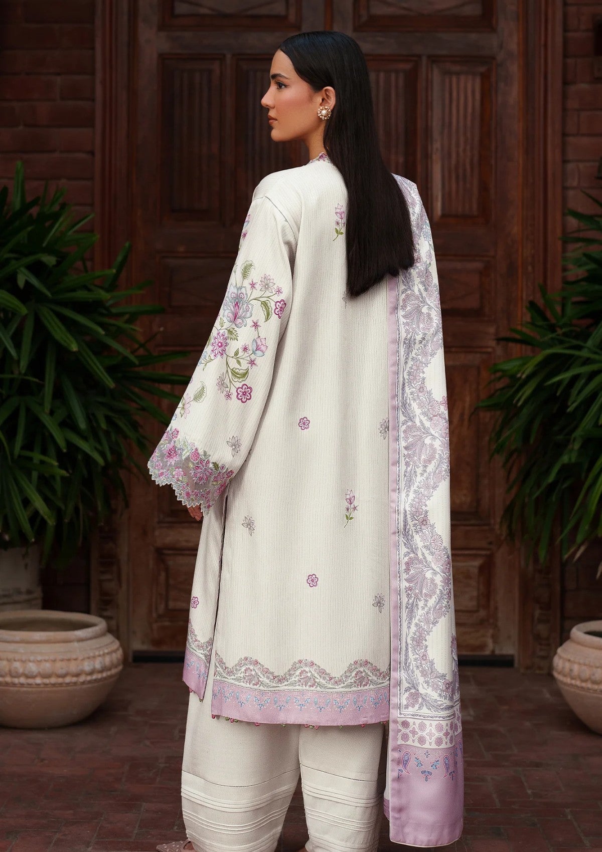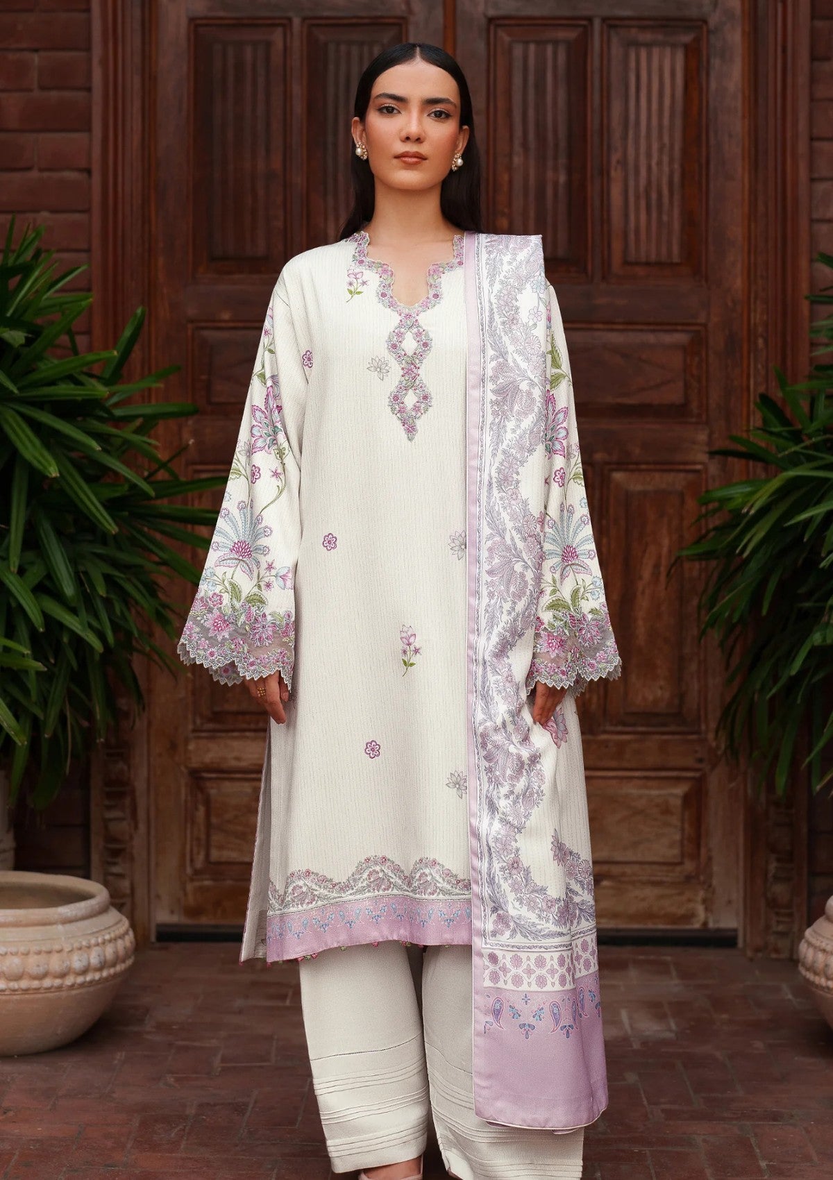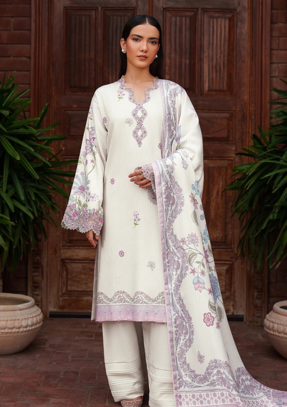 Serelle captures the essence of delicate femininity in soft ivory cottel. The shirt is adorned with fine thread embroidery along the neckline and sleeves, blooming with pastel floral motifs in pink and lilac for a whisper of romantic charm. Paired with a plain trouser and a printed blended shawl enriched with botanical artistry, it reflects refined grace and timeless allure — a perfect ode to understated elegance.